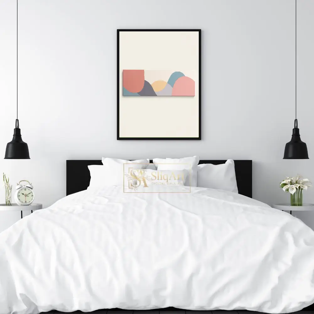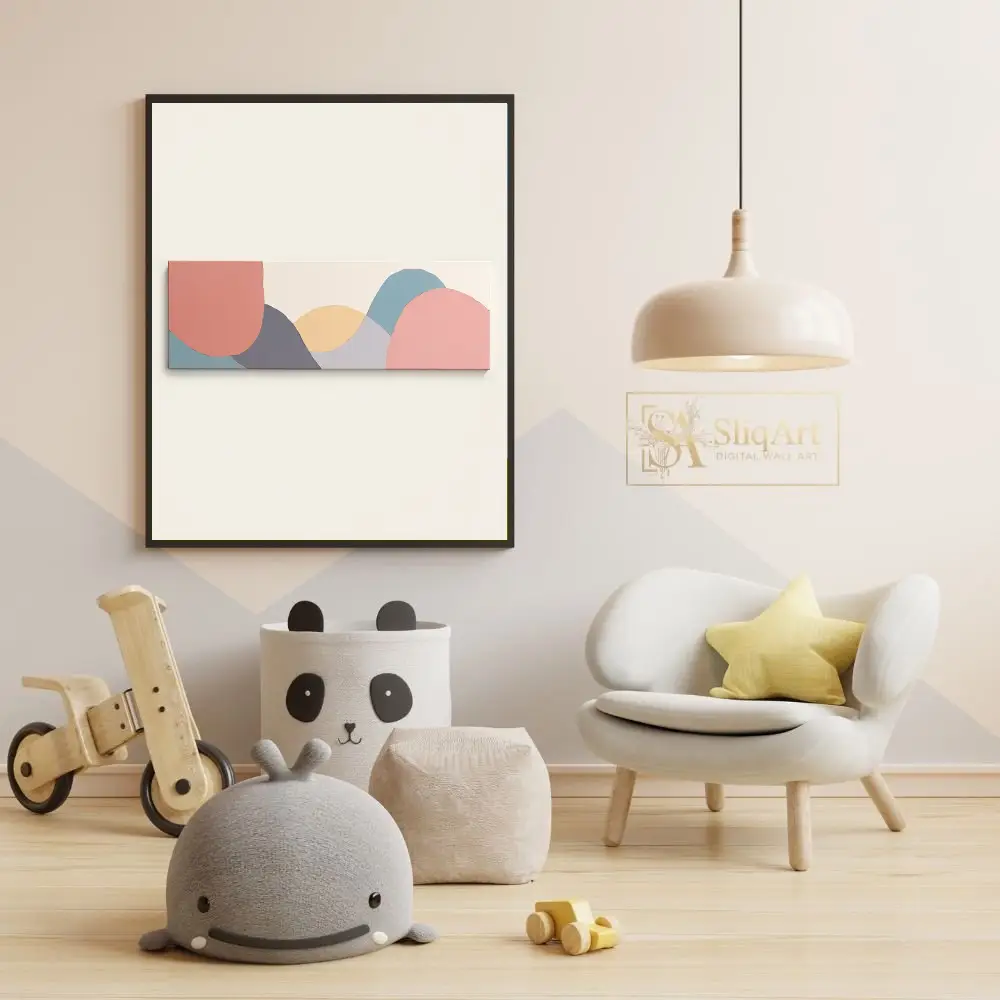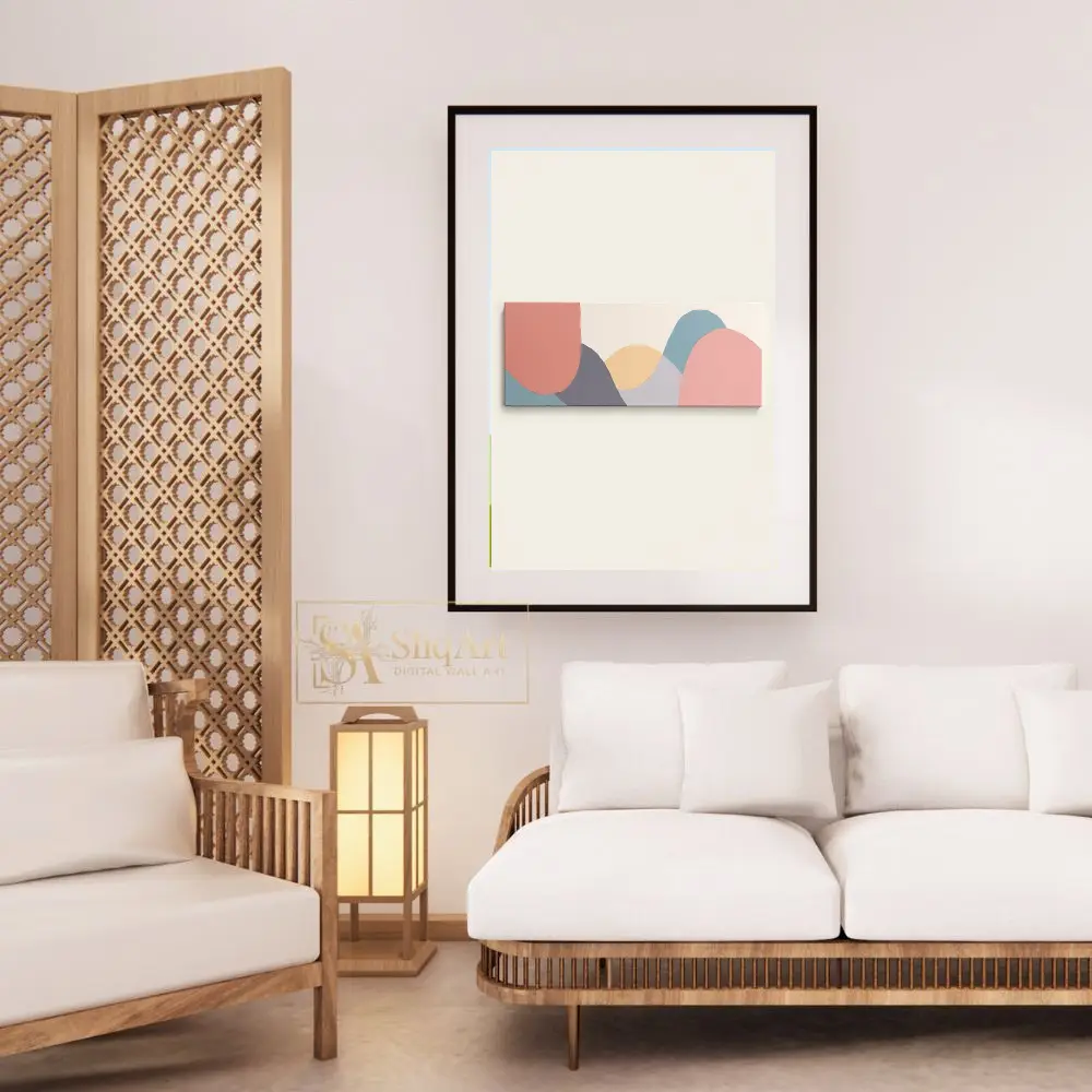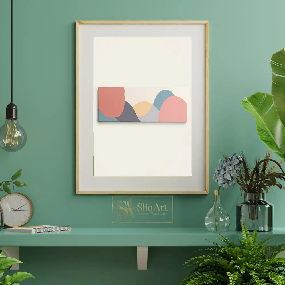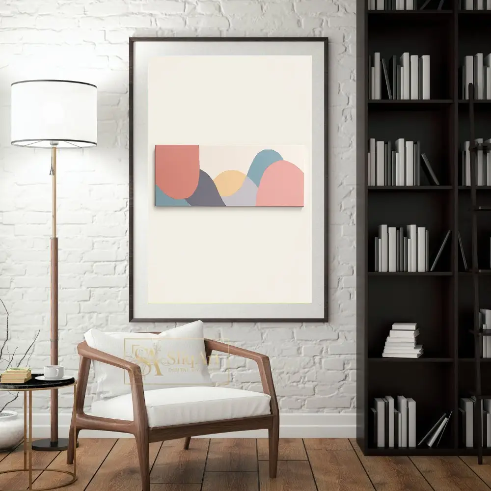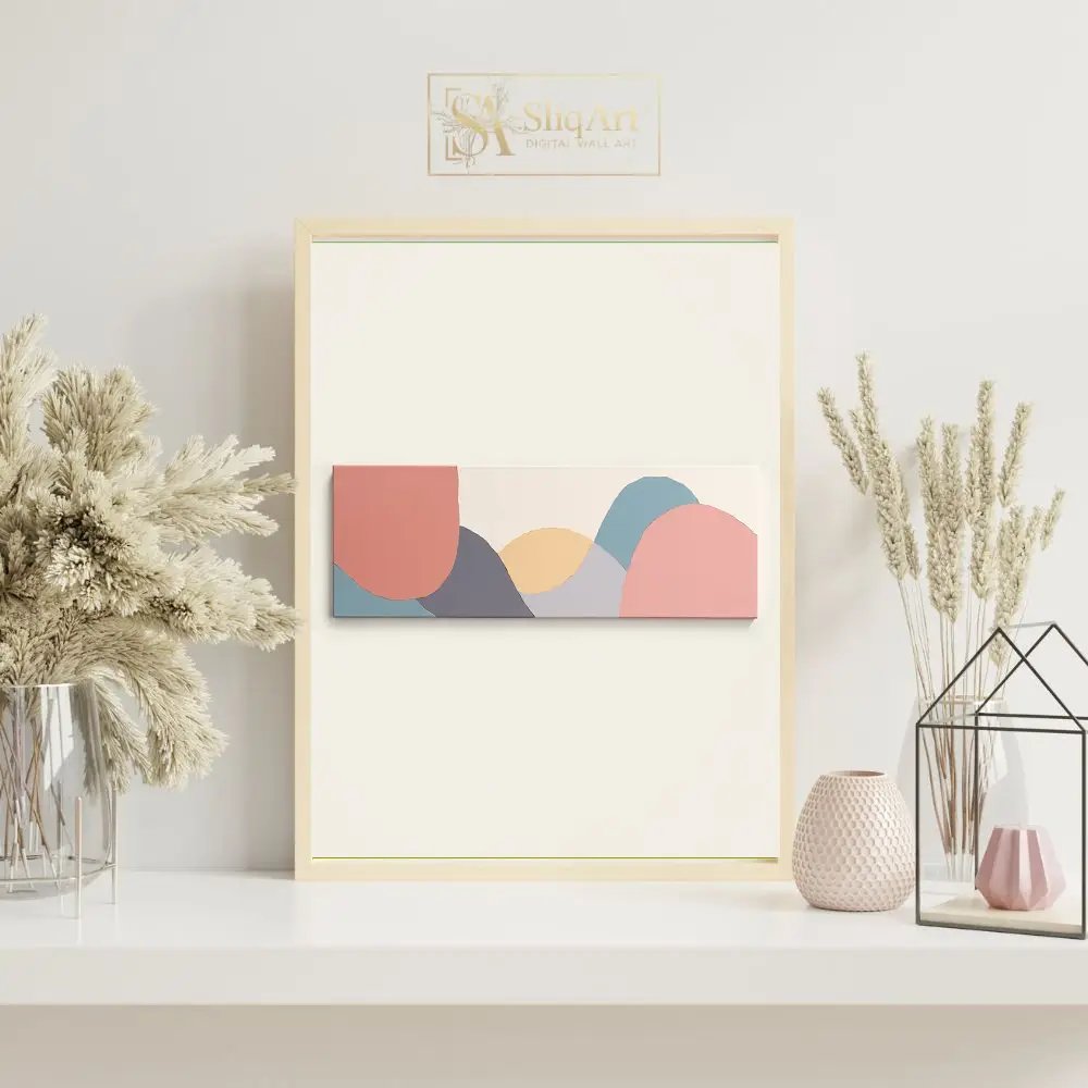 The minimalist composition uses a sophisticated palette of dusty rose, slate blue, and muted ochre to create a sense of calm and balance. Its elongated horizontal format makes it an ideal statement piece for over a sofa or headboard, bringing a touch of modern elegance and tranquil energy to any contemporary space.