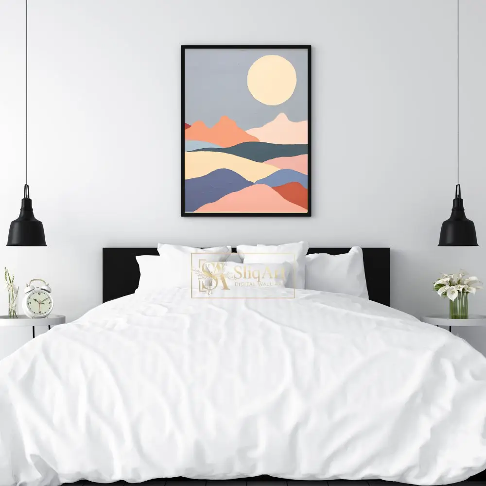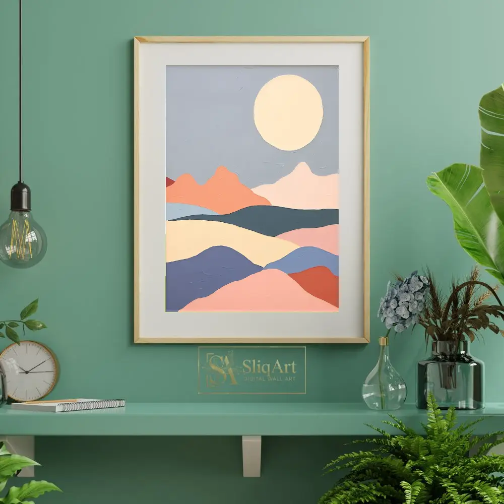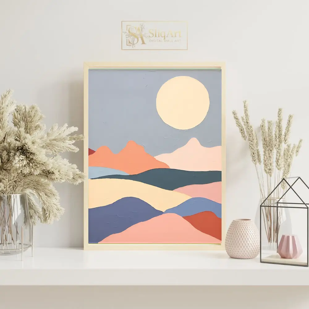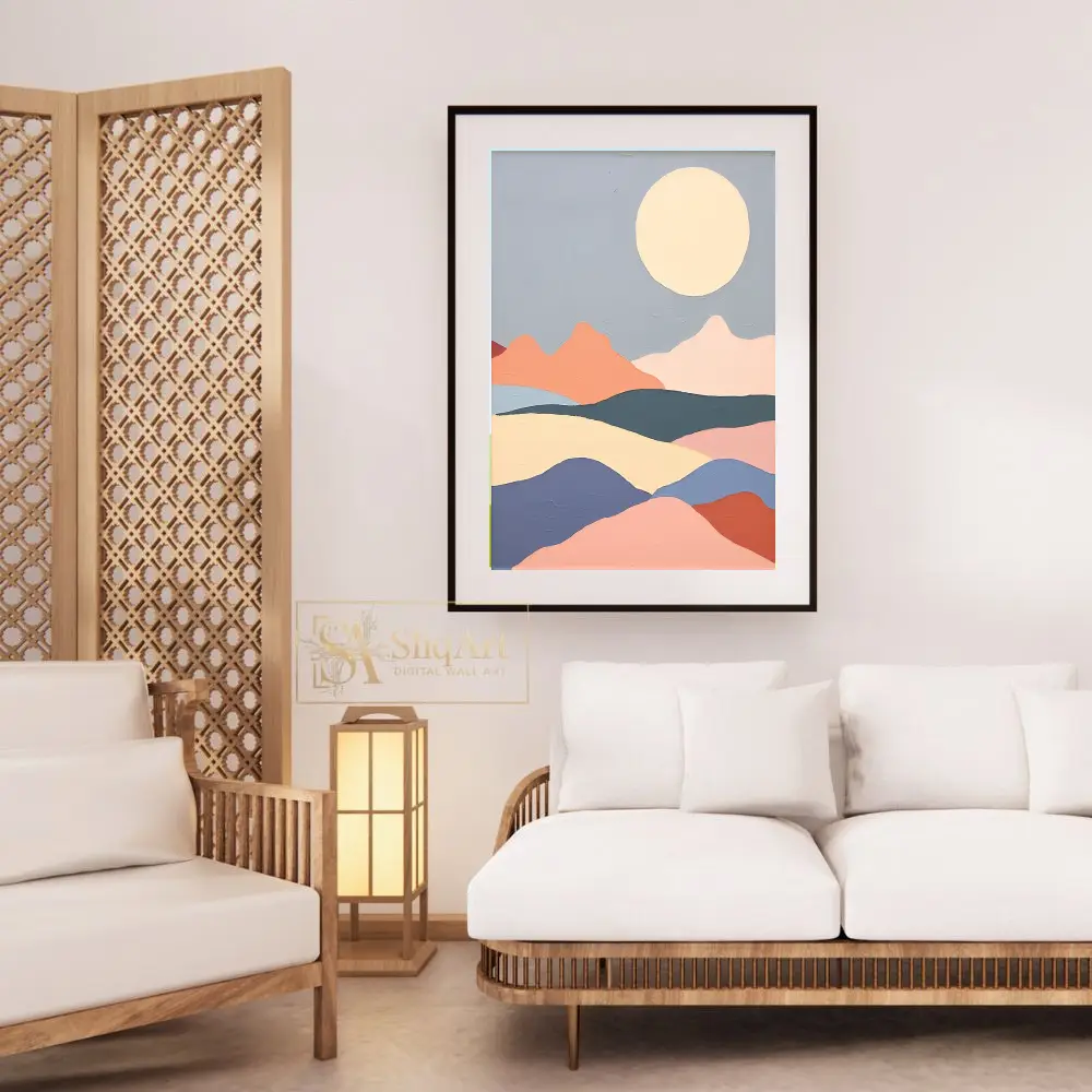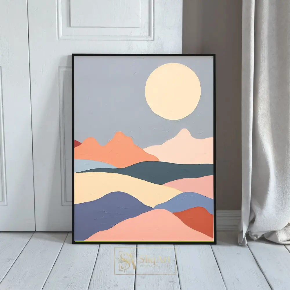 Enhance your living space with this exquisite minimalist abstract landscape. This piece features stylized rolling mountains and a large, soft-yellow sun set against a muted blue sky.
