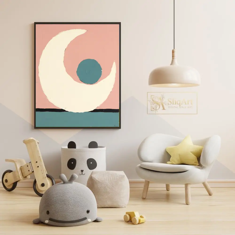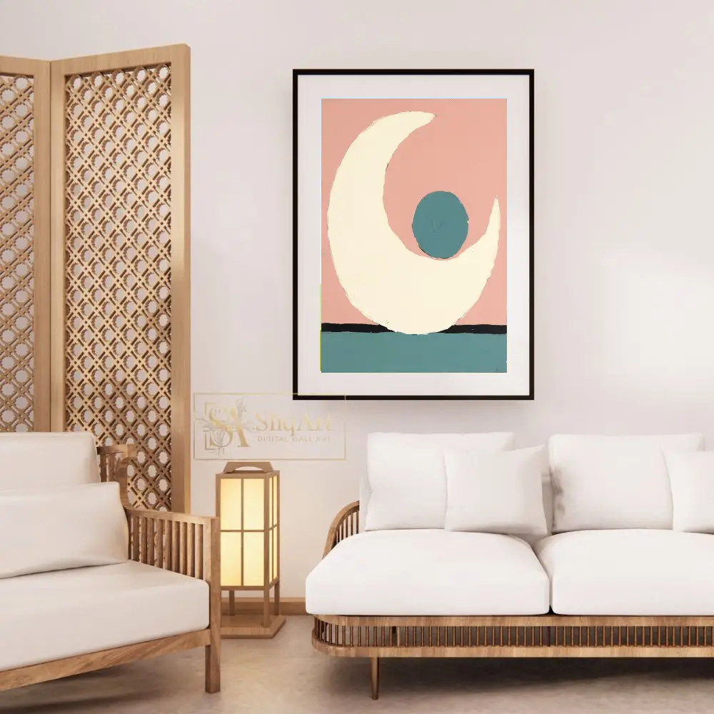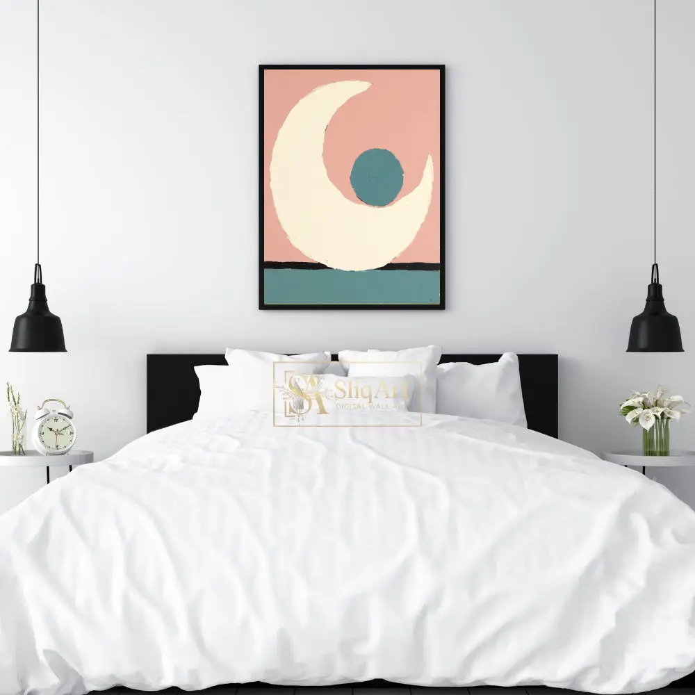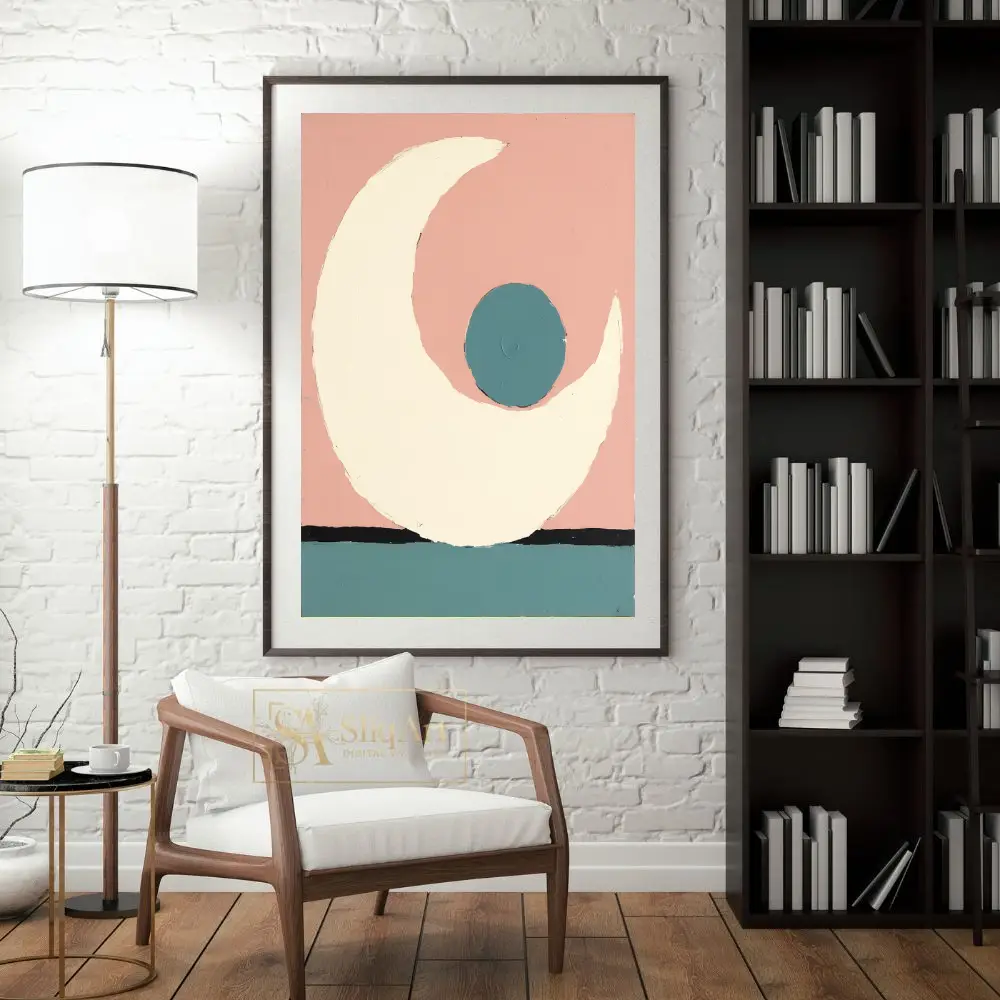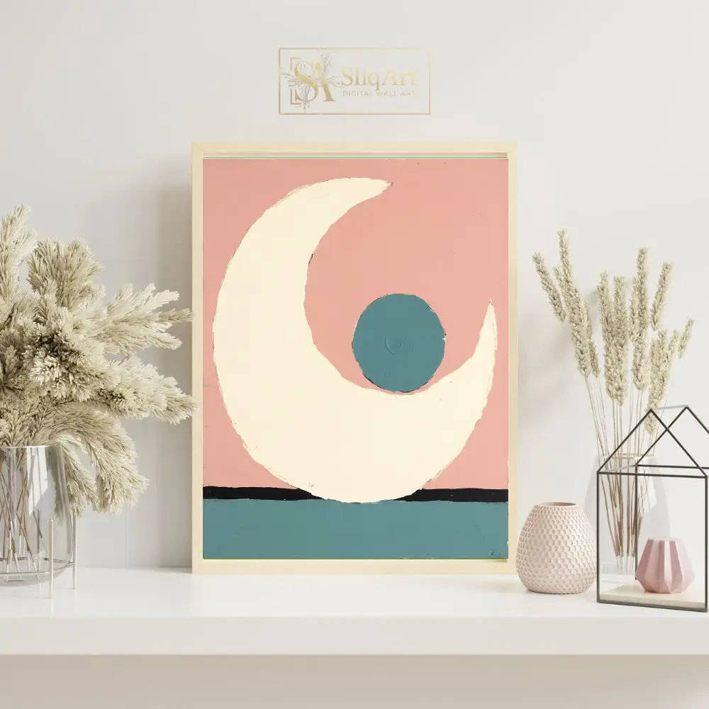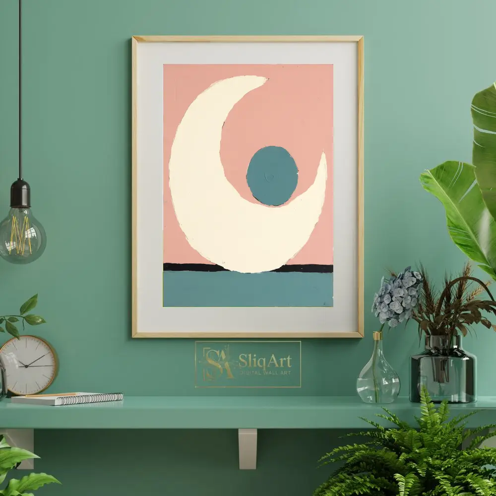 Enhance your interior with this captivating minimalist abstract painting. Featuring a large, textured white crescent moon-like shape cradling a teal circle, this piece is set against a soothing dusty pink background.