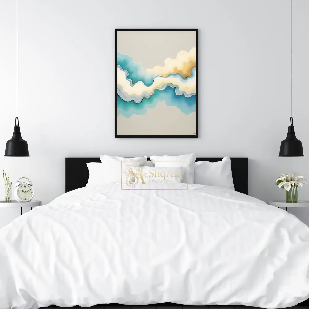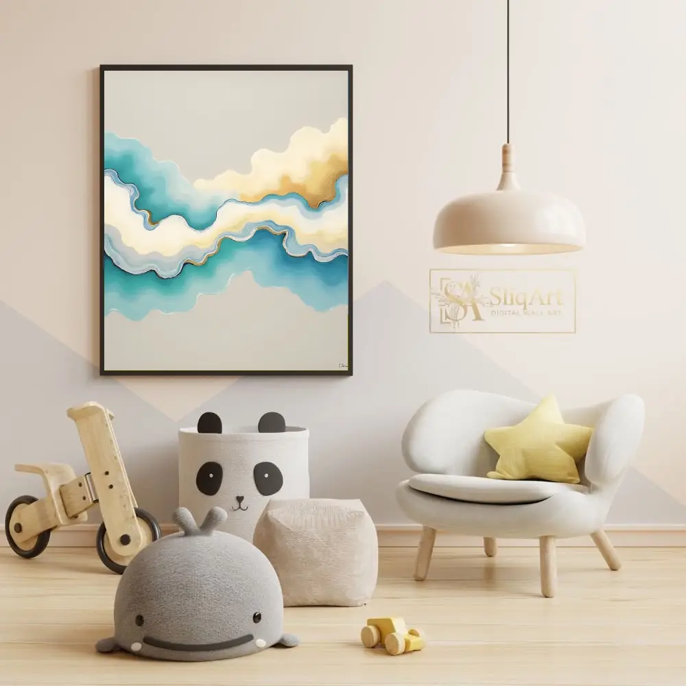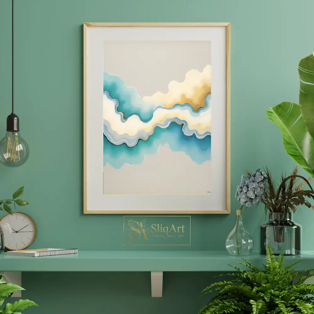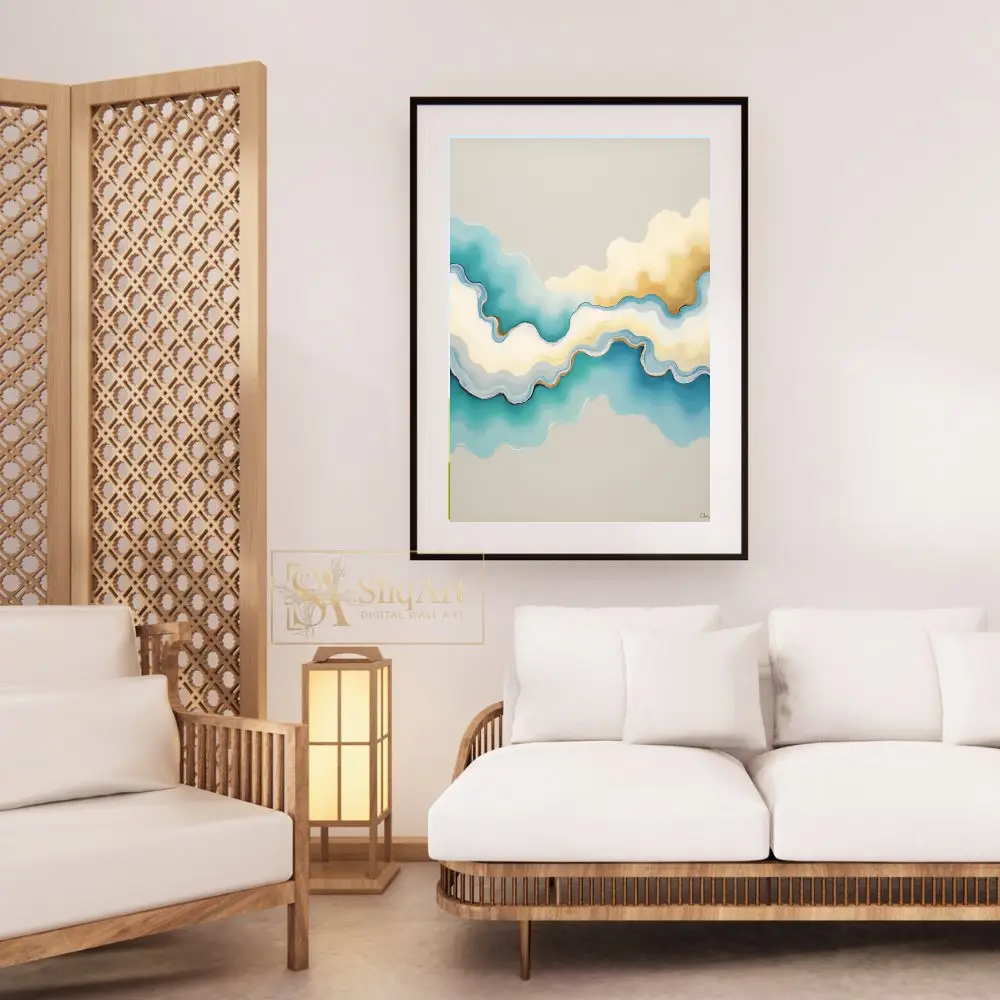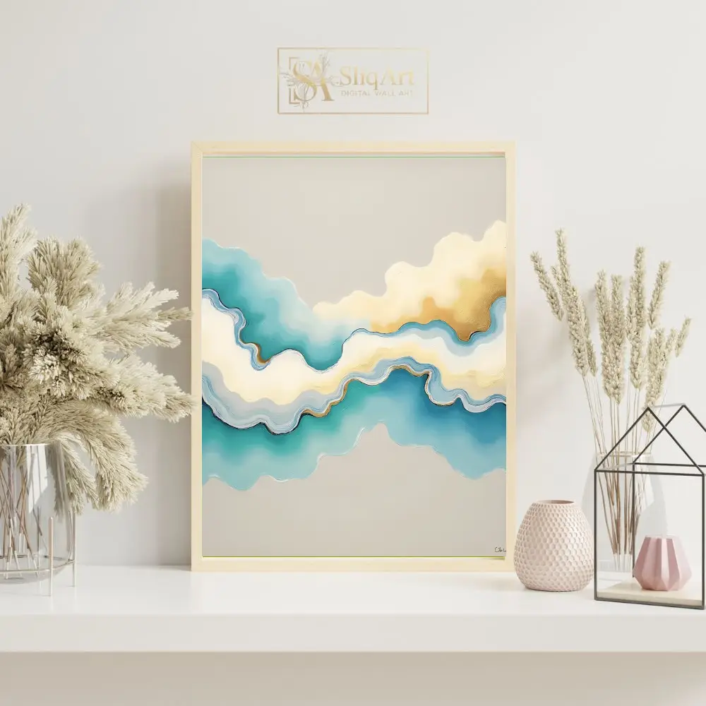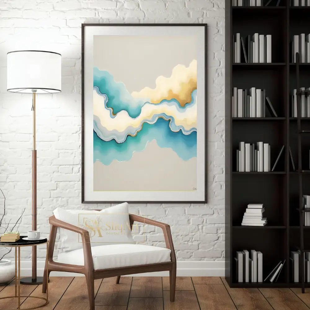Experience the tranquil rhythm of the ocean with ‘Ethereal Tides.’ This stunning abstract piece features fluid, wave-like layers in shades of deep teal, soft turquoise, and warm cream. Delicate accents of metallic gold weave through the organic forms, adding a touch of sophisticated luxury.