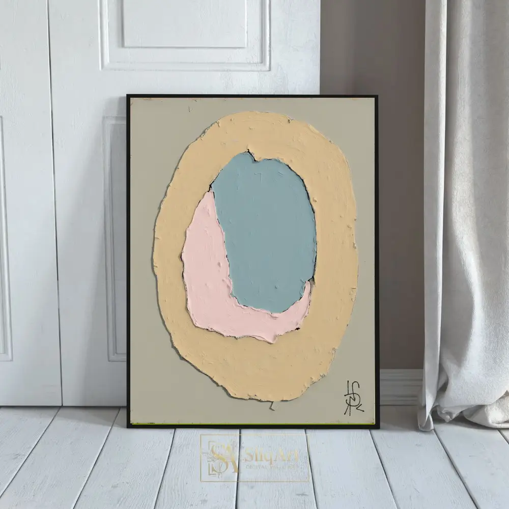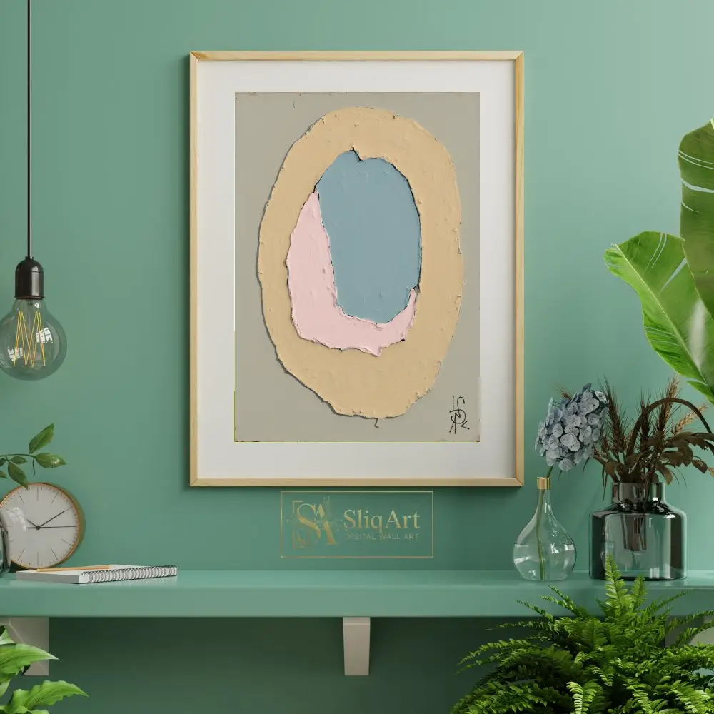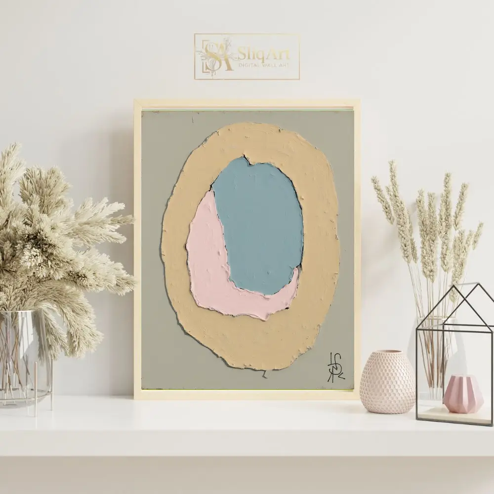 Rendered in a soothing palette of dusty blue, soft pink, and muted yellow against a serene sage-grey background, the artwork emphasizes texture and form. The visible impasto-style brushwork adds depth and a tactile quality, making it a sophisticated addition to any modern interior seeking a touch of calm sophistication.