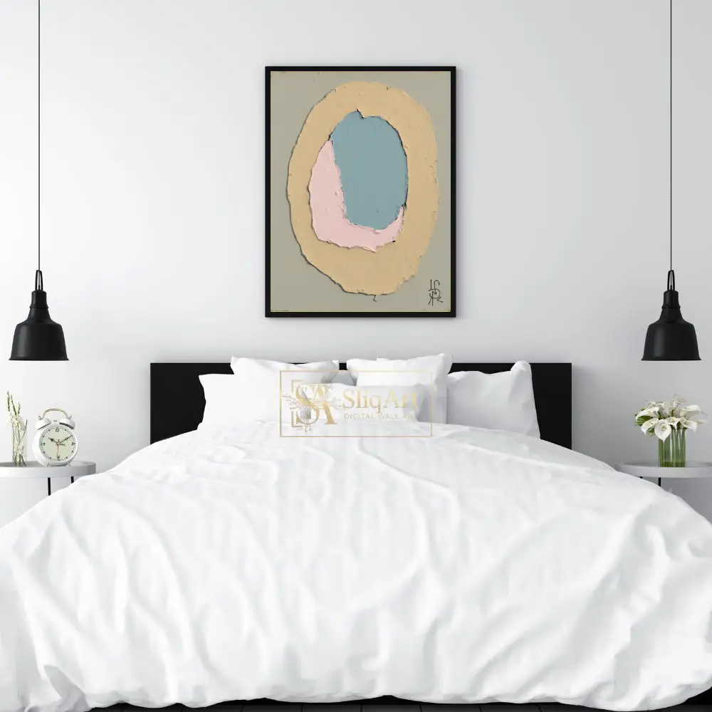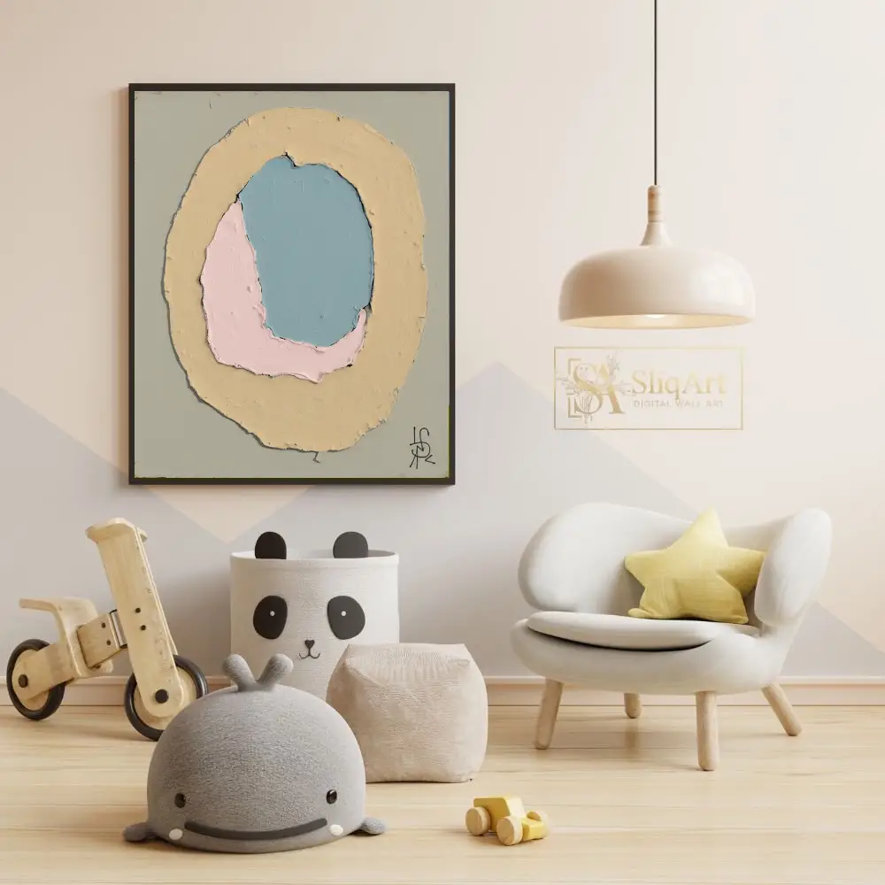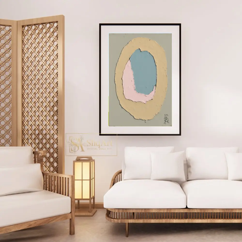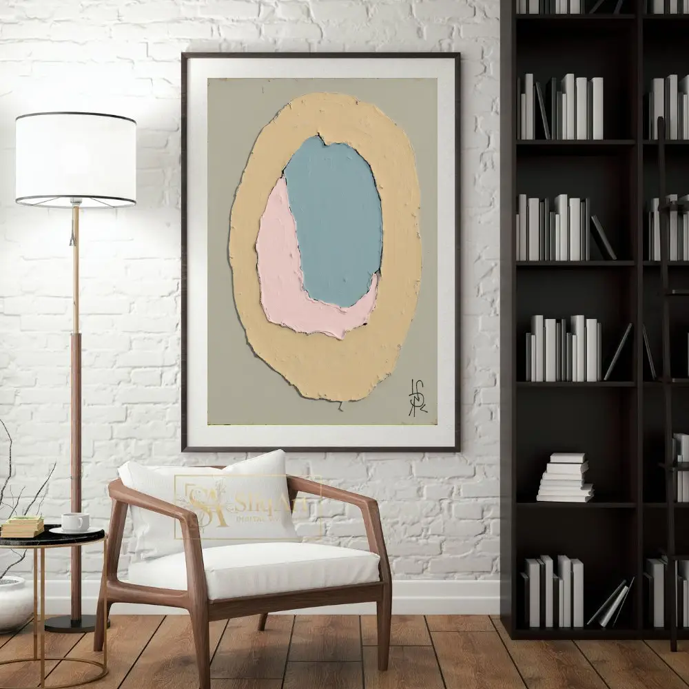 Rendered in a soothing palette of dusty blue, soft pink, and muted yellow against a serene sage-grey background, the artwork emphasizes texture and form. The visible impasto-style brushwork adds depth and a tactile quality, making it a sophisticated addition to any modern interior seeking a touch of calm sophistication.