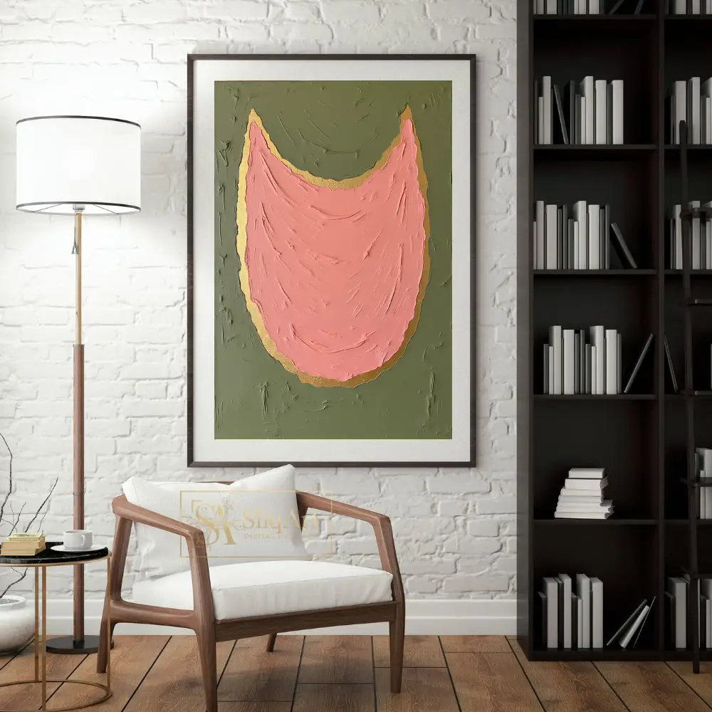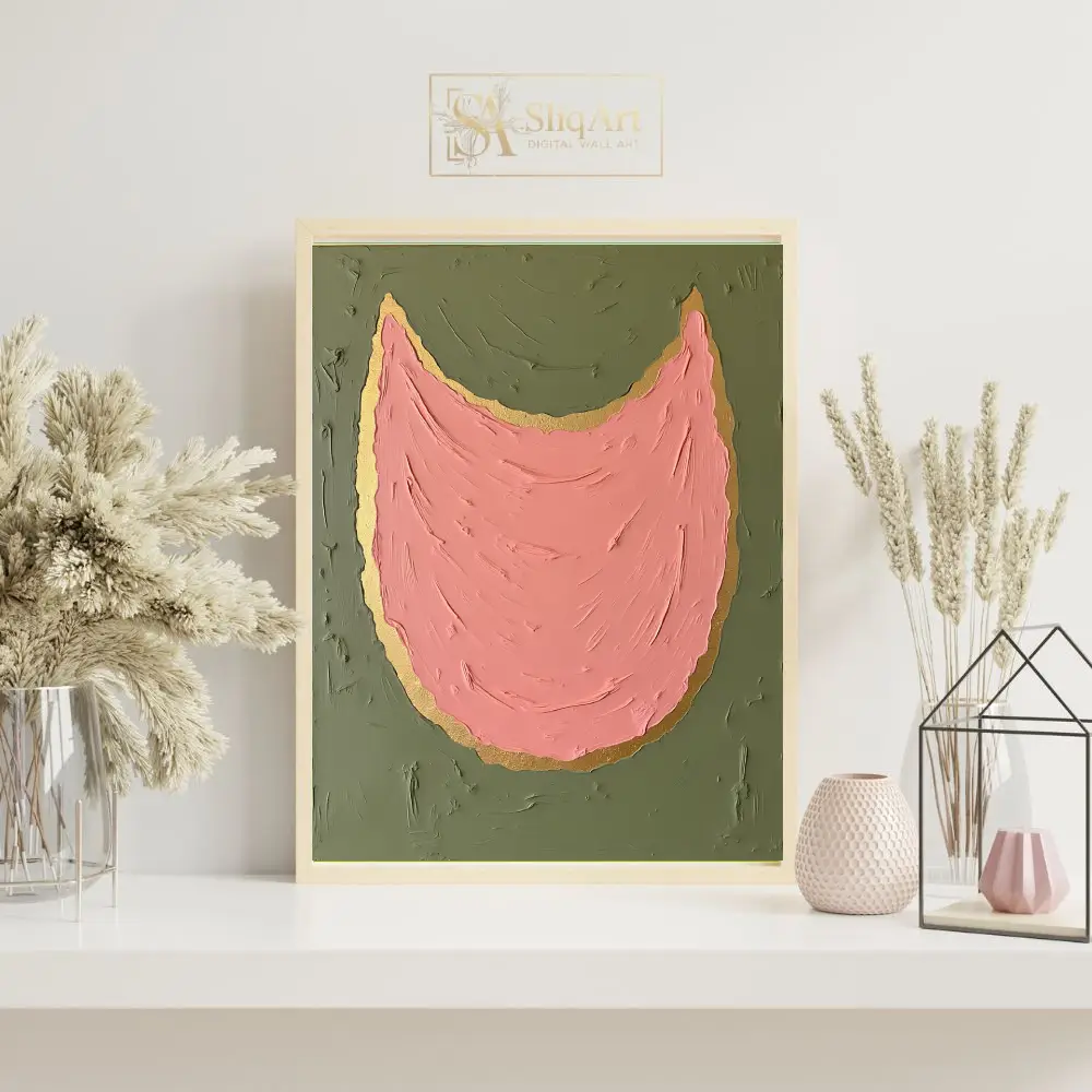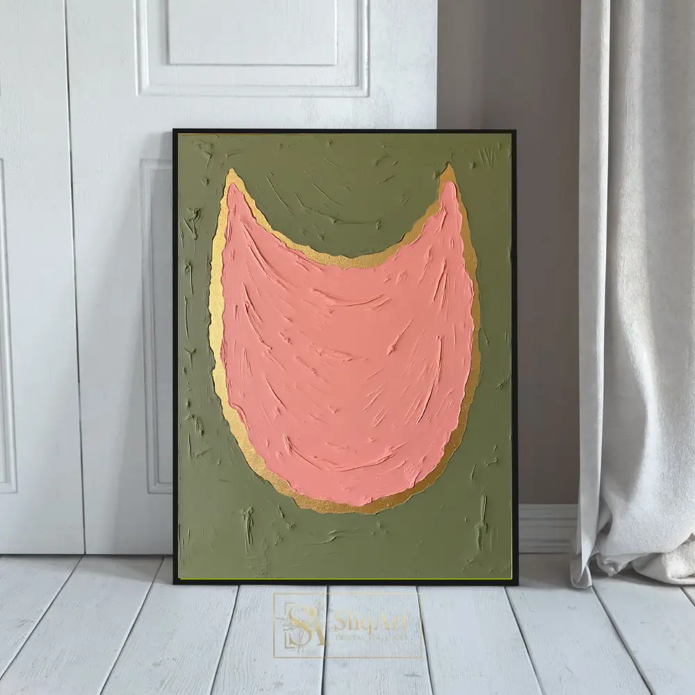 Add a touch of tactile elegance to your home with this stunning textured abstract painting. The piece features a bold, impasto-style pink crescent shape, meticulously outlined with a shimmering gold metallic border.