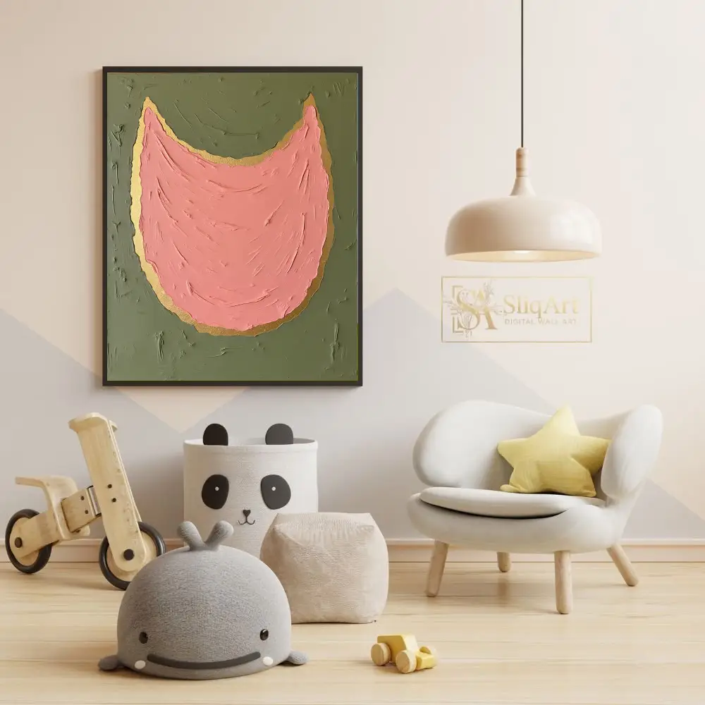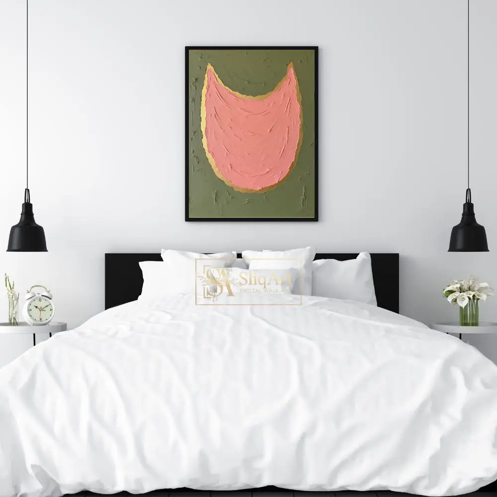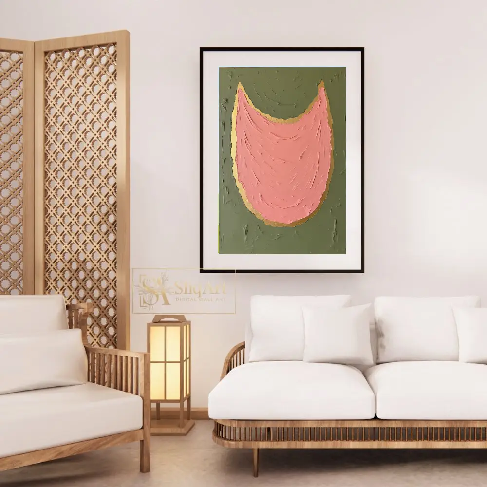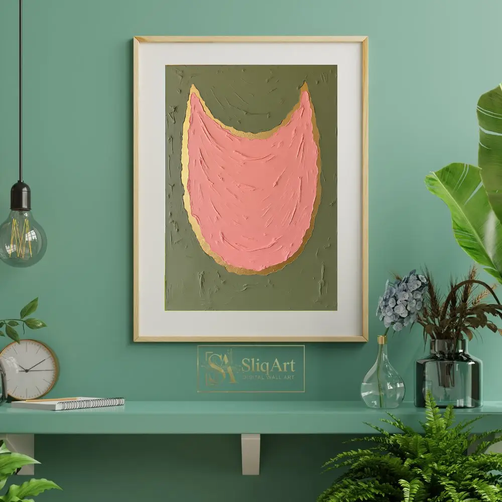 Add a touch of tactile elegance to your home with this stunning textured abstract painting. The piece features a bold, impasto-style pink crescent shape, meticulously outlined with a shimmering gold metallic border.