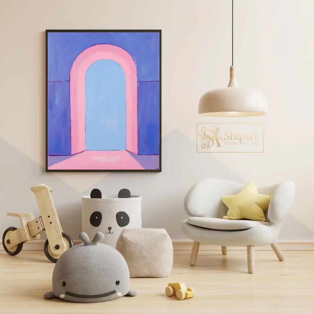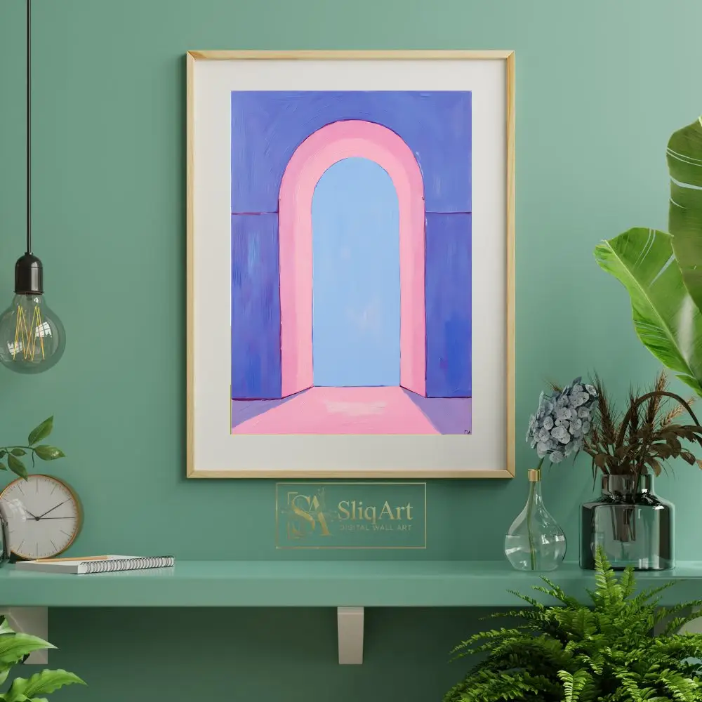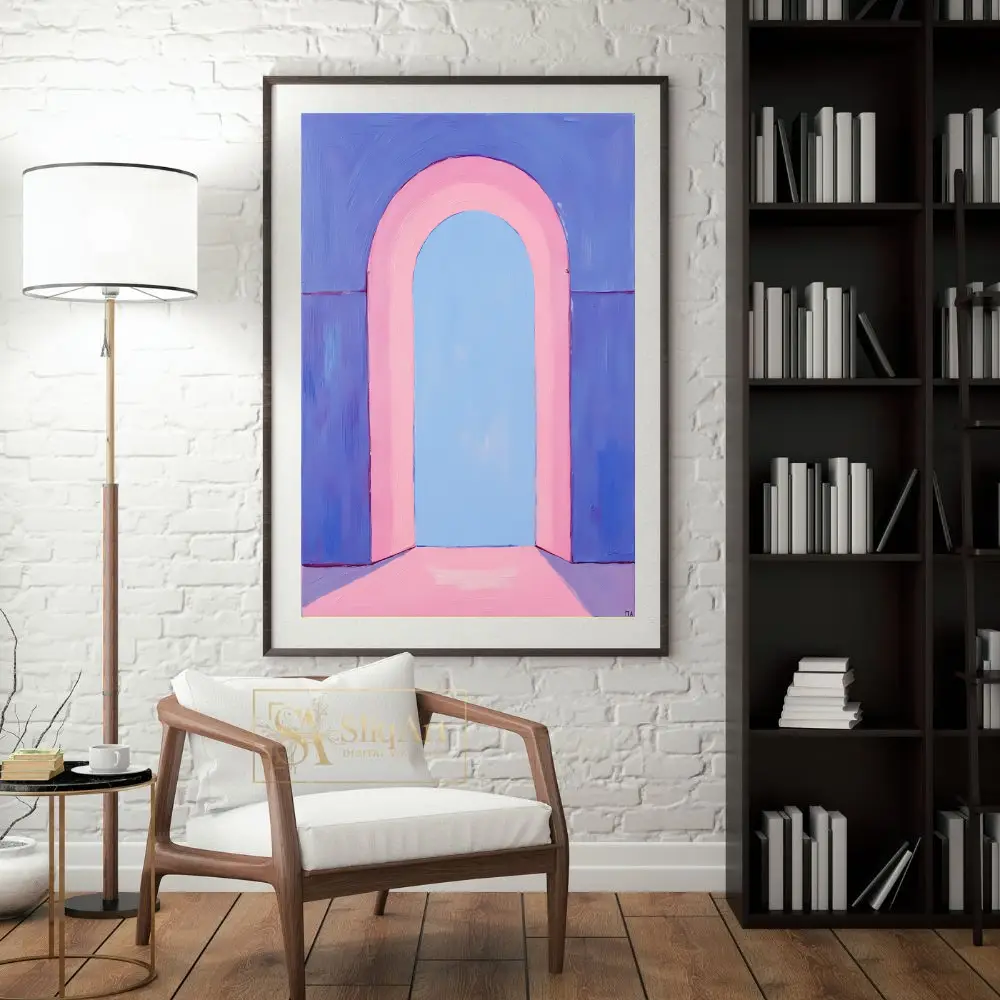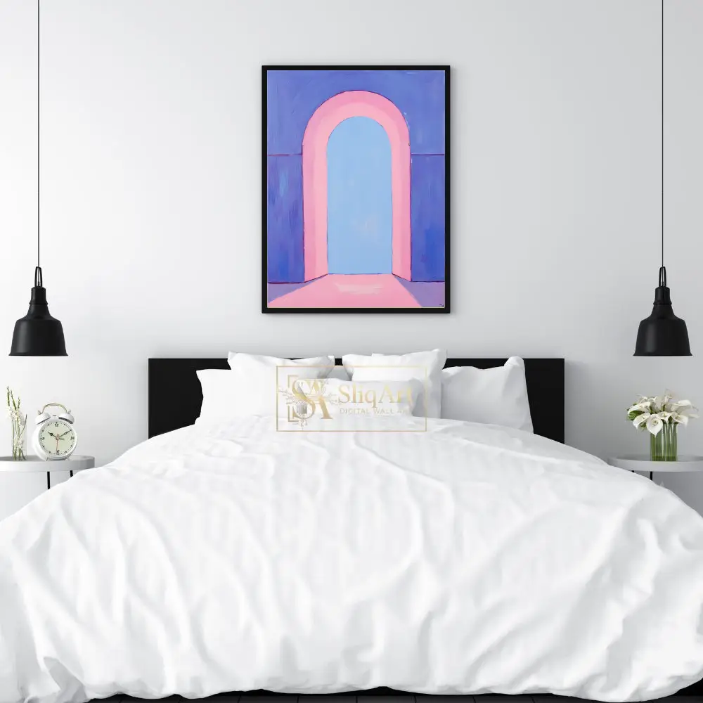 This captivating piece of minimalist art features a soft, pastel-toned arched portal that invites the viewer into a serene, ethereal space.