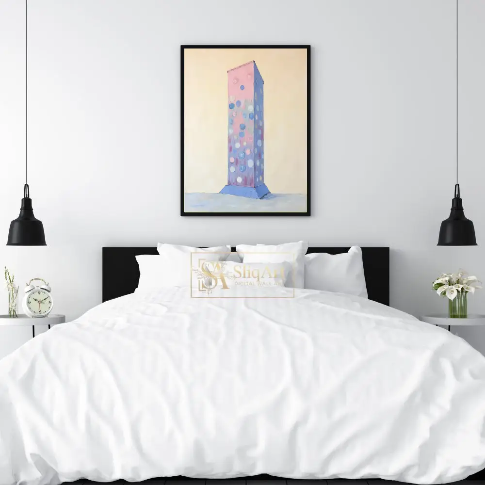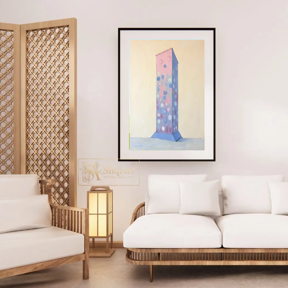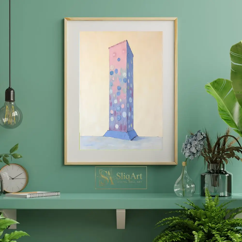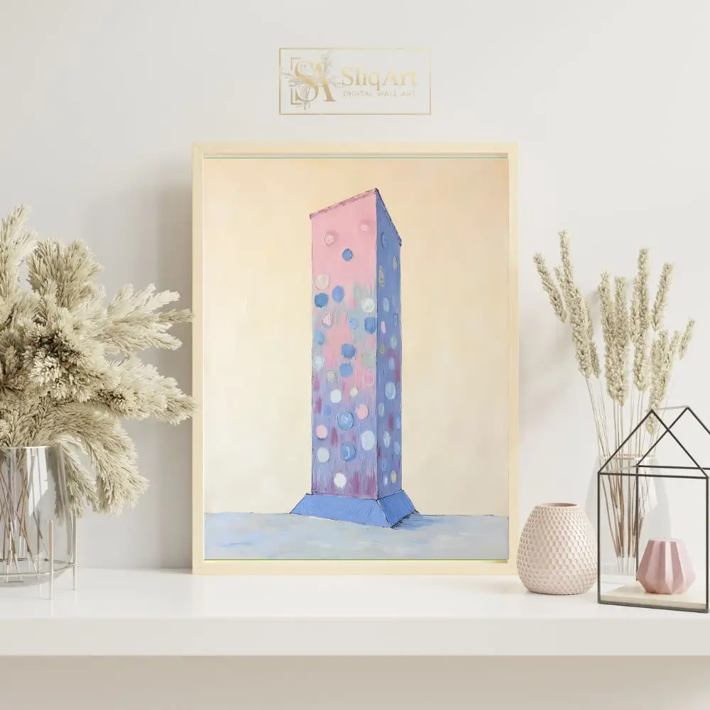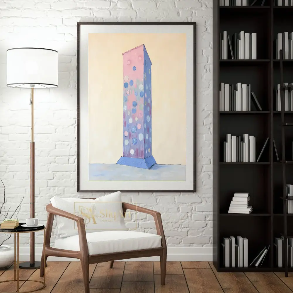 This captivating abstract piece features a textured, monolithic column rising from a subtle blue base against a creamy, minimalist background. The central figure is adorned with playful, impasto-style circles in soft shades of periwinkle, rose, and white.