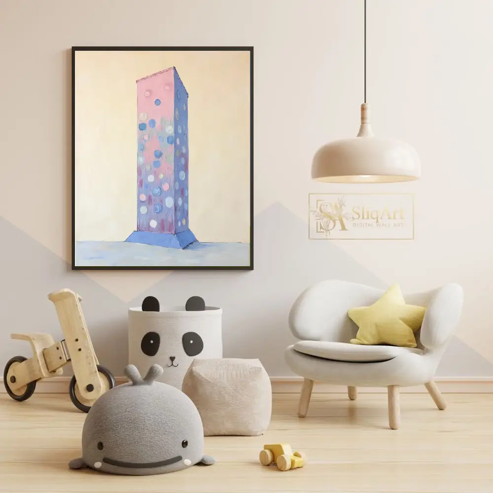 The gentle pastel color palette creates a serene, dreamlike atmosphere, while the thick, visible brushwork adds a tactile, three-dimensional quality to the work. It is a perfect blend of geometric structure and whimsical detail, designed to bring a sense of modern calm and artistic curiosity to any contemporary living space.
