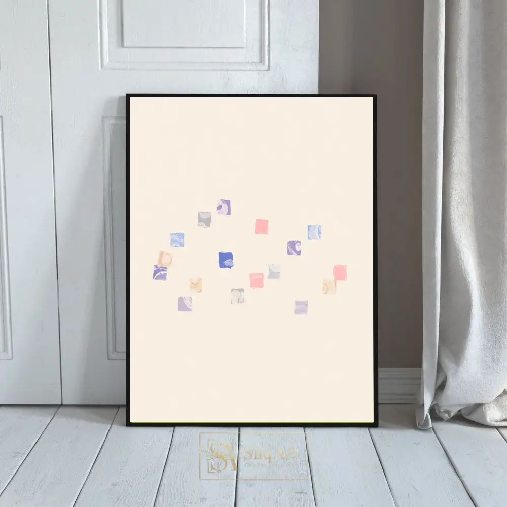 Each square is uniquely detailed with painterly swirls and brushstrokes, floating gracefully on a warm cream-colored background. This sophisticated piece is designed for those who appreciate understated beauty and clean, contemporary design, making it a perfect addition to a serene living environment.