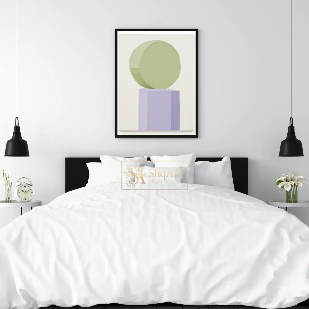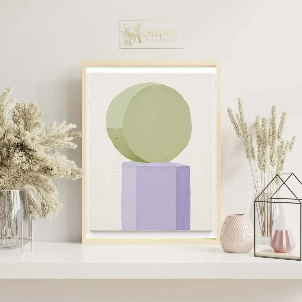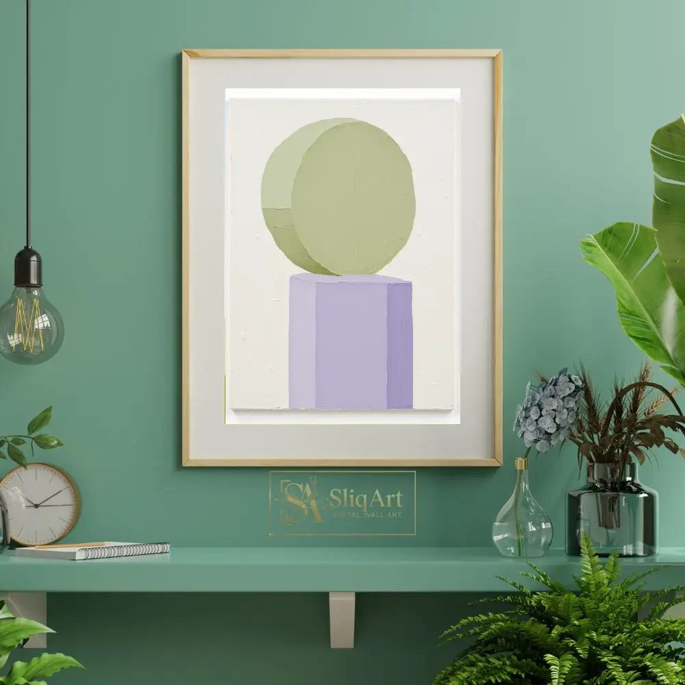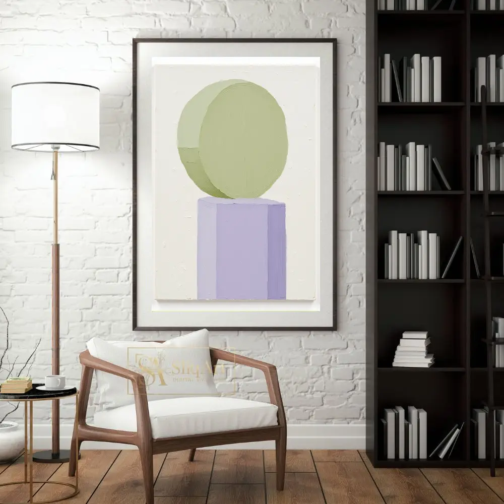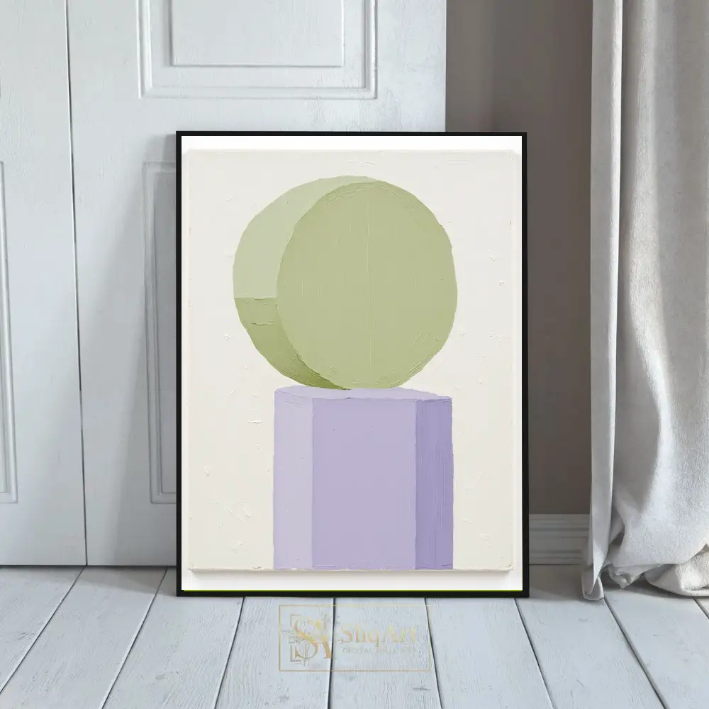 Elevate your interior with this striking minimalist abstract oil painting. Featuring a serene sage green cylindrical form balanced atop a lavender rectangular prism, this piece explores the harmony of geometric shapes and pastel tones.