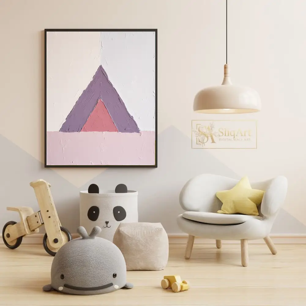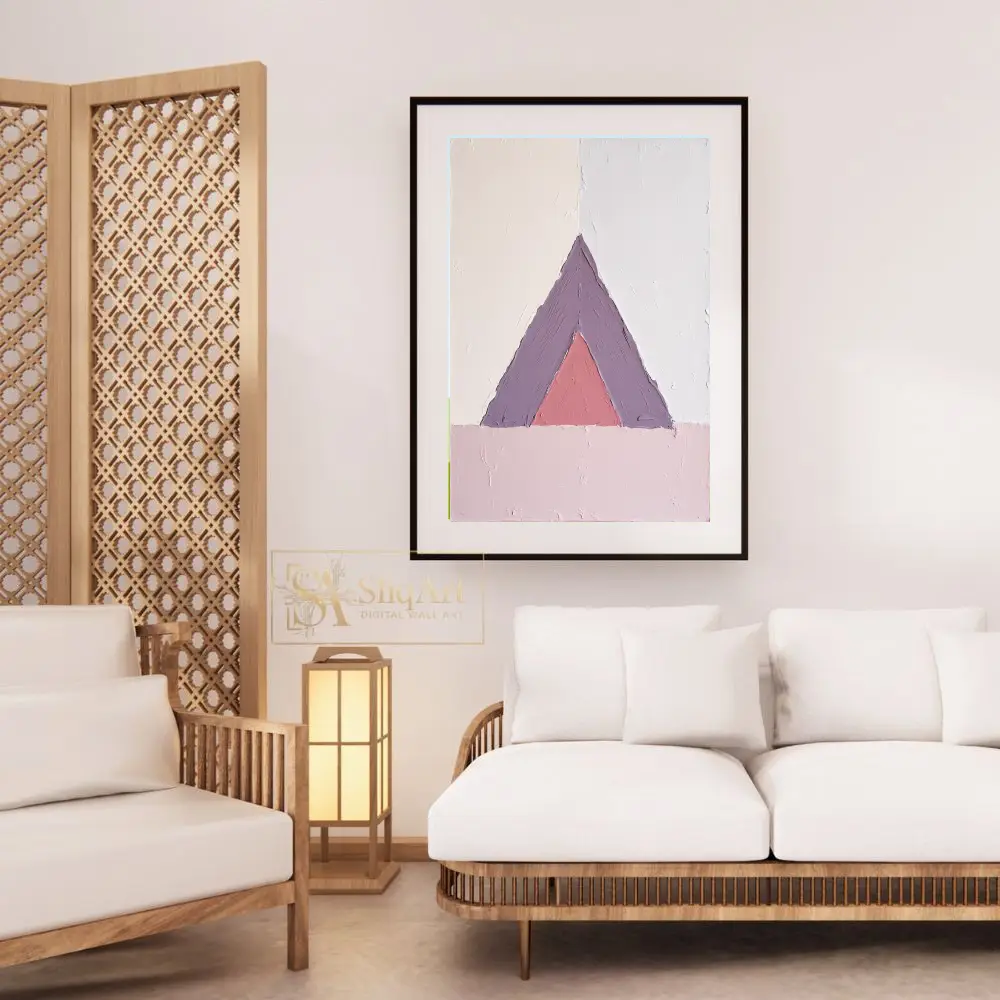 Enhance your living space with this sophisticated geometric abstract painting, showcasing a nested triangle design in muted lavender and dusty rose.