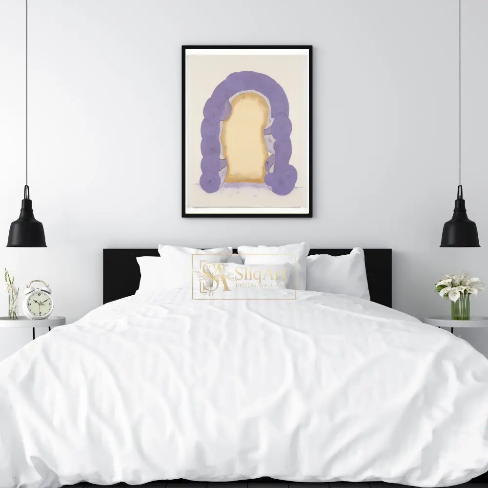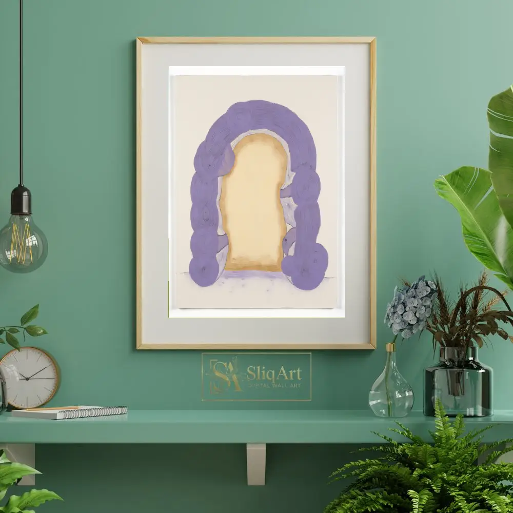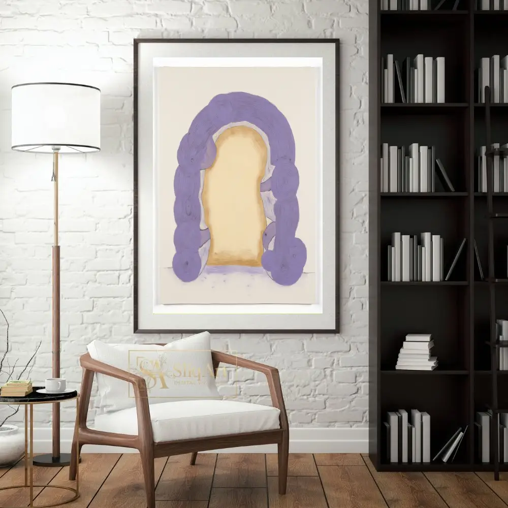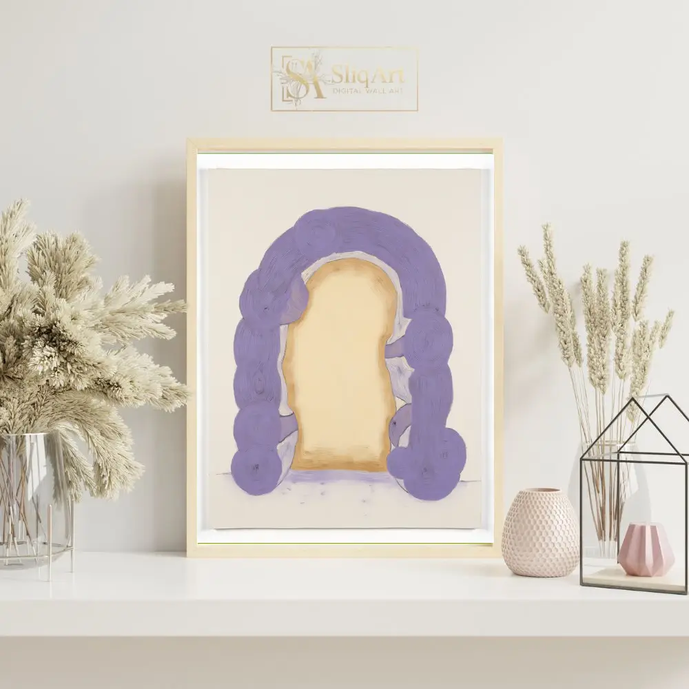 Step into a realm of tranquility with this stunning abstract piece. ‘Ethereal Lavender Arch’ features a thick, impasto-style archway in soothing lilac and violet tones, framing a soft, glowing golden center.