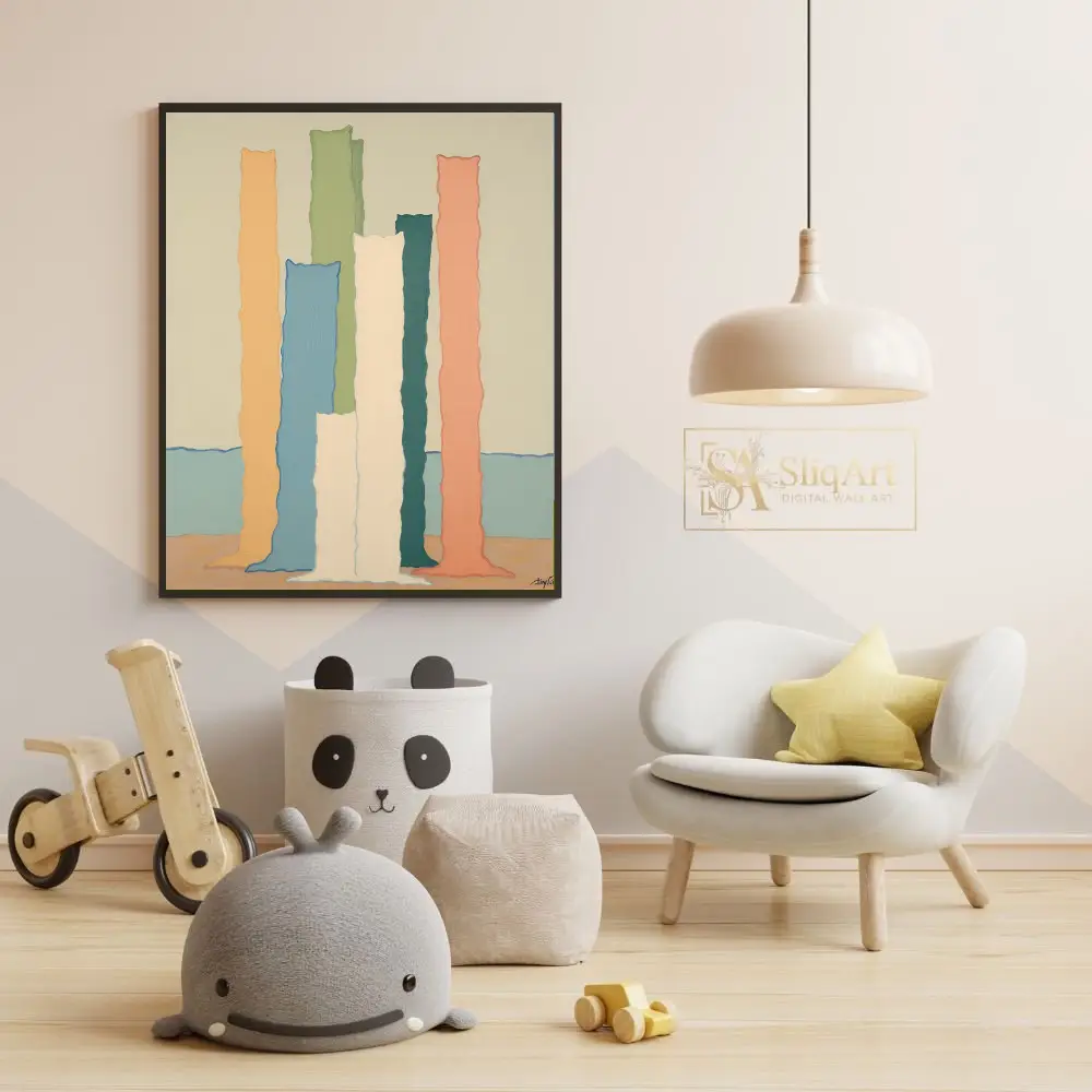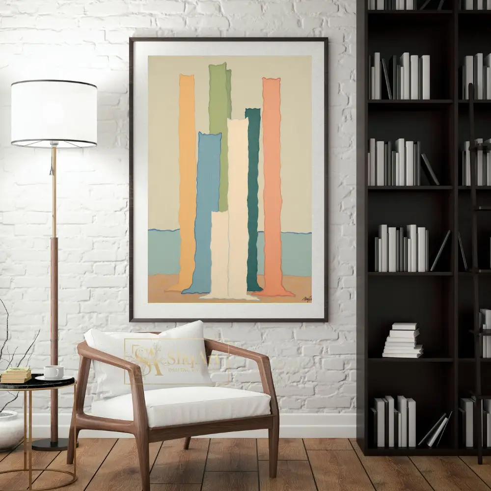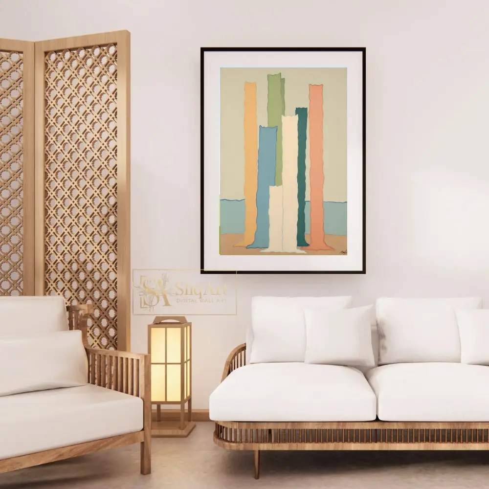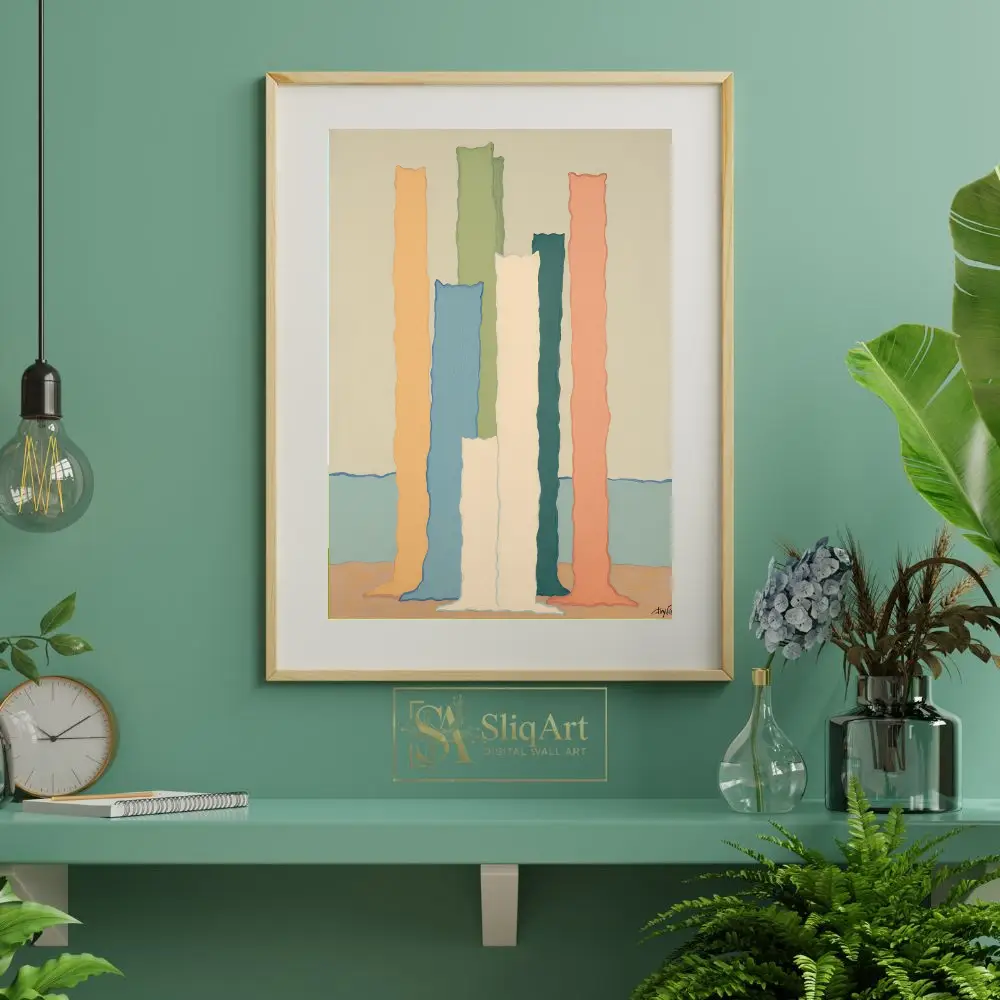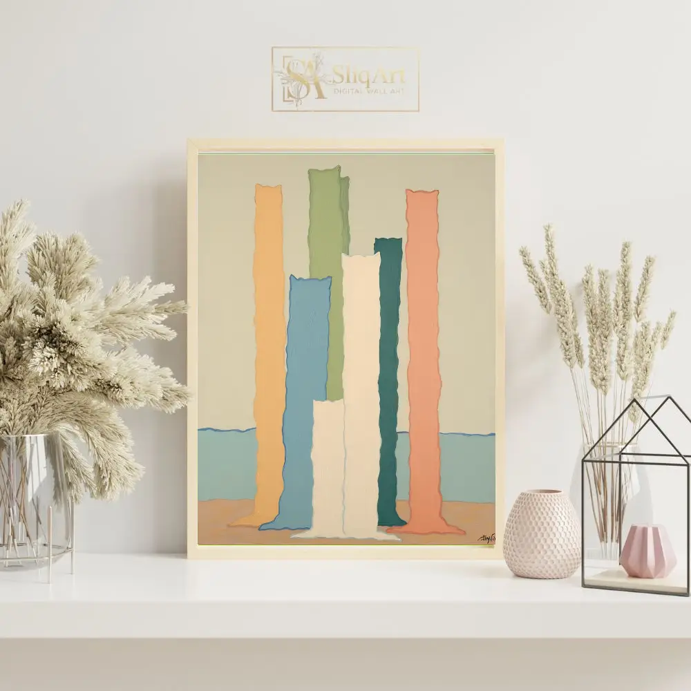 This striking contemporary piece features a collection of vertical, undulating columns in a soothing pastel palette. Set against a serene horizon of soft blue and beige, the textured ‘monoliths’ in shades of peach, sage, teal, and cream create a rhythmic, almost sculptural presence.