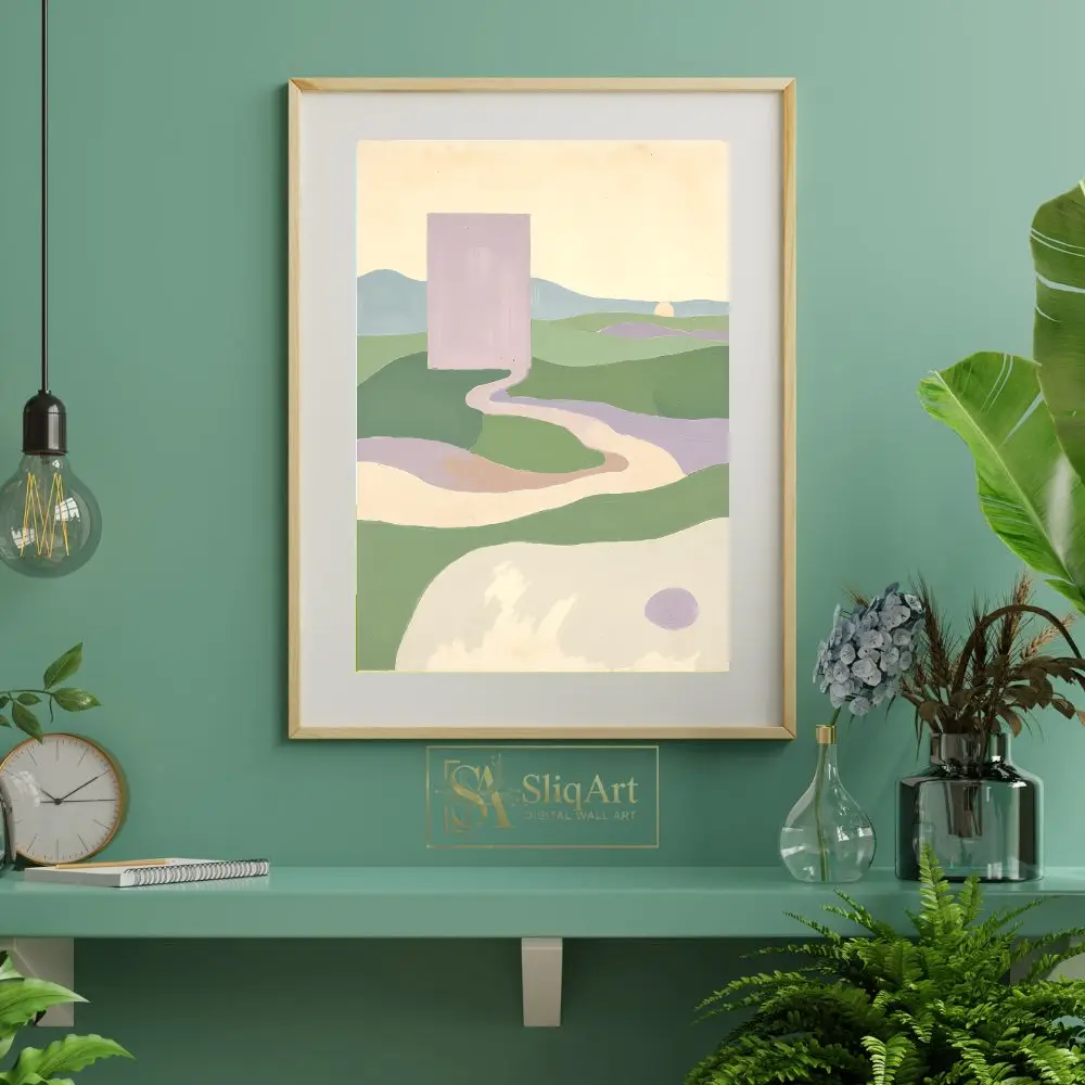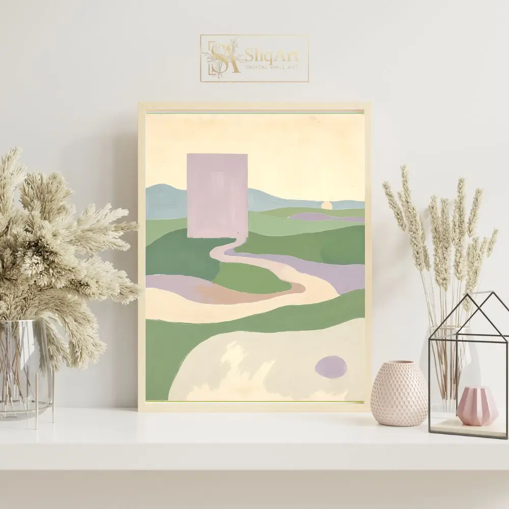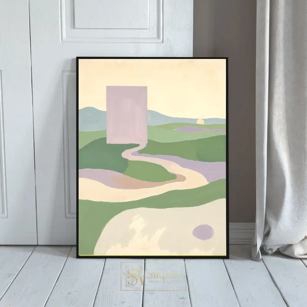 Enhance your interior with this captivating minimalist abstract landscape. The composition features a striking lavender monolith overlooking a serene valley of rolling green hills and winding pathways.