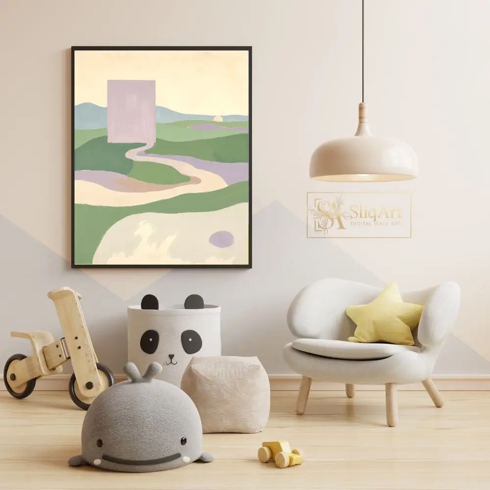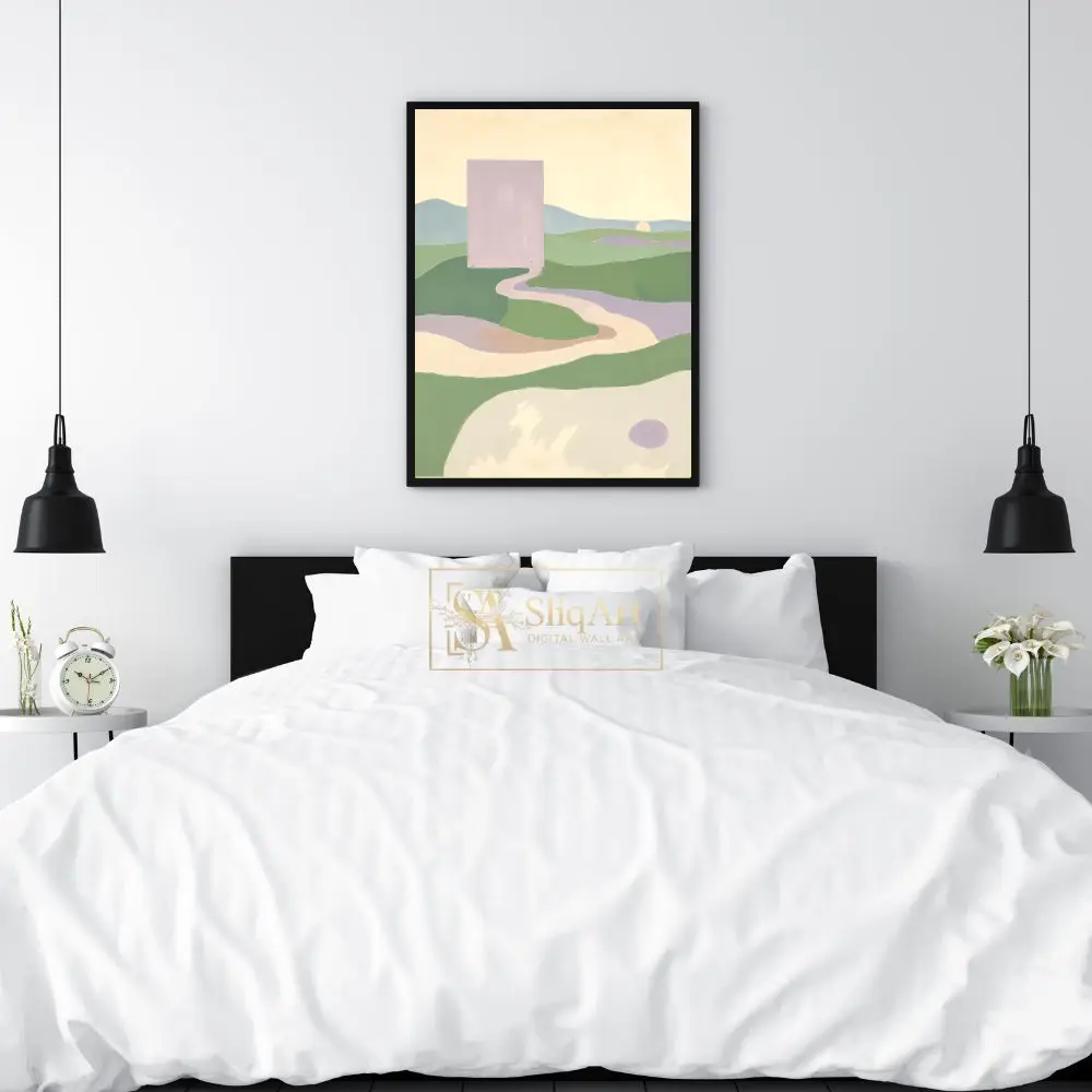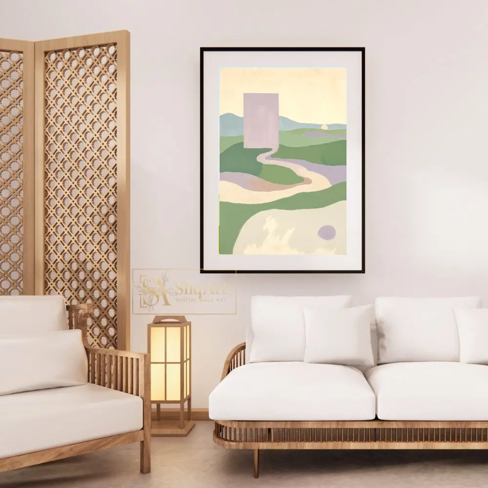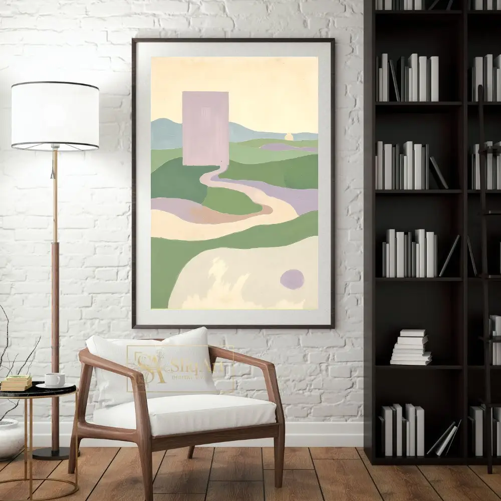 Enhance your interior with this captivating minimalist abstract landscape. The composition features a striking lavender monolith overlooking a serene valley of rolling green hills and winding pathways.
