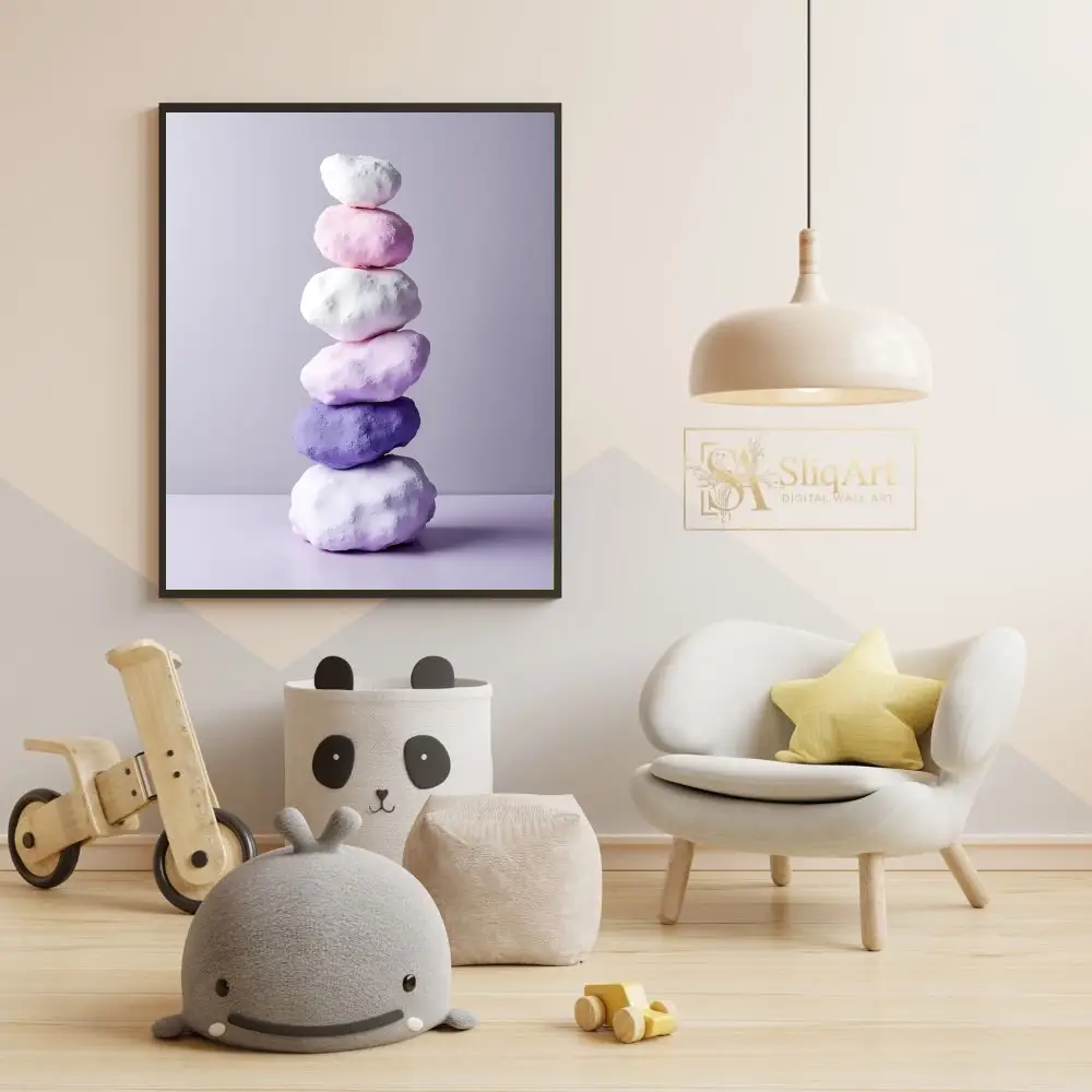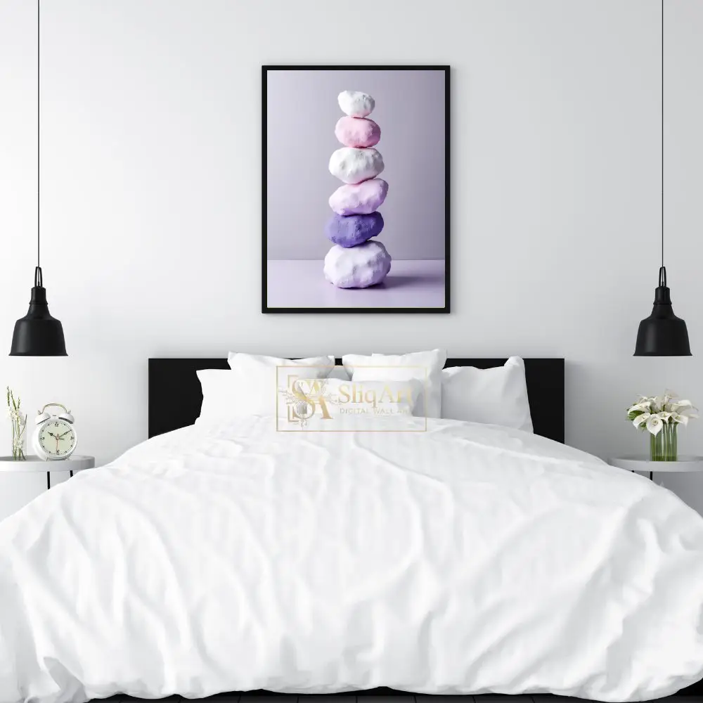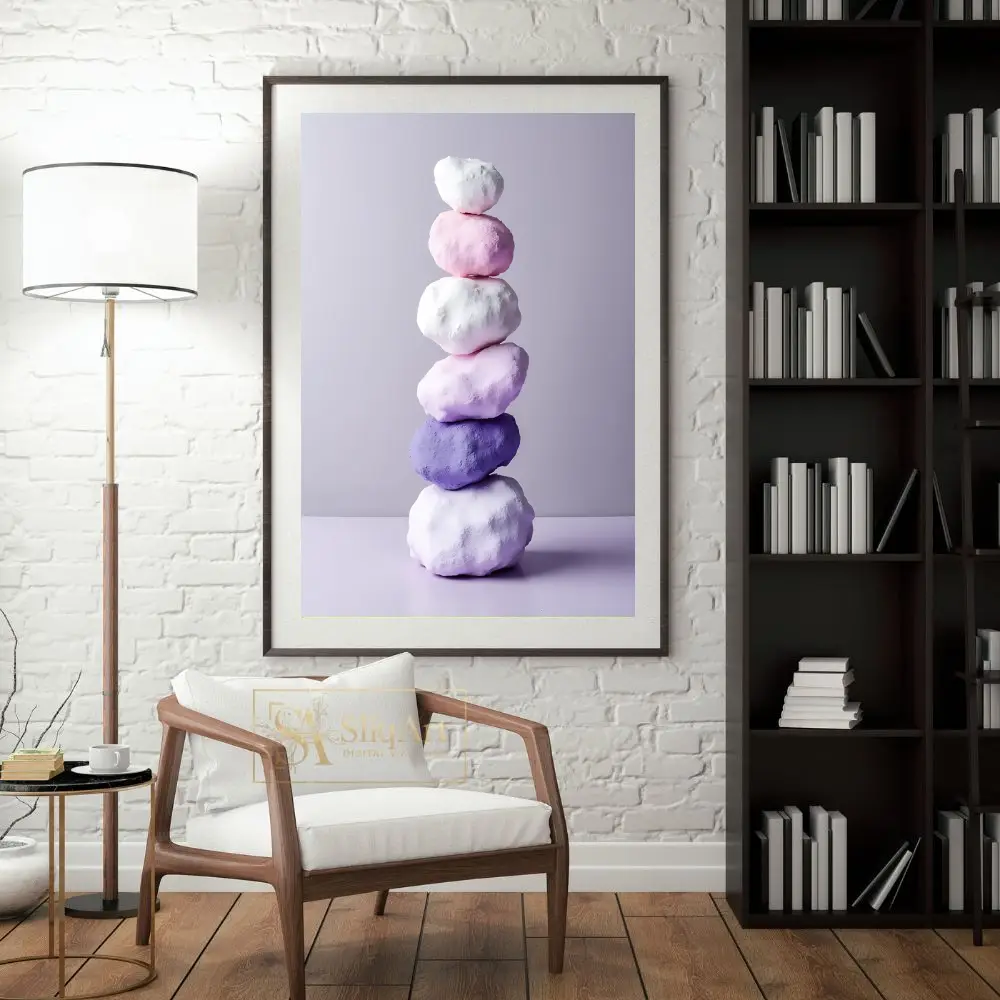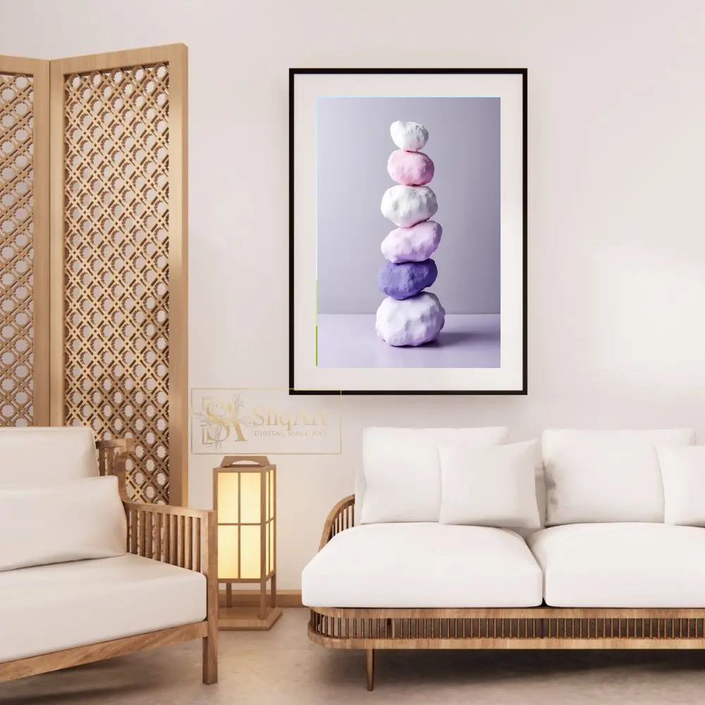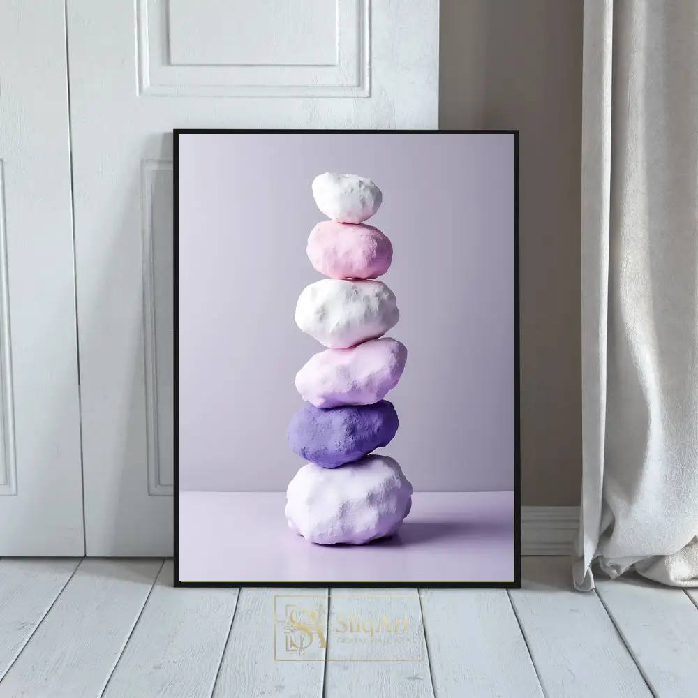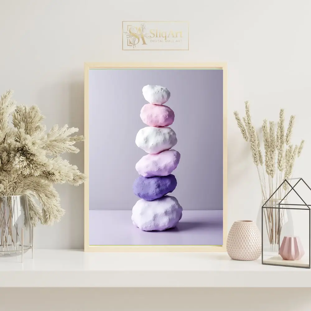 The color palette moves gracefully from deep lavender to soft blush pink and airy white, creating a visual rhythm that calms the mind. Each stone’s subtle texture is highlighted by soft, diffuse lighting, making it a sophisticated addition to a modern interior seeking a touch of tranquility and Zen inspiration.
