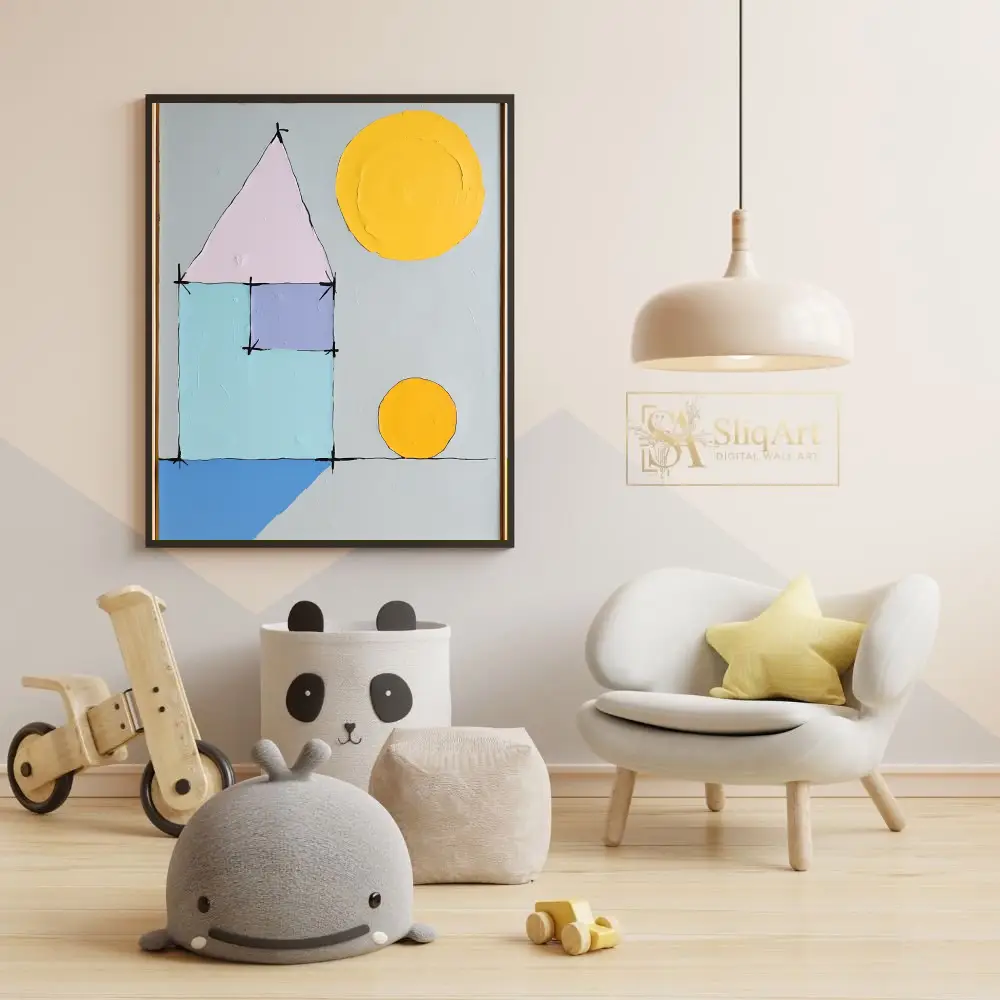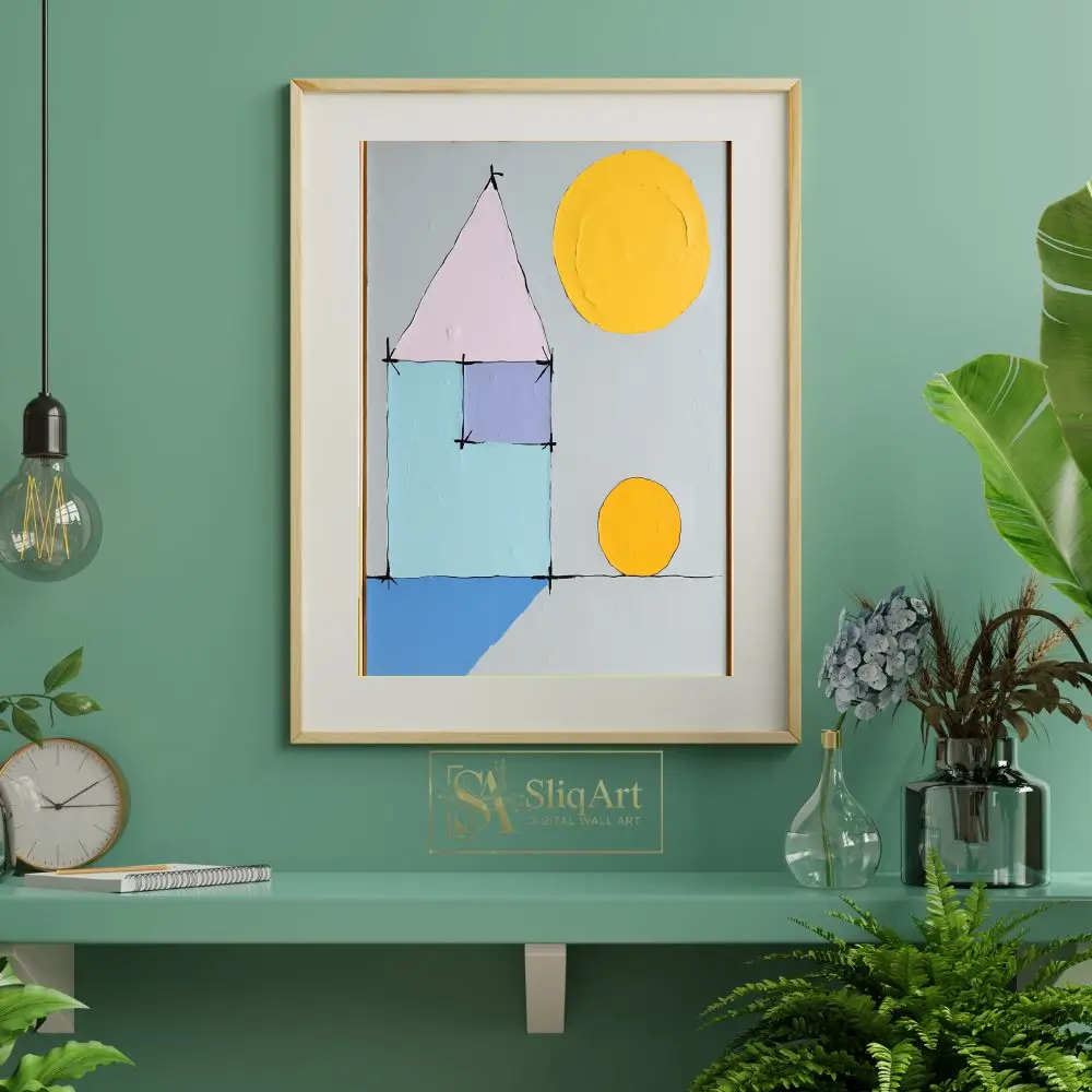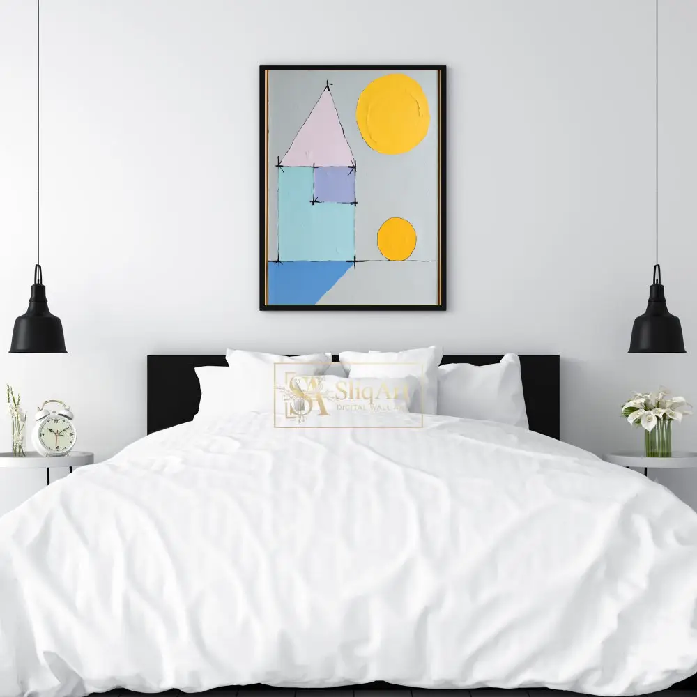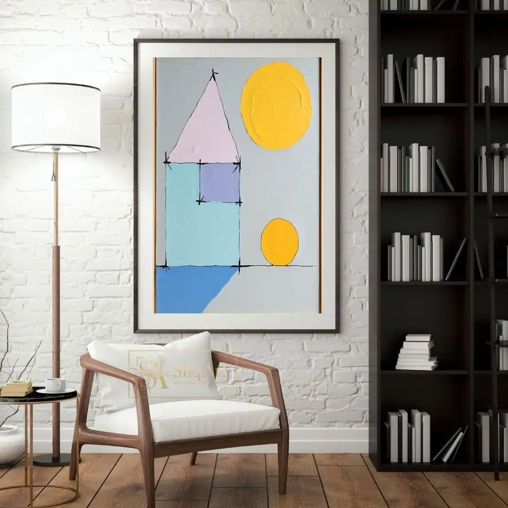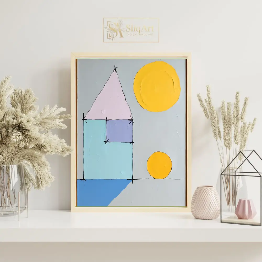 Be the first to review “Minimalist Geometric House Abstract Art – Pastel & Yellow Sun”