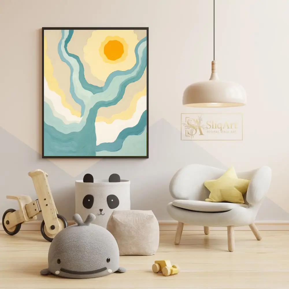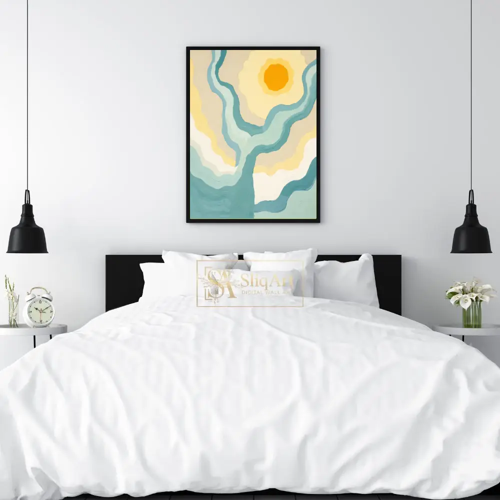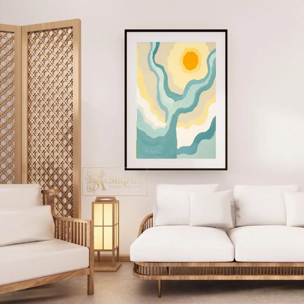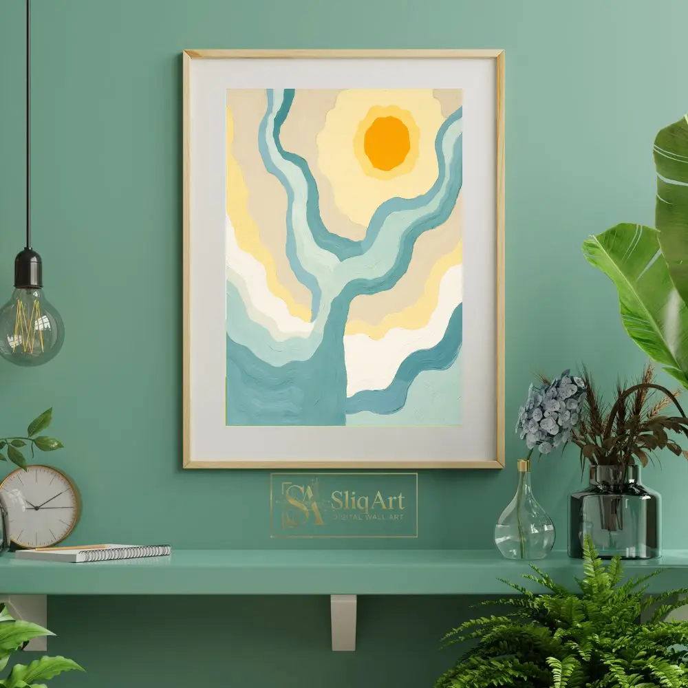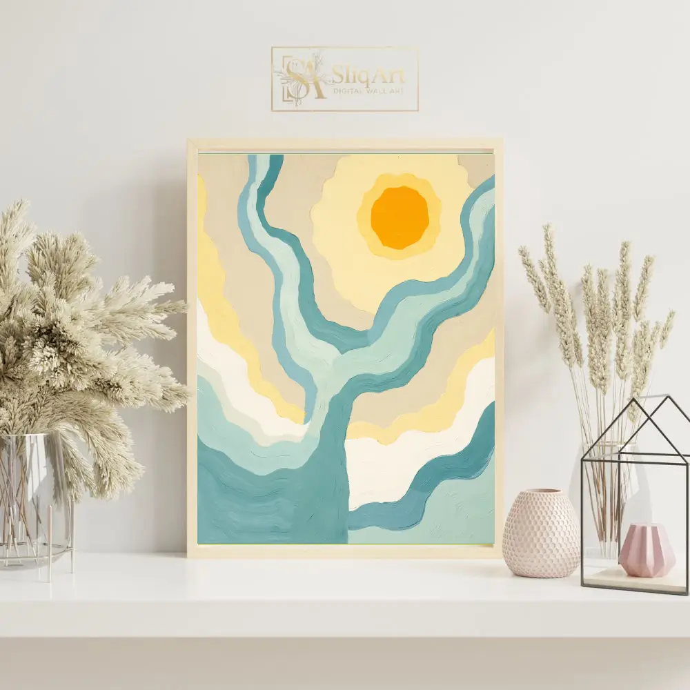 Bring a sense of calm and organic movement to your space with this stunning abstract painting. Featuring a soft, radiant sun nestled among flowing, wave-like forms in teal, beige, and cream, this piece captures the essence of a serene horizon.