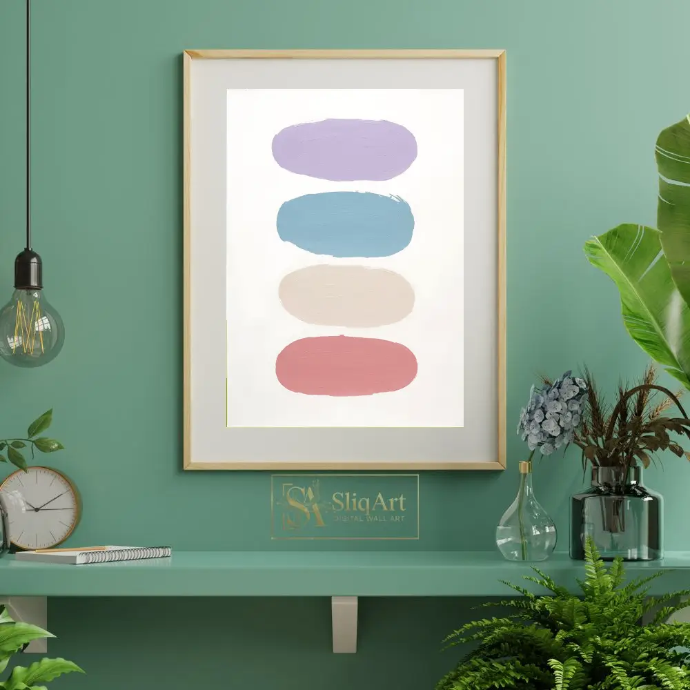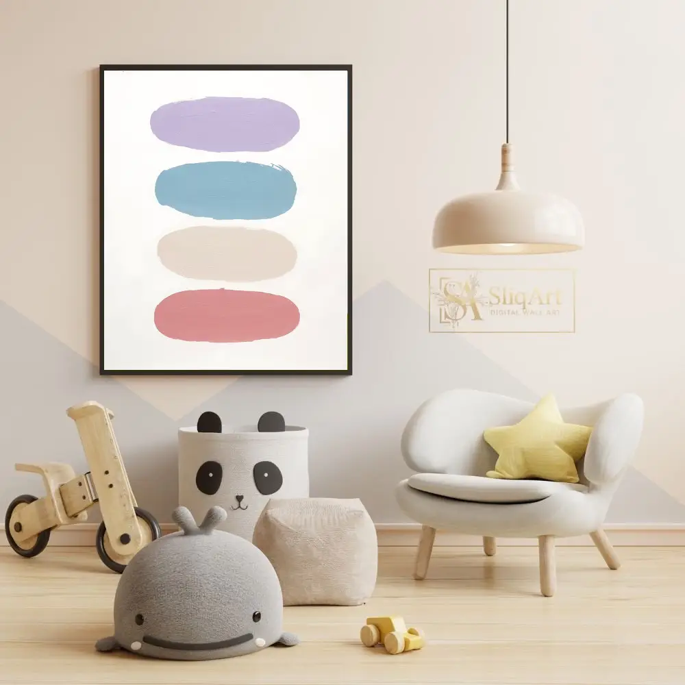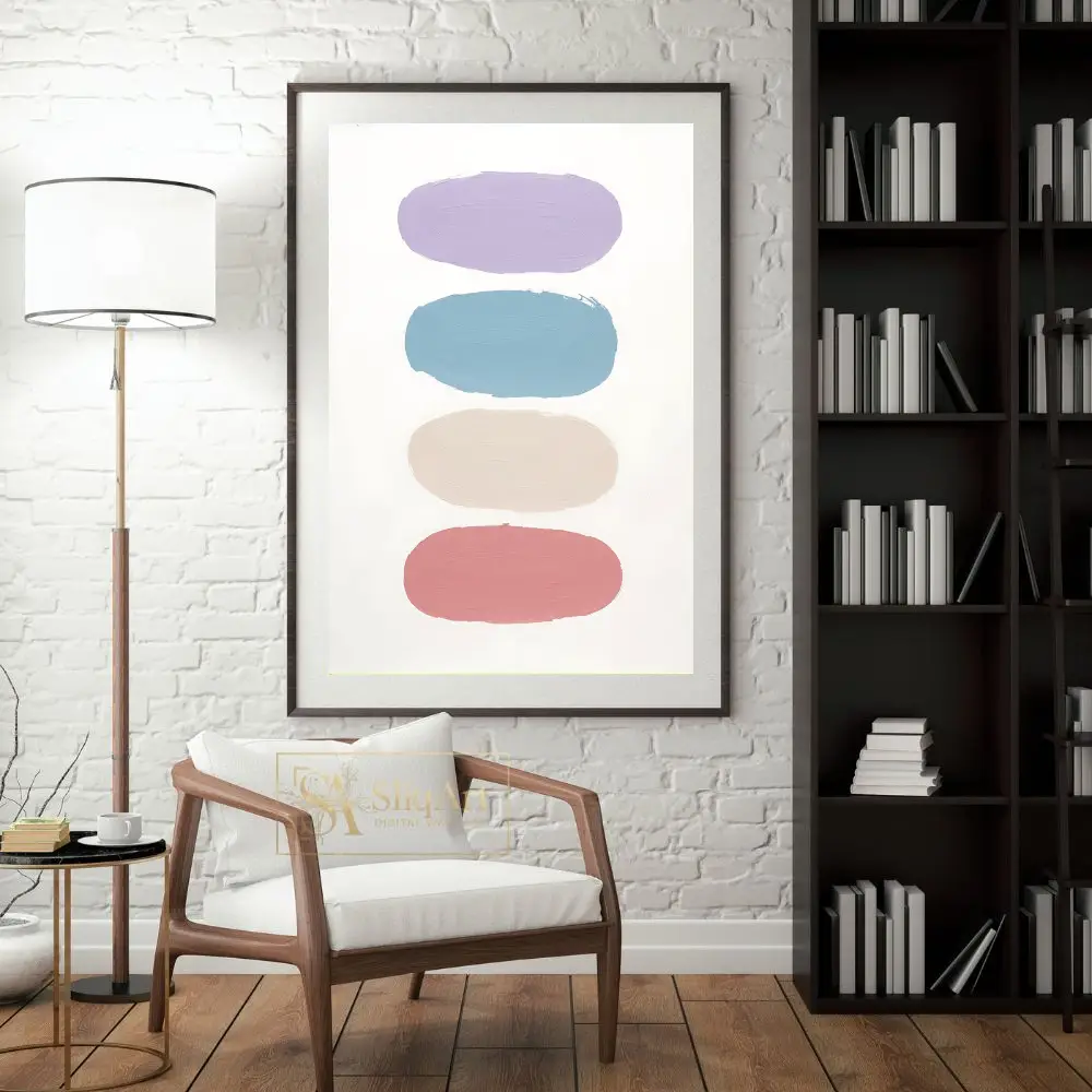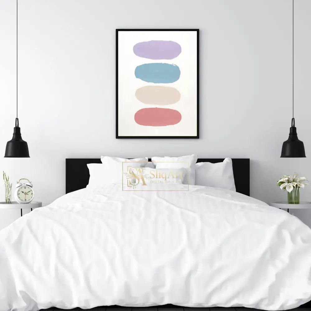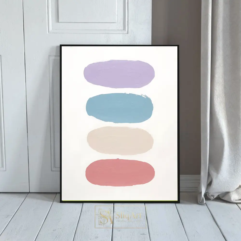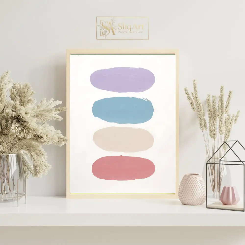 The color palette transitions smoothly from a calming lavender and sky blue to a warm neutral beige and a soft dusty rose, all set against a pristine white background. This piece embodies a sense of balanced serenity, making it an ideal choice for creating a peaceful atmosphere in any contemporary home.