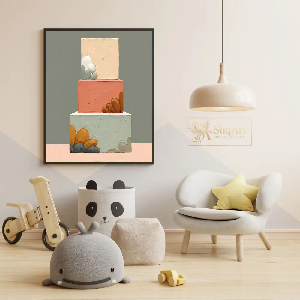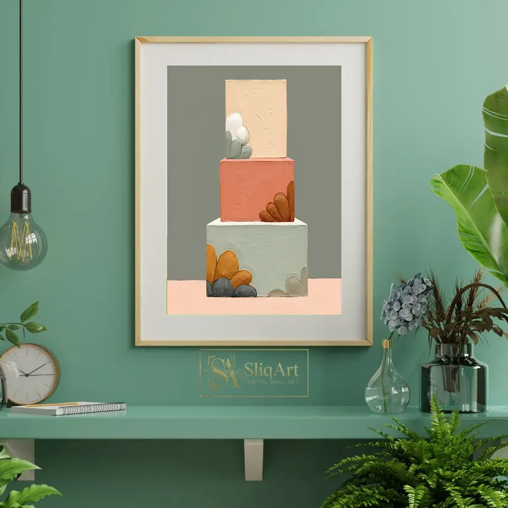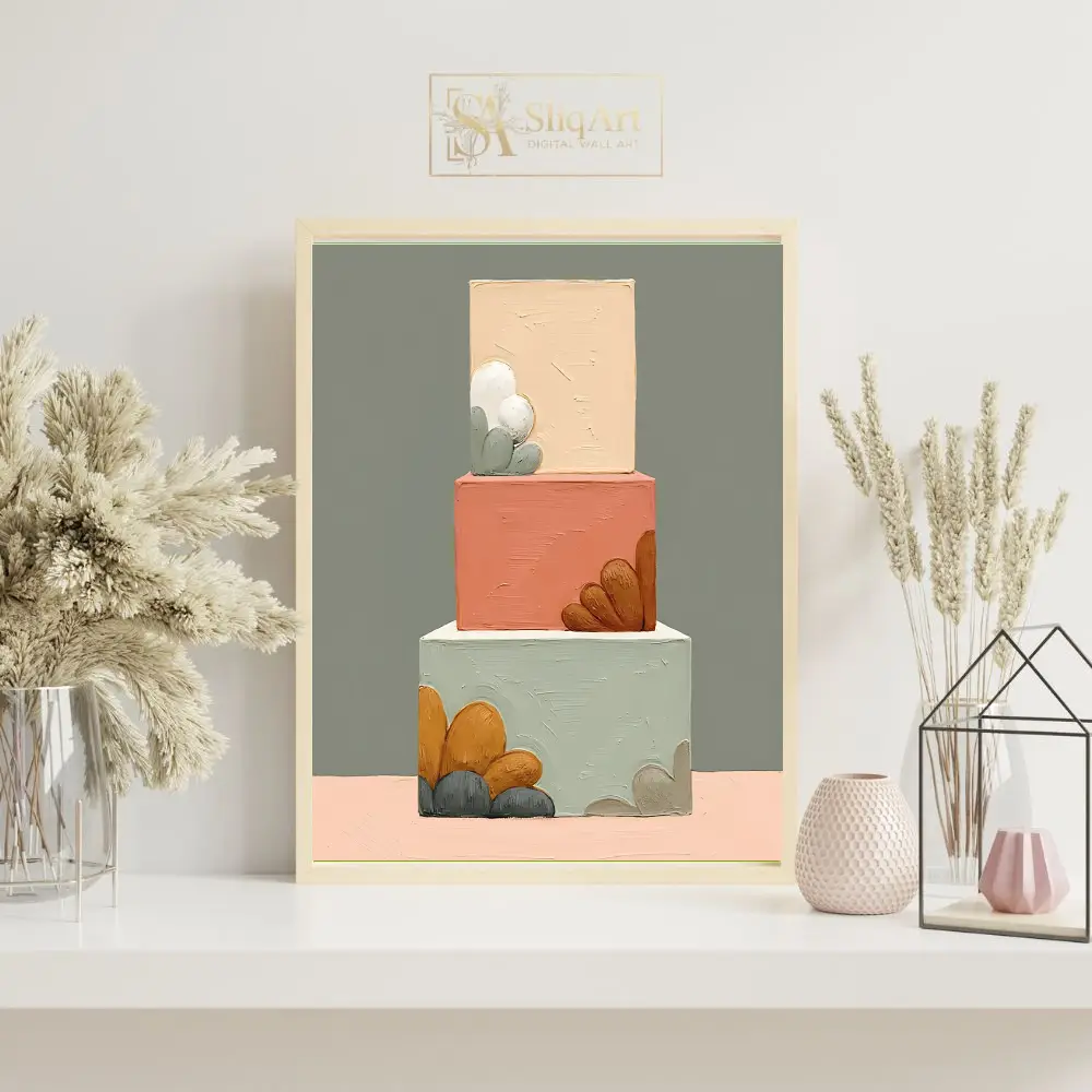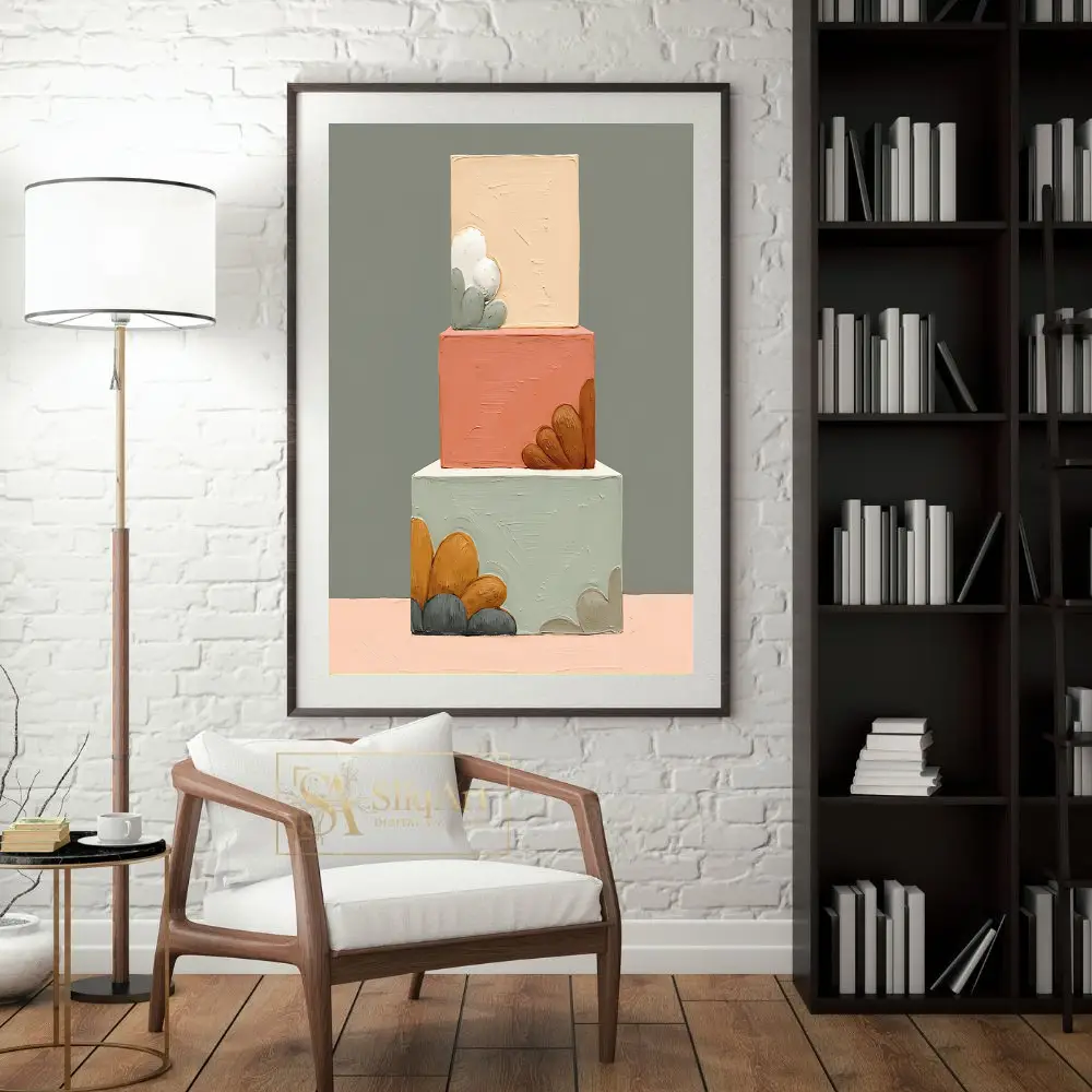 This striking contemporary piece features a vertical arrangement of three geometric blocks, each brought to life with heavy impasto brushstrokes that create a tactile, three-dimensional experience. The color palette is a sophisticated curation of earthy pastels, including sage green, dusty terracotta, and warm beige, accented by organic, petal-like shapes in mustard yellow and charcoal grey.