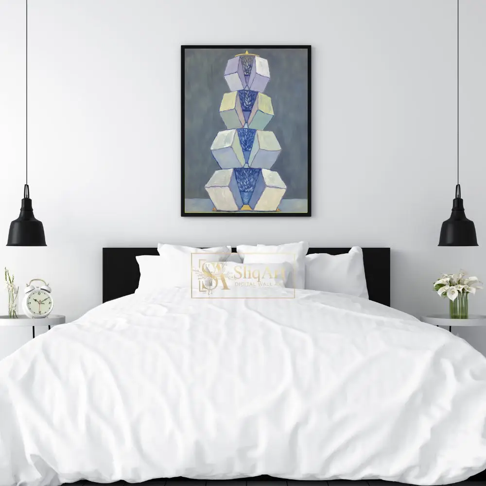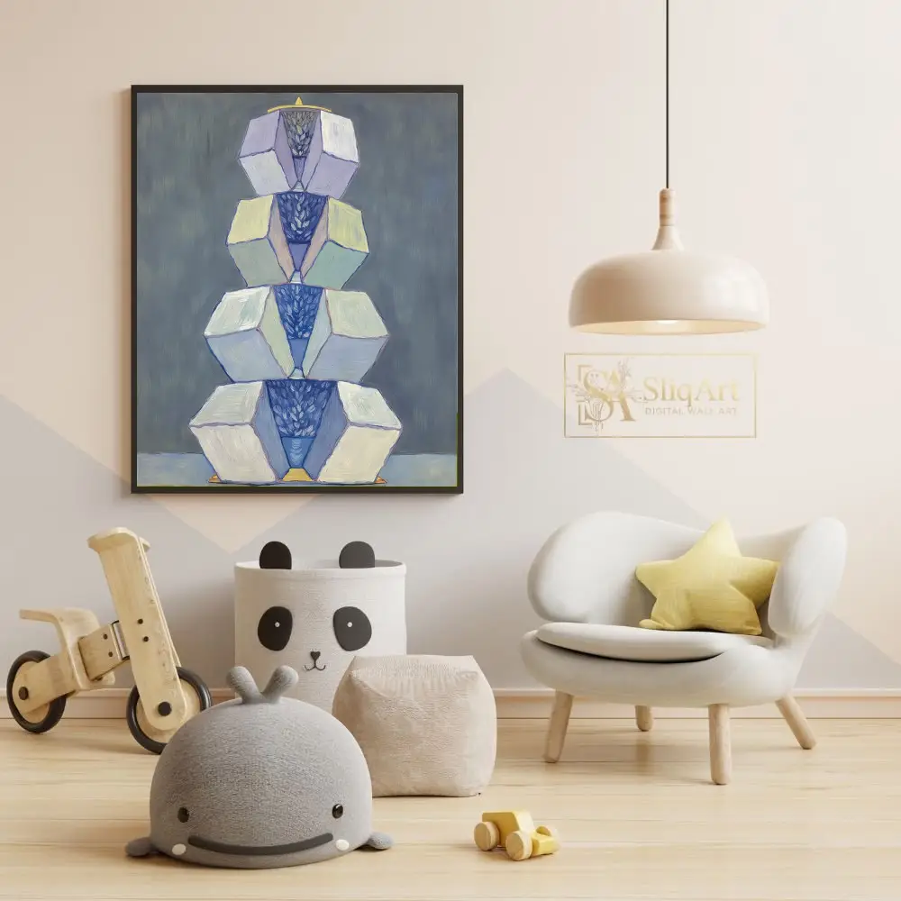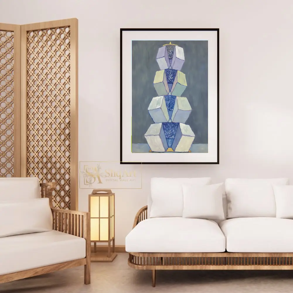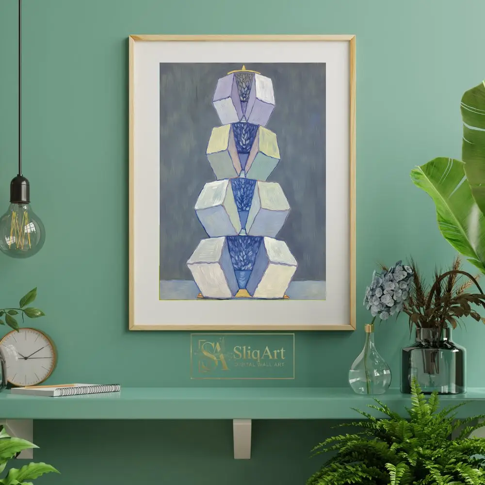 This captivating abstract painting features a vertical arrangement of geometric forms, stacked like a modern totem. The artwork balances sharp-edged cubes with soft, organic patterns of deep blue nestled within the centers.