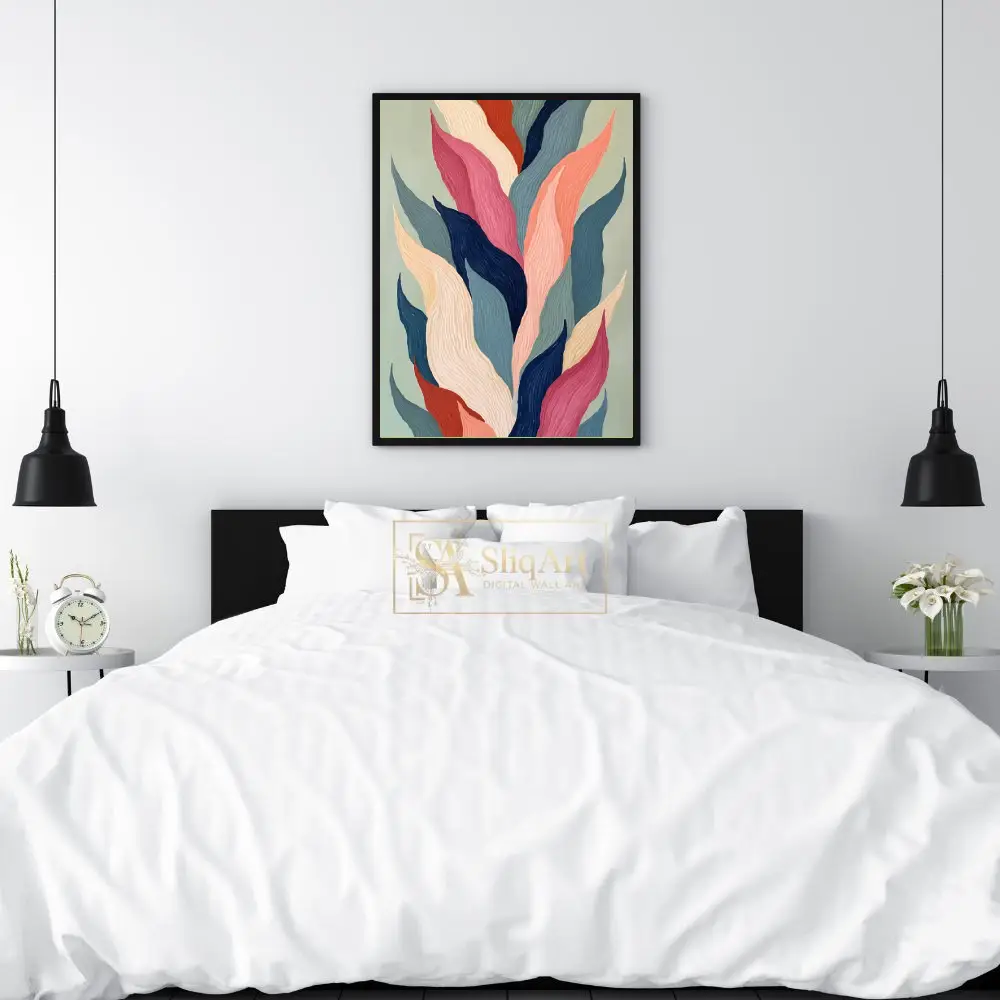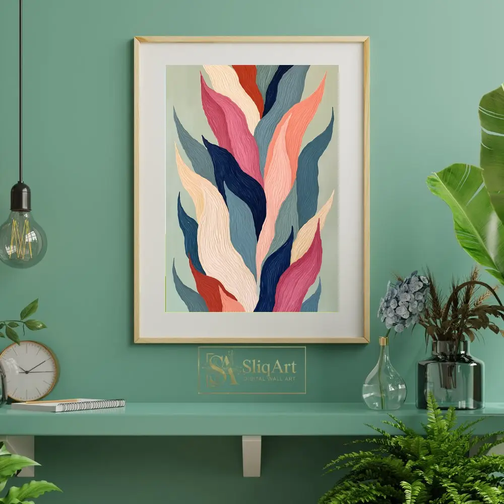 A sophisticated color palette of dusty pink, navy blue, terracotta, and soft sage green provides a balanced aesthetic that bridges the gap between modern minimalism and vibrant expressionism. This piece serves as a stunning focal point, drawing the eye with its vertical energy and harmonious organic patterns.