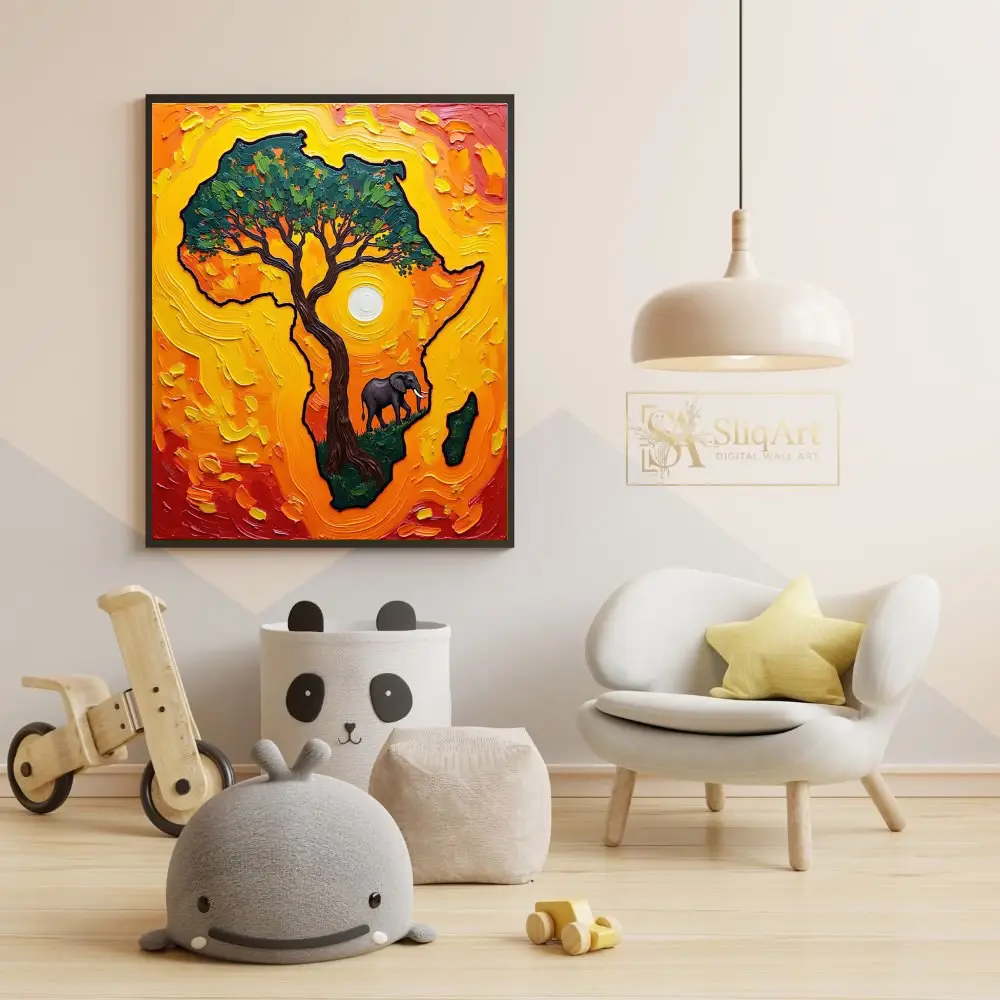 Celebrate the spirit of the savannah with this striking impasto-style painting. The artwork showcases the bold outline of the African continent, filled with a vibrant, textured sunset.