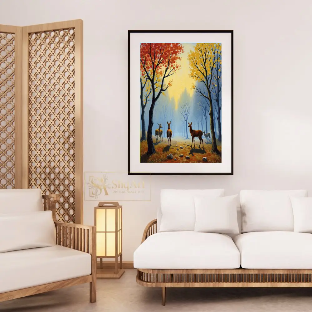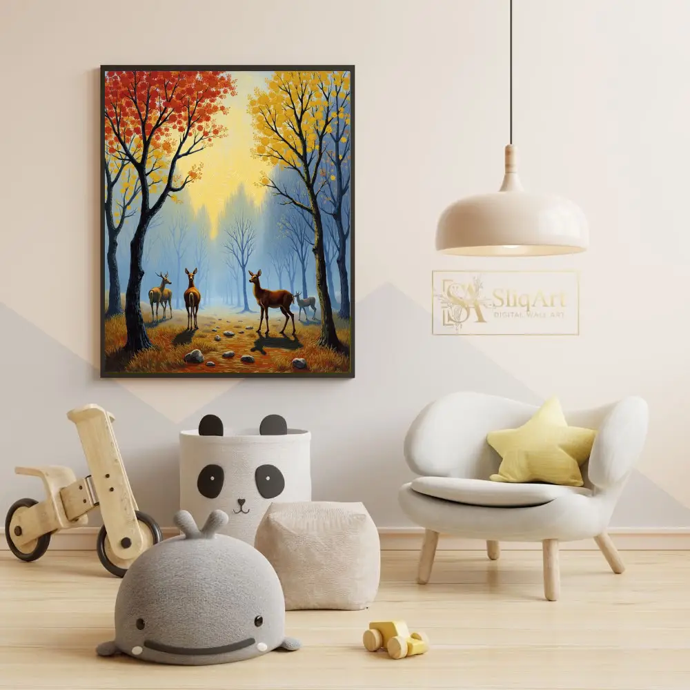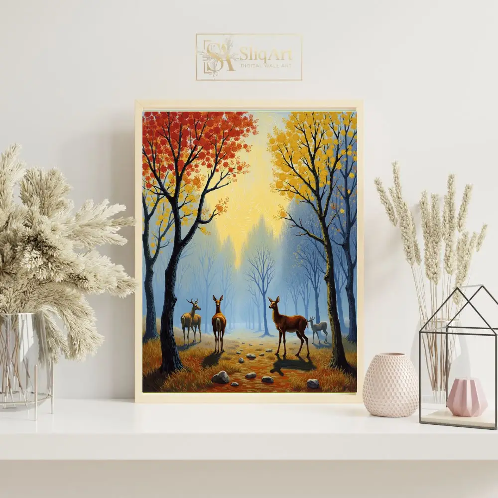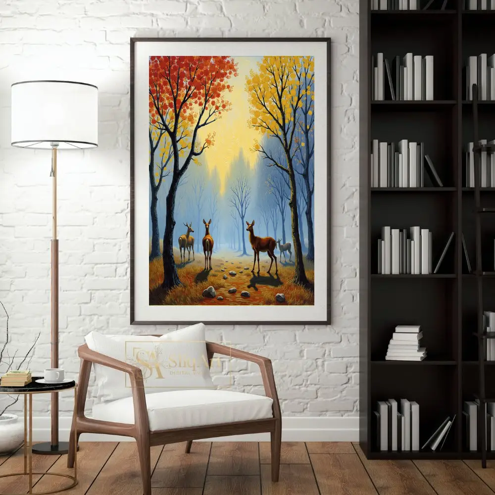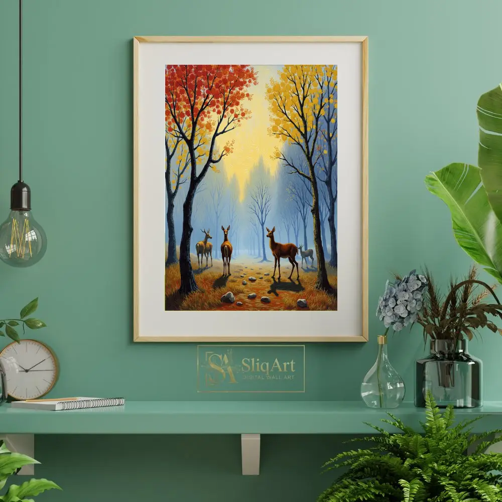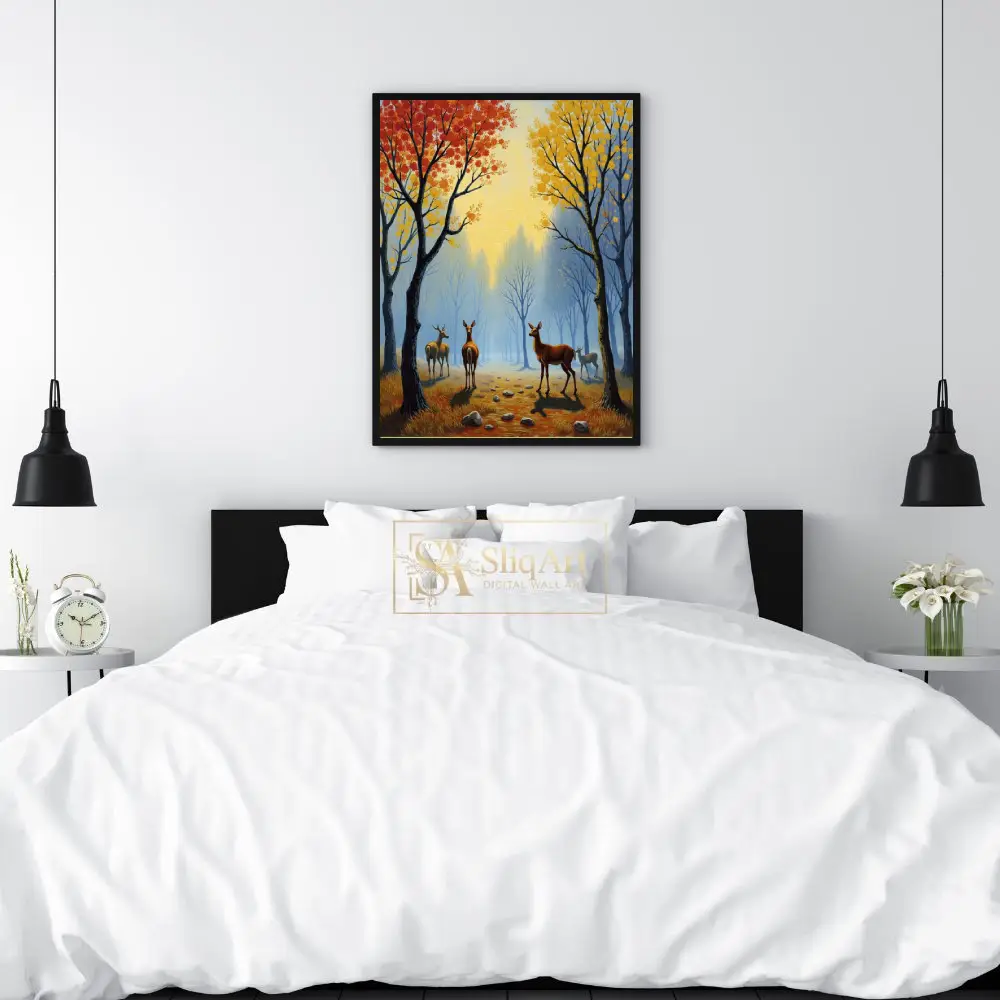 Transform your space with the ethereal beauty of this ‘Misty Autumn Forest’ art piece. This captivating work features a graceful group of deer in a sun-drenched woodland clearing.