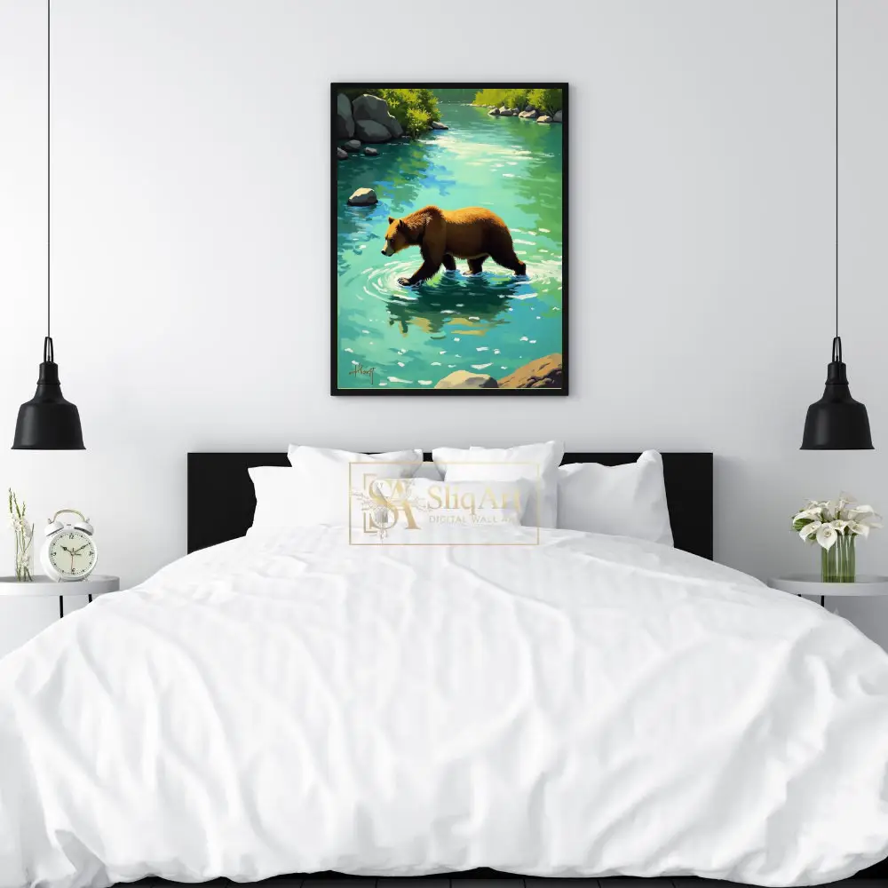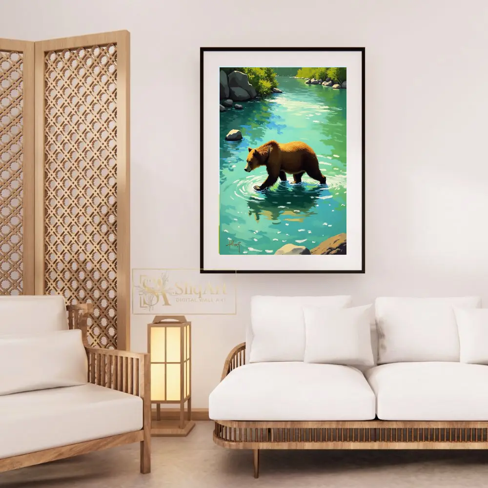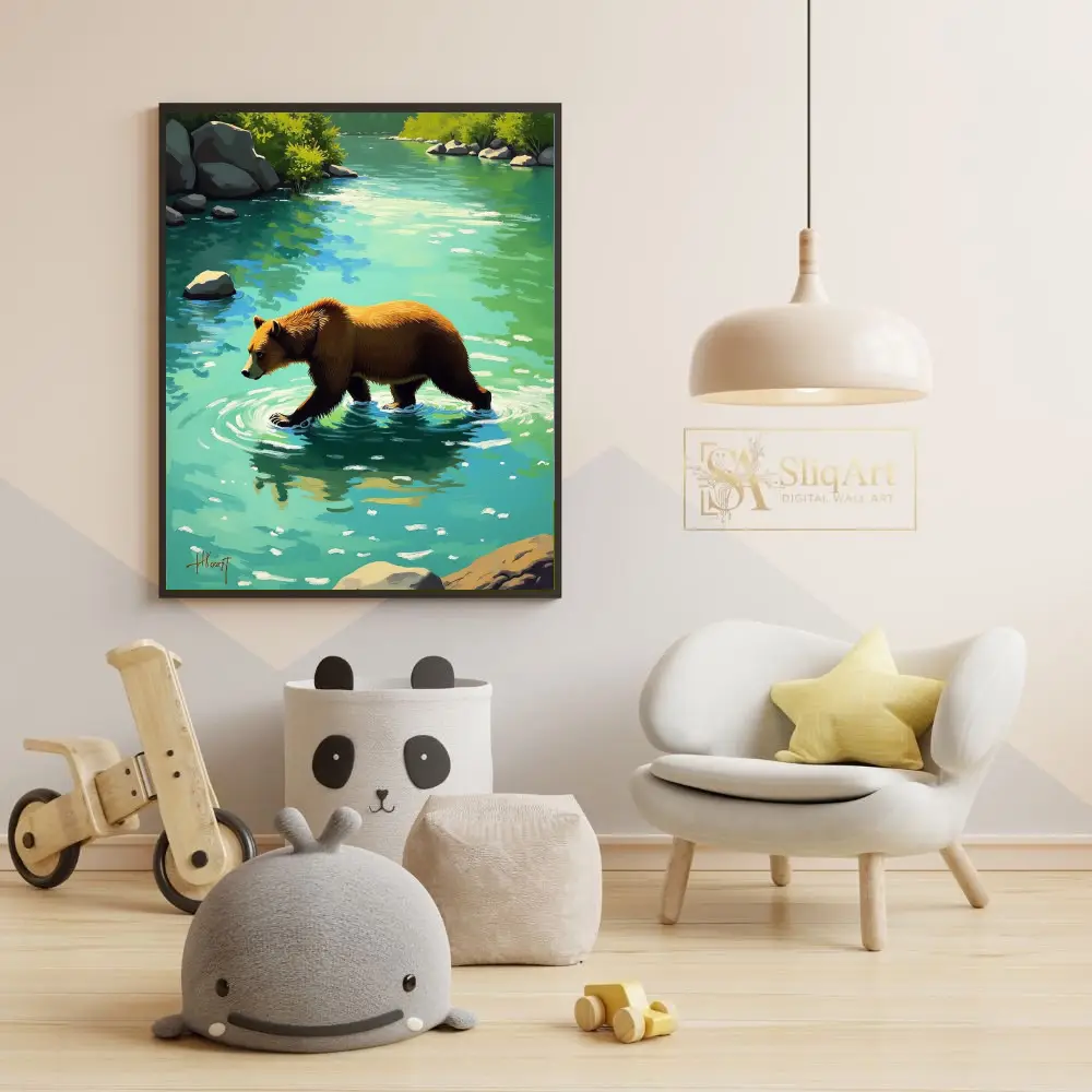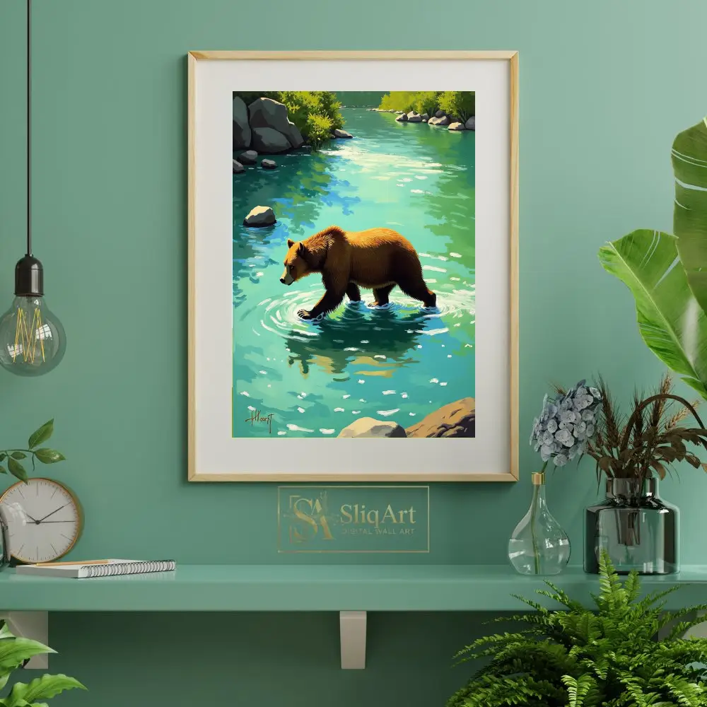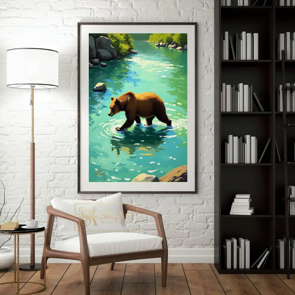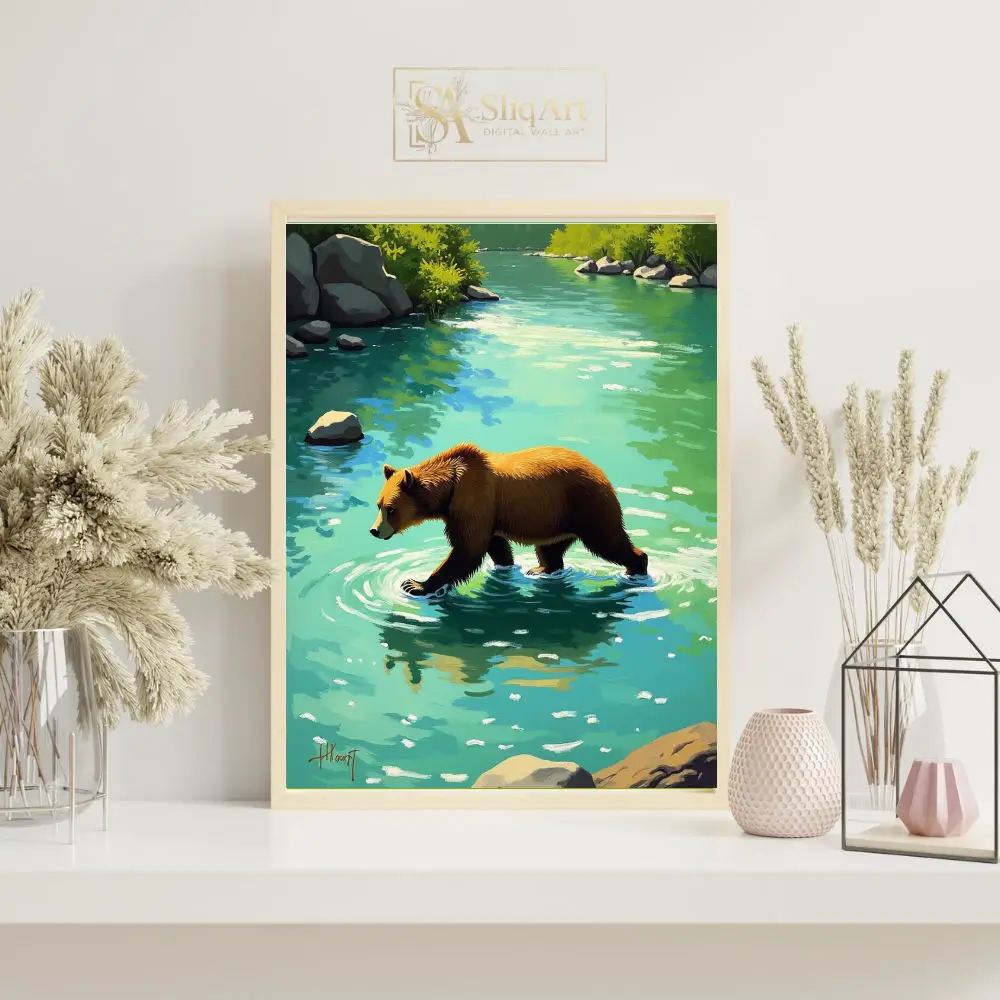 Experience the tranquil power of nature with this stunning digital painting of a brown bear wading through a vibrant turquoise river. The artwork captures a peaceful moment in the wilderness, featuring textured brushstrokes that bring life to the bear’s fur and the rhythmic ripples in the water.