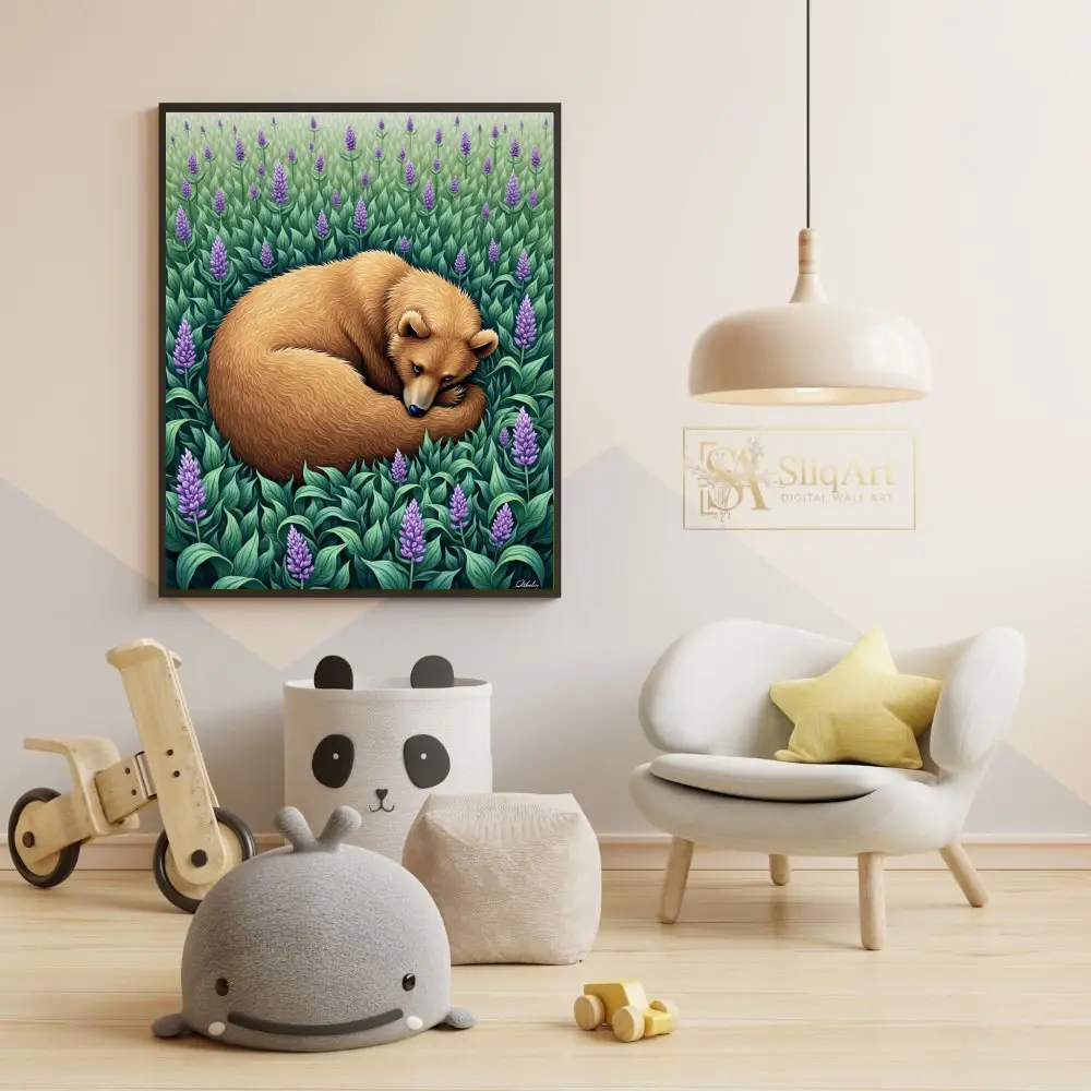 This enchanting piece captures the serene moment of a golden-brown bear peacefully curled up in a lush, stylized field of green foliage and upright purple blossoms. The artwork features a unique, rhythmic pattern in the vegetation, creating a hypnotic and calming atmosphere.