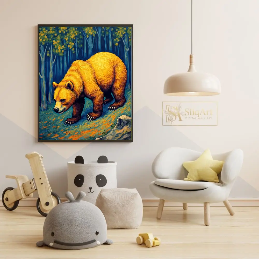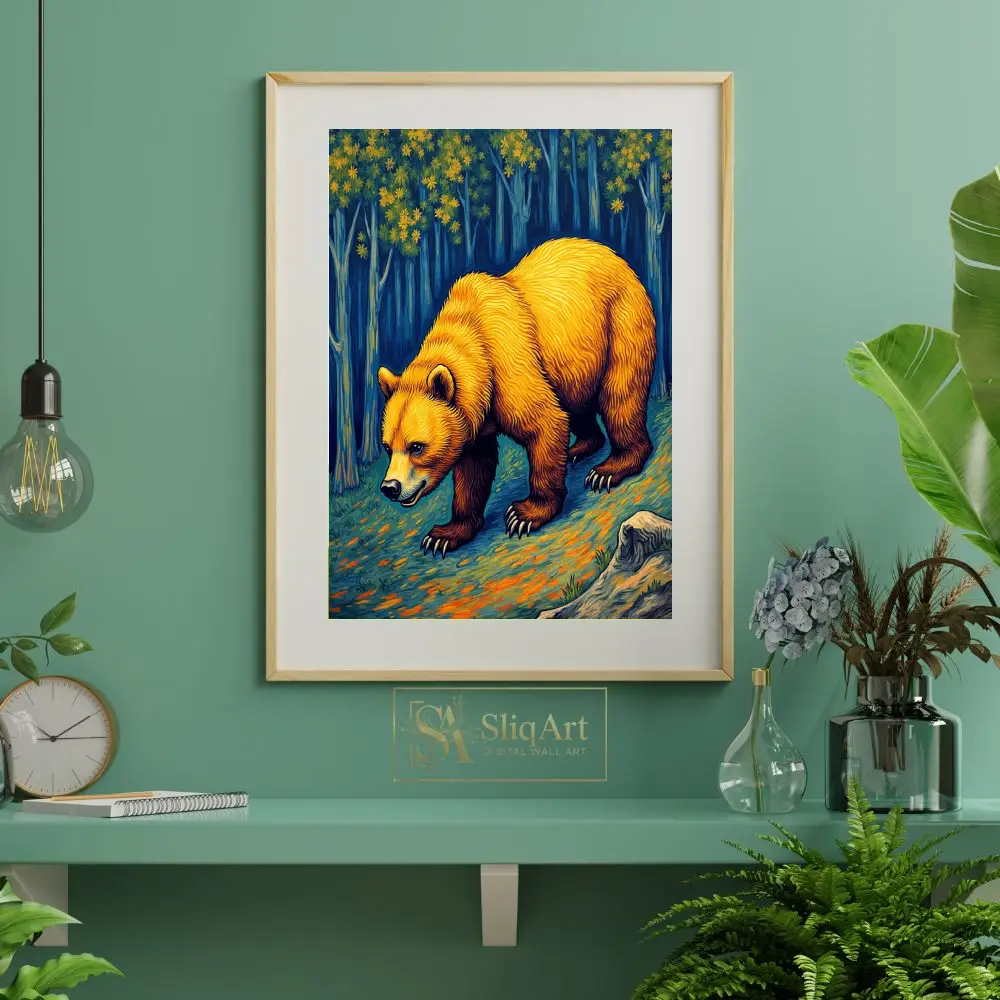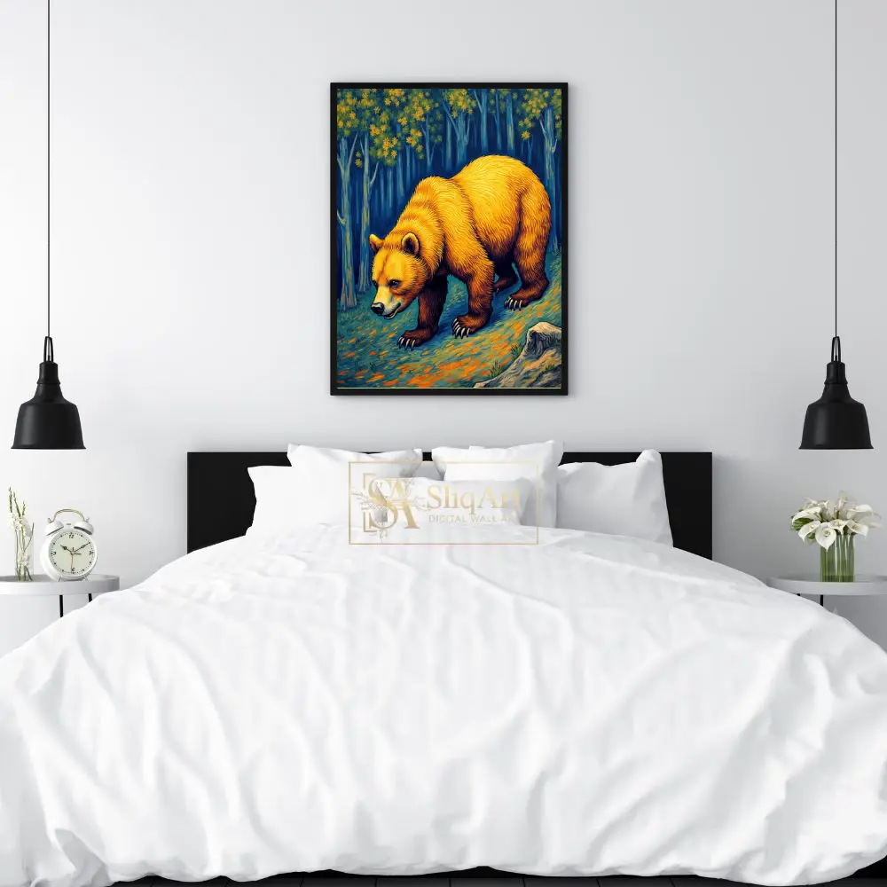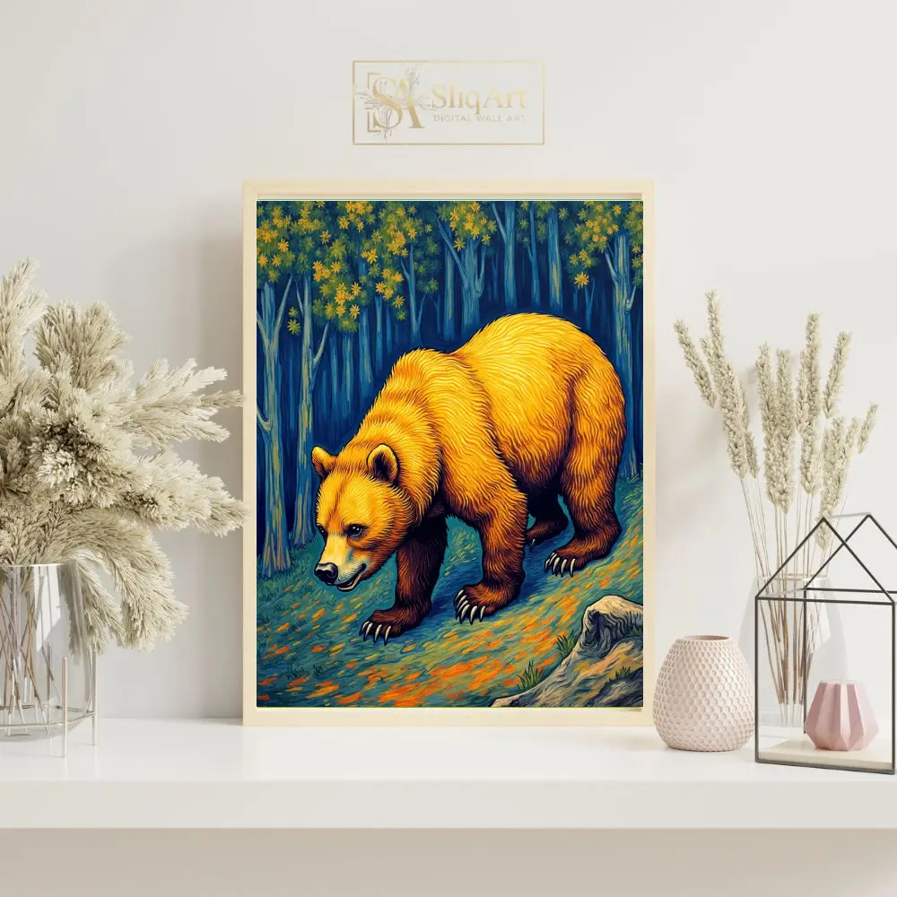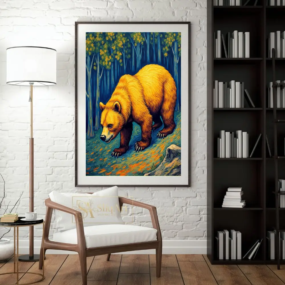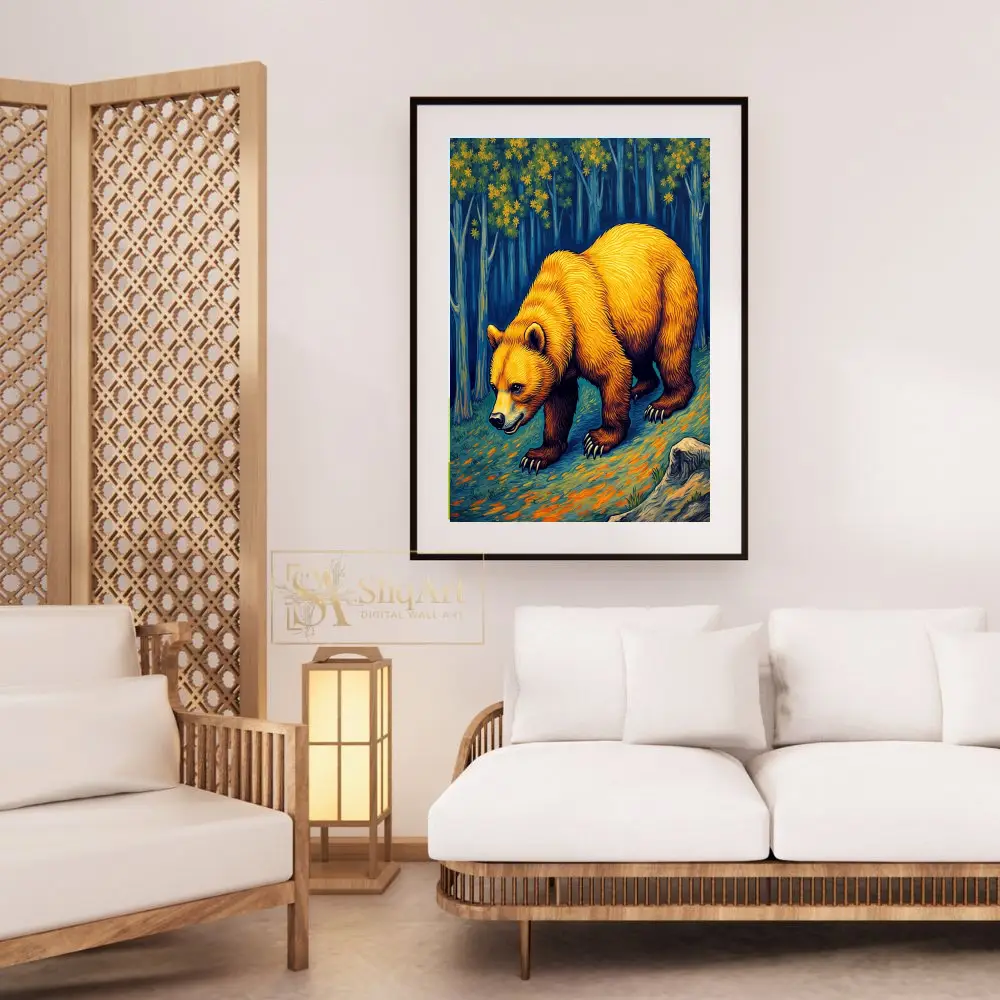 Bring the raw energy of nature into your home with the ‘Golden Guardian.’ This striking canvas features a majestic bear rendered in vibrant yellow and amber tones, walking through a deep, indigo forest.