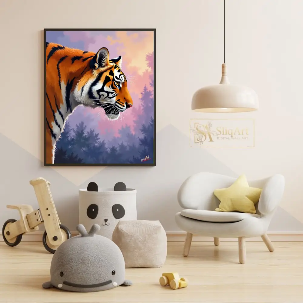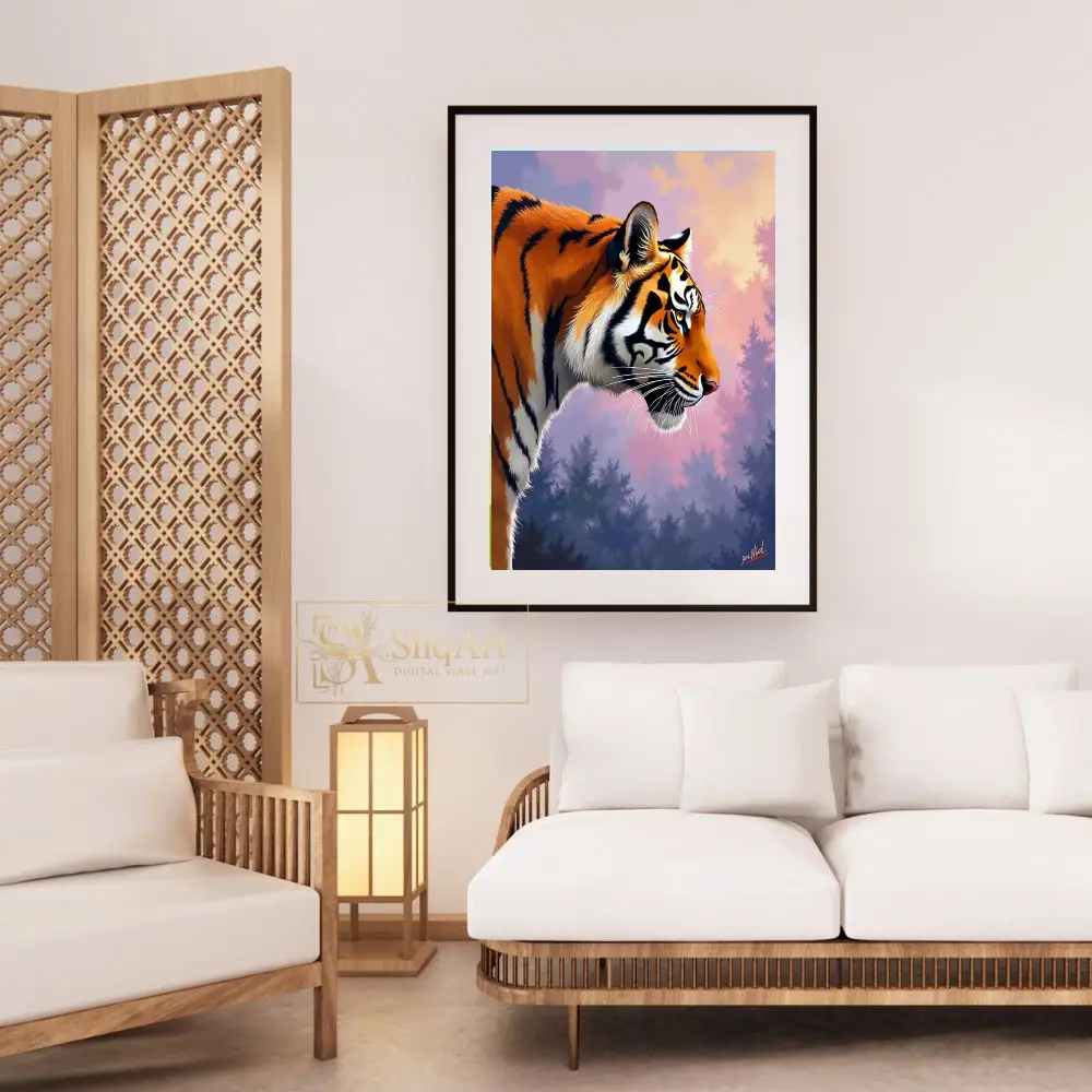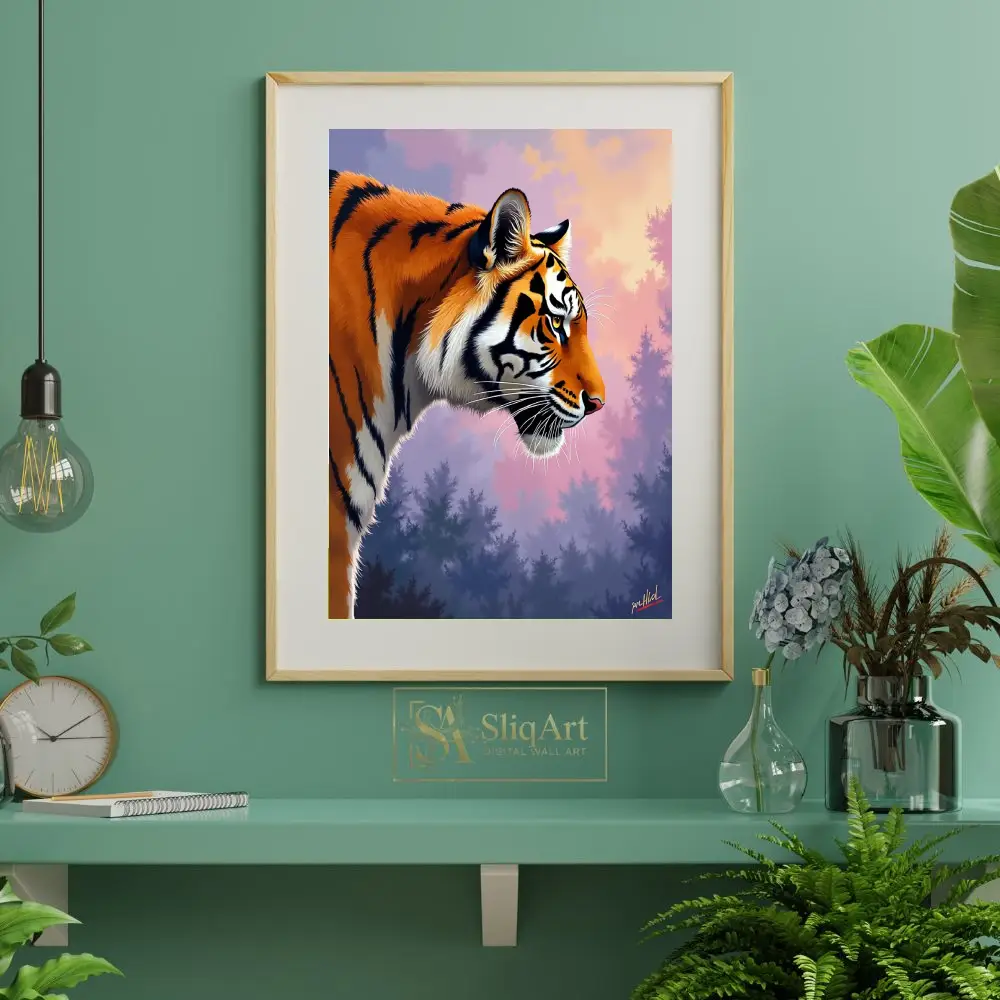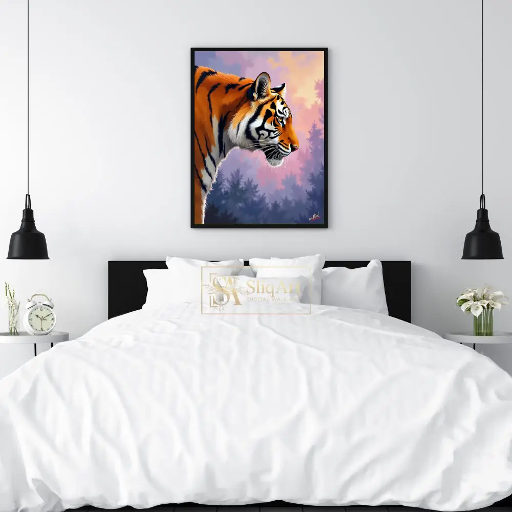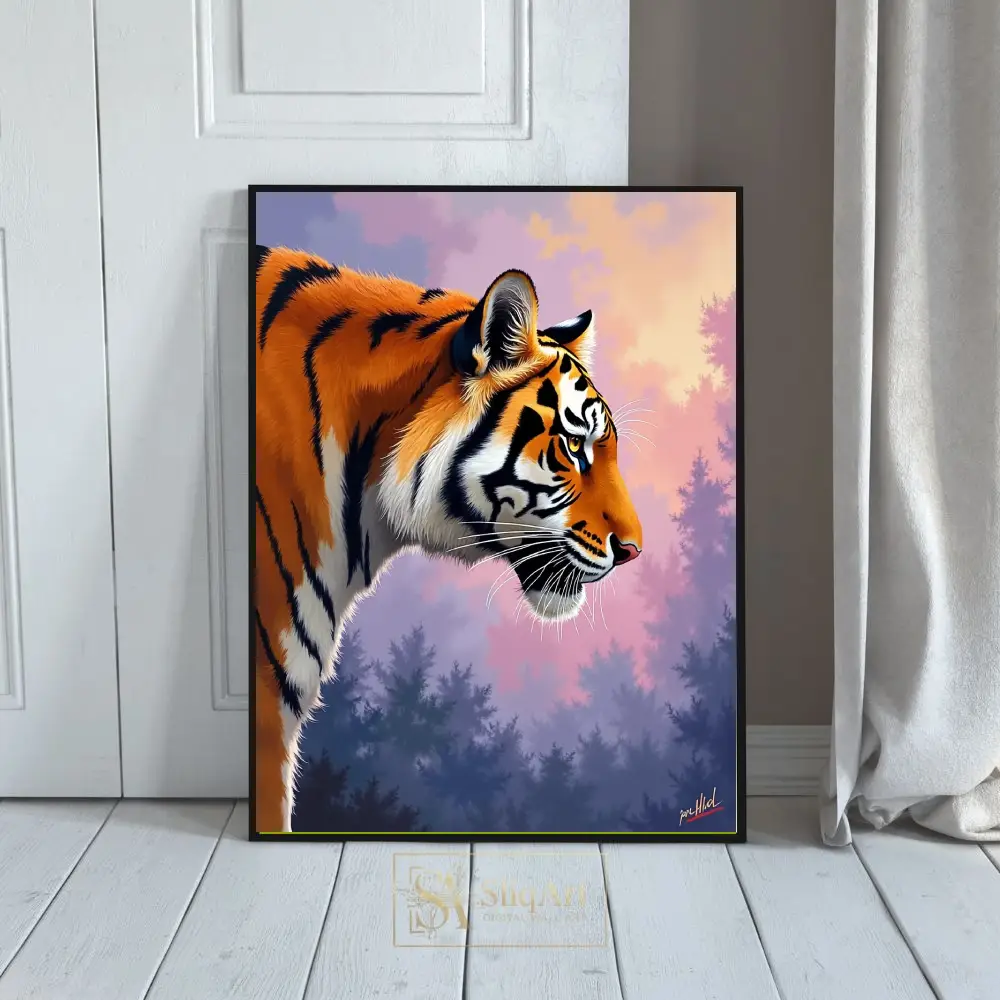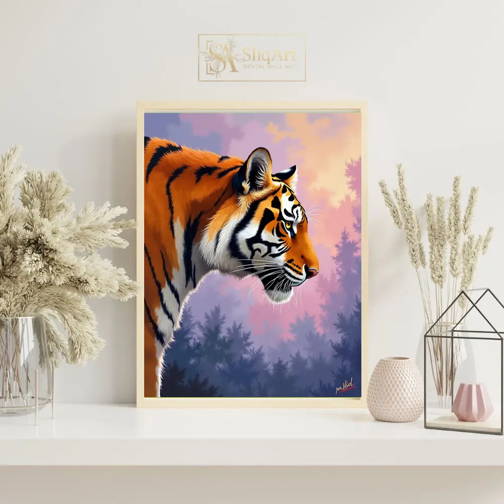 The tiger stands against a dreamlike, atmospheric forest backdrop bathed in the soft, ethereal light of a purple and pink sunset. This piece combines the raw power of nature with a sophisticated color palette, creating a serene yet striking visual experience for any modern interior.