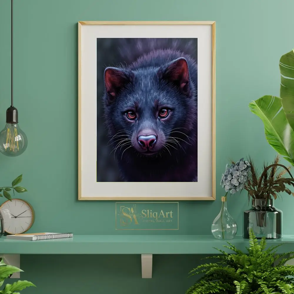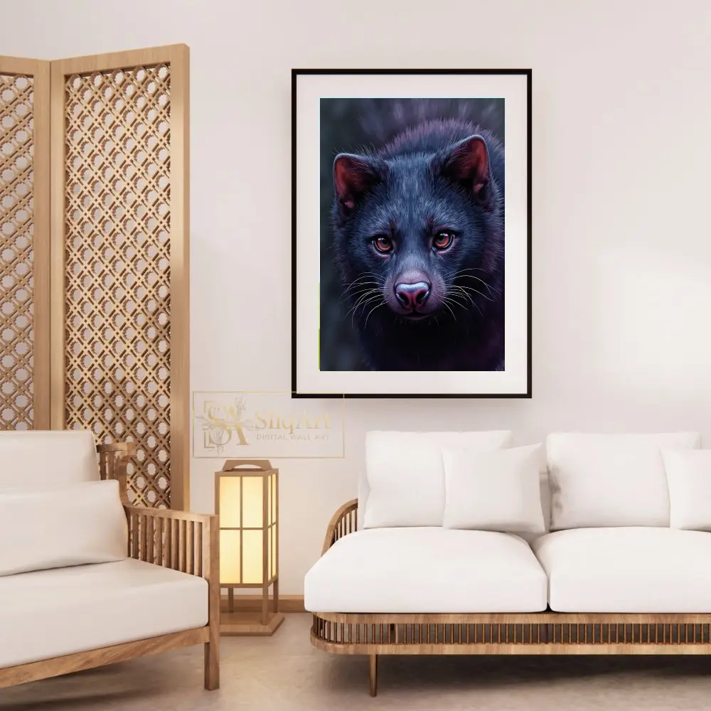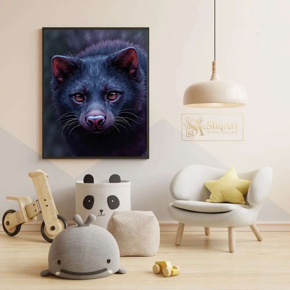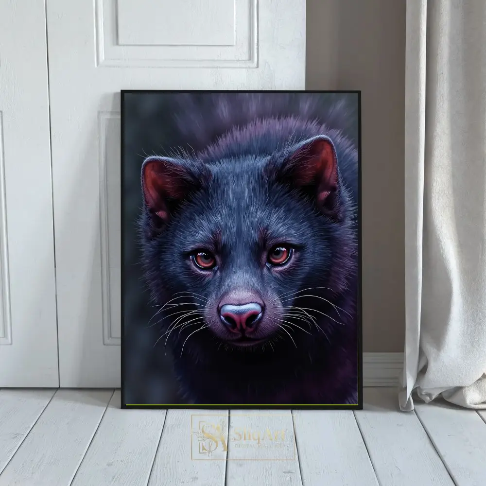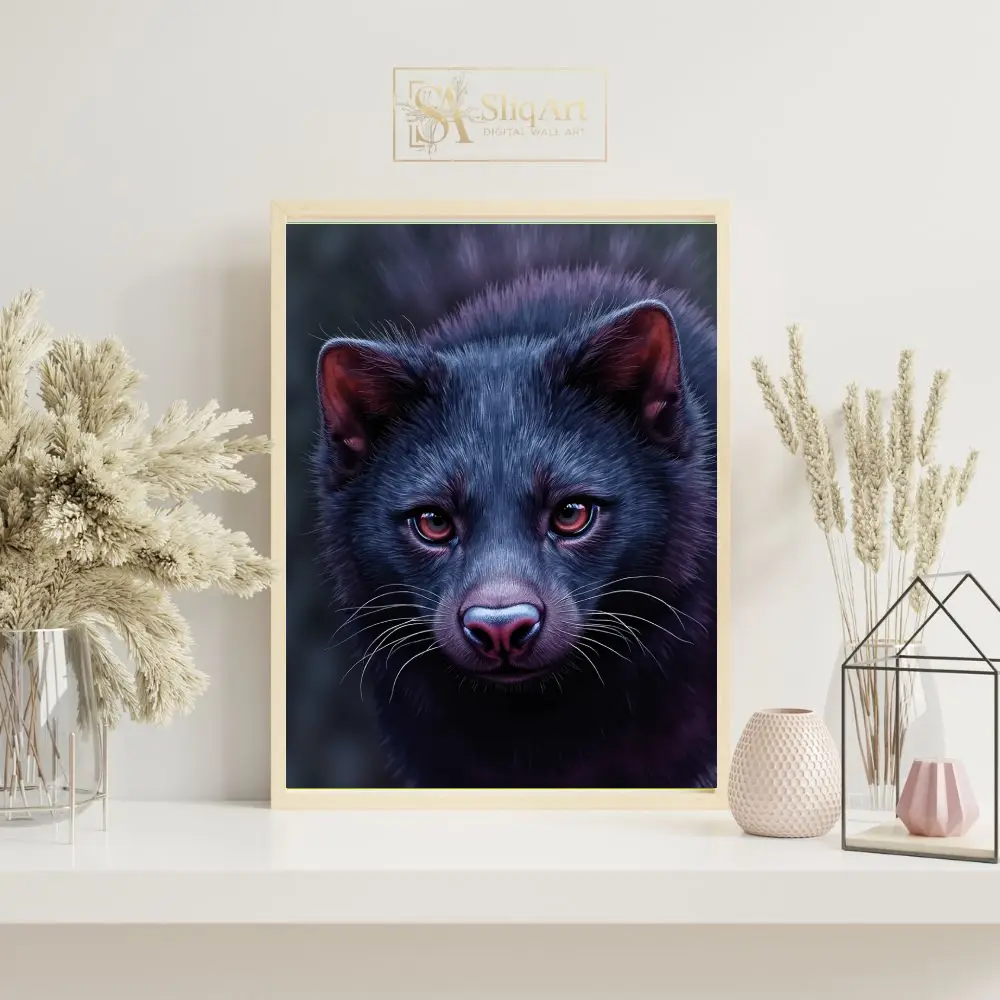 This striking digital painting captures the intense, soul-piercing gaze of a Tasmanian Devil emerging from a dark, atmospheric backdrop. Rendered with hyper-realistic detail, every strand of its deep charcoal and plum-tinted fur is meticulously defined, creating a tactile quality that brings the creature to life.