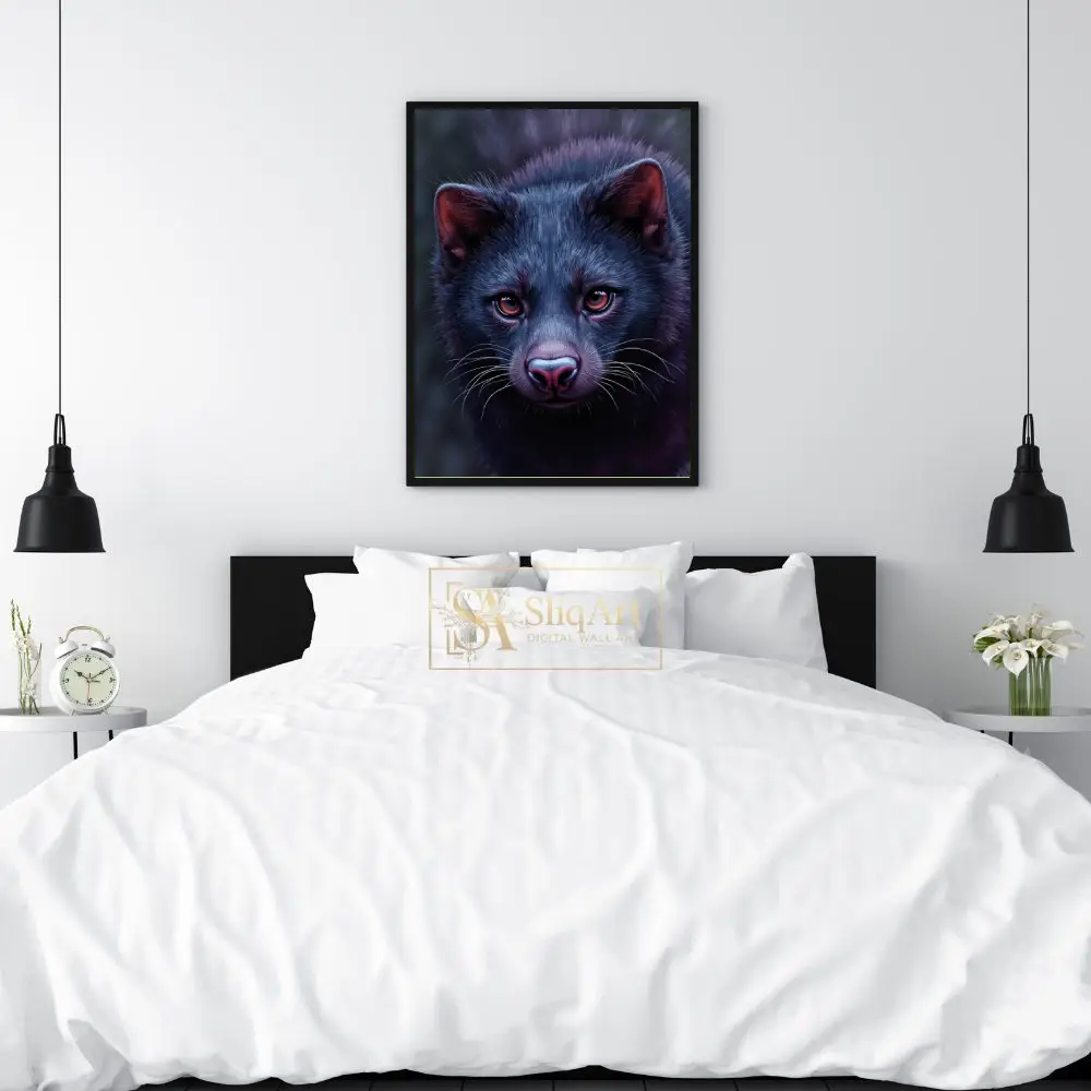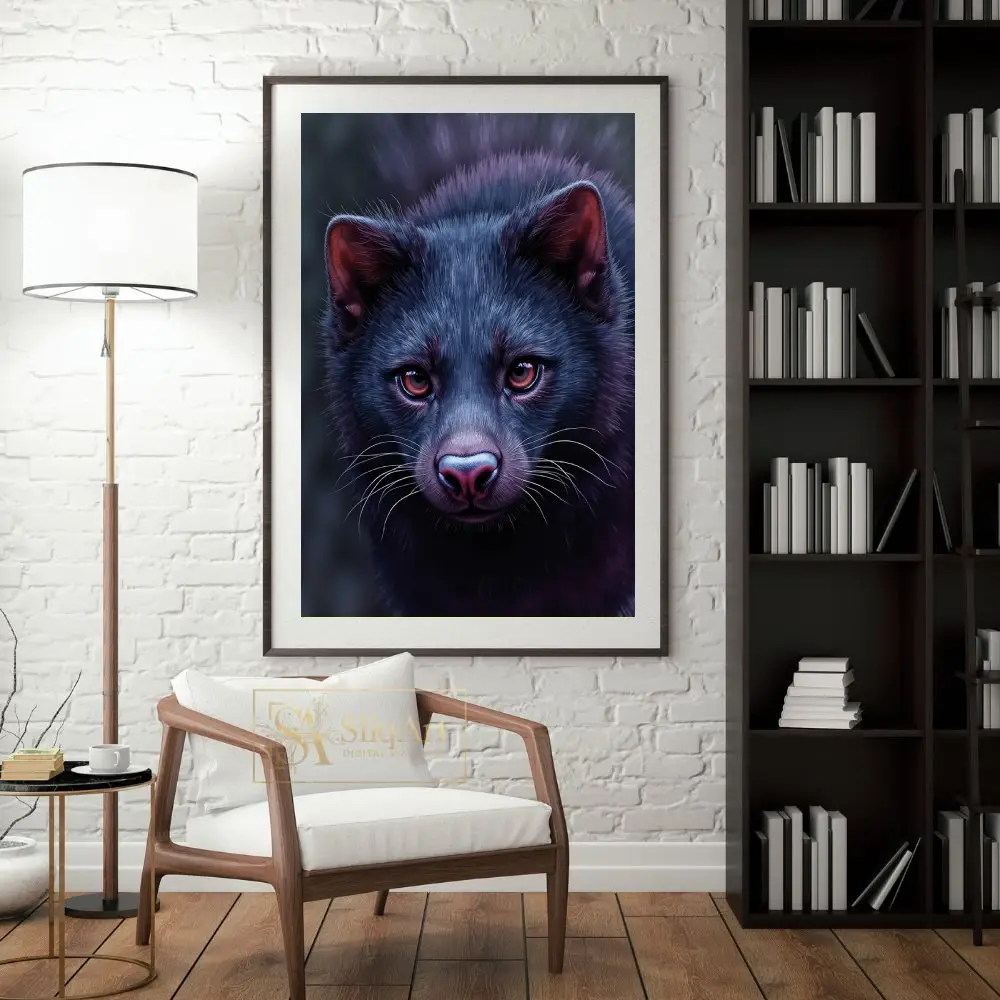 The moody color palette of midnight purple, indigo, and deep black is punctuated by the vivid, amber-red hues of the eyes and the soft pink of the nose, resulting in a piece that is both haunting and majestic. It represents a bold fusion of wildlife photography precision with fine art digital painting techniques.