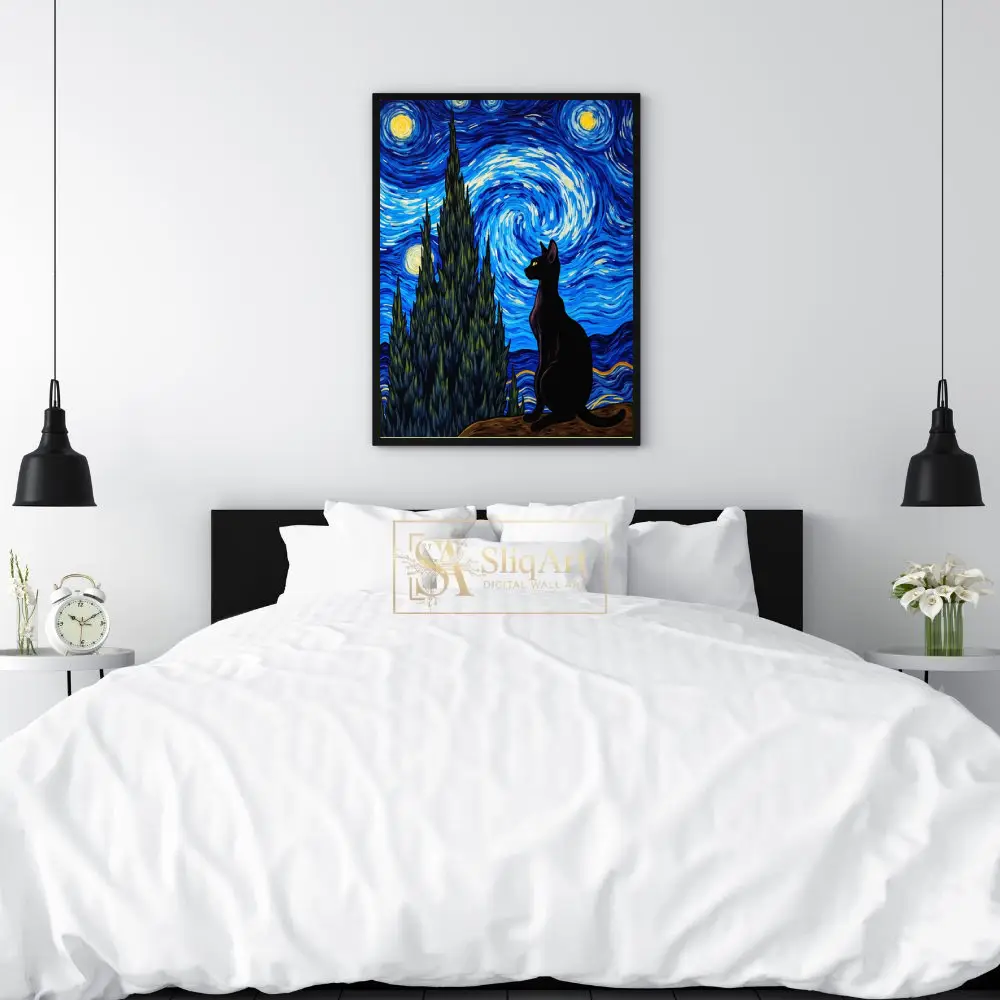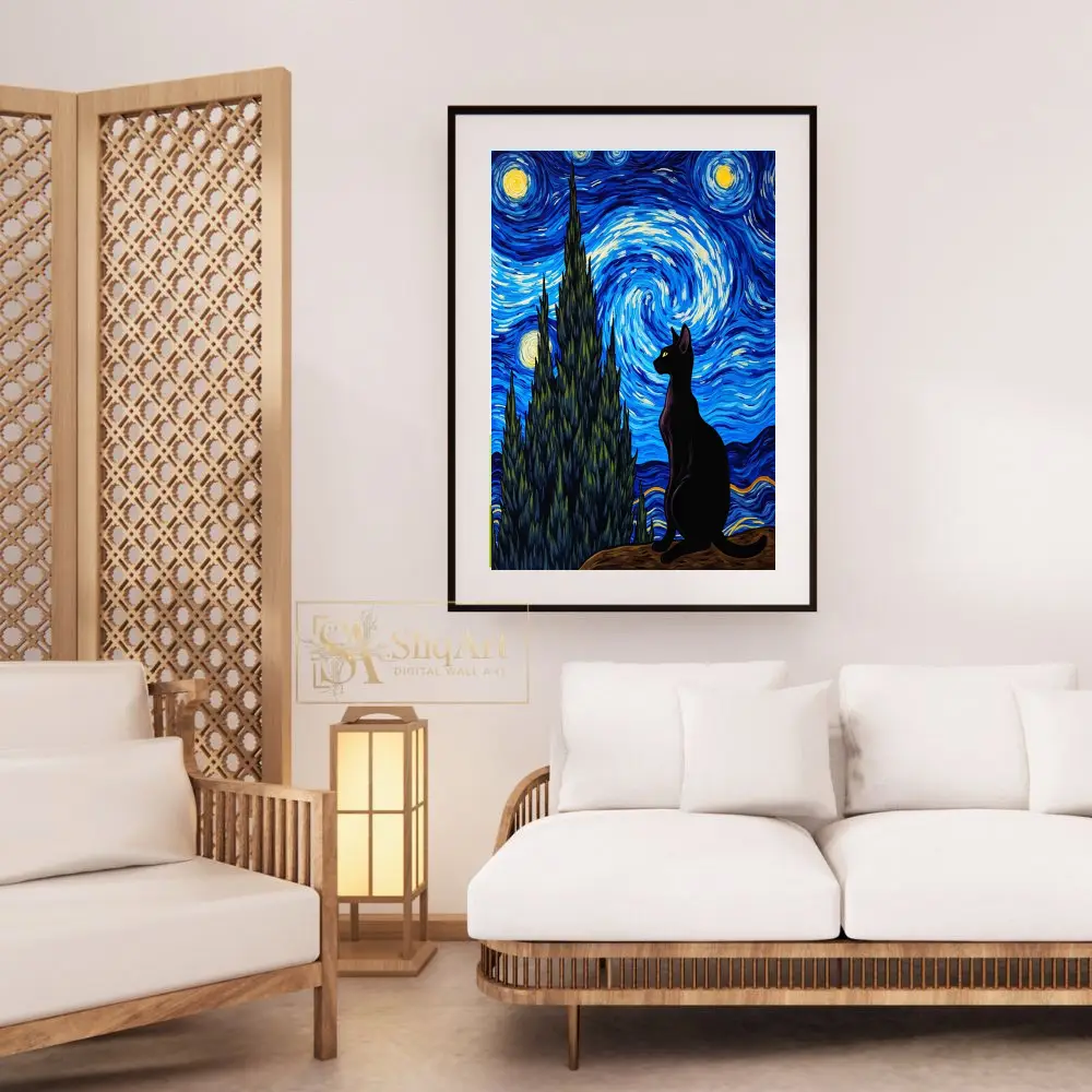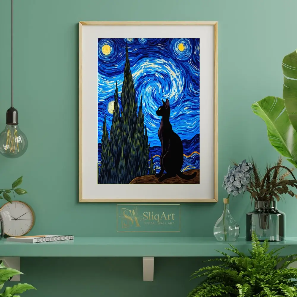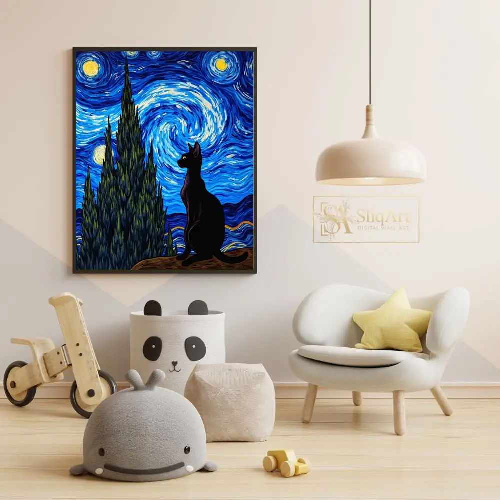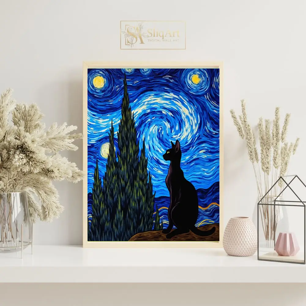 Experience a whimsical fusion of art history and feline charm with this ‘Starry Night Cat’ masterpiece. Inspired by the iconic brushwork of Vincent van Gogh, this piece features a sleek black cat sitting in silent contemplation beneath a swirling celestial sky.