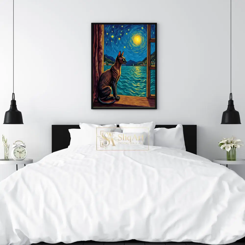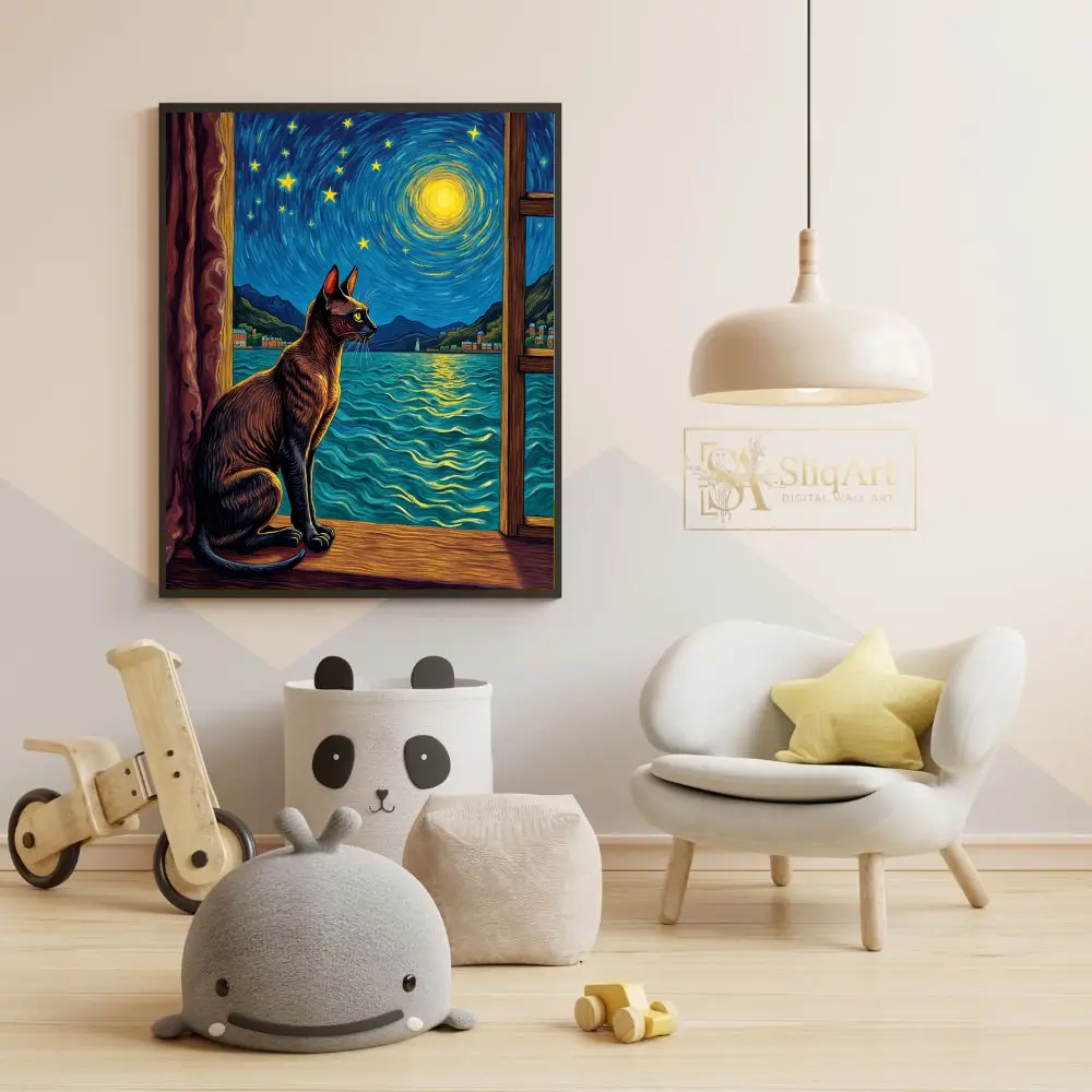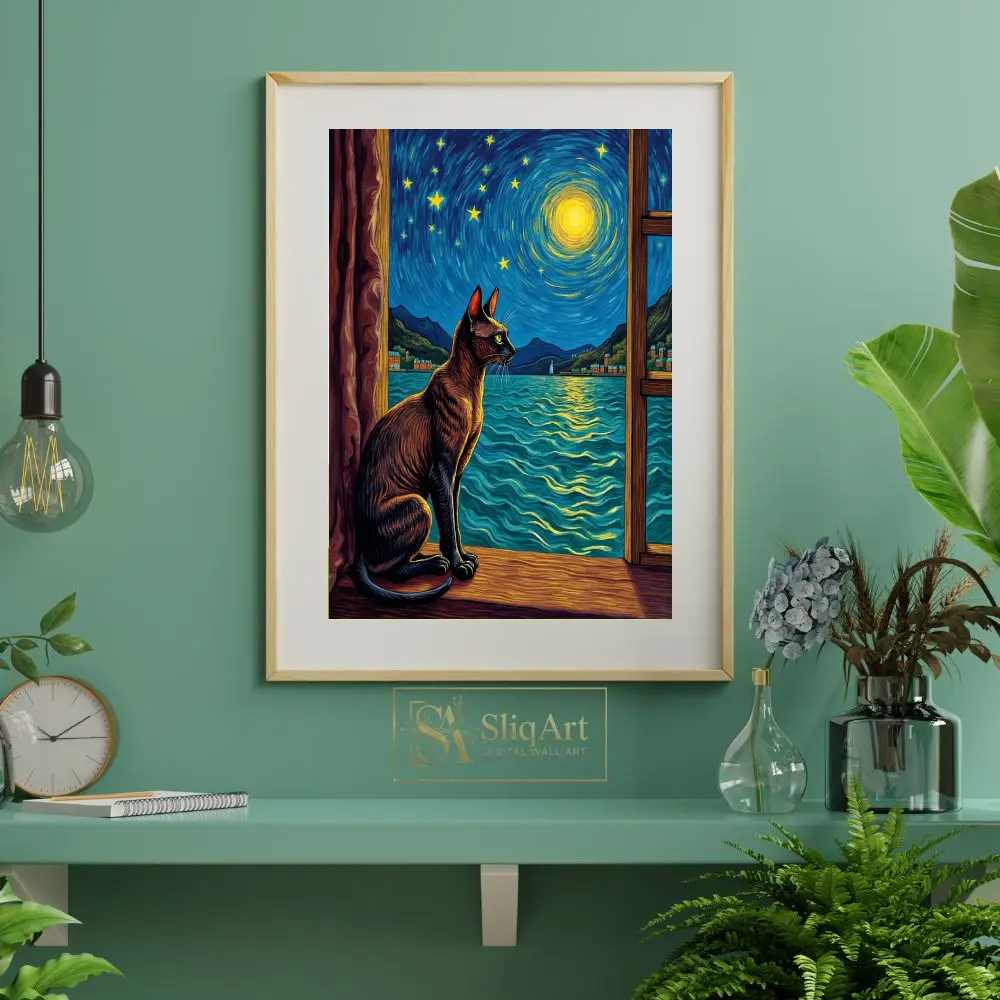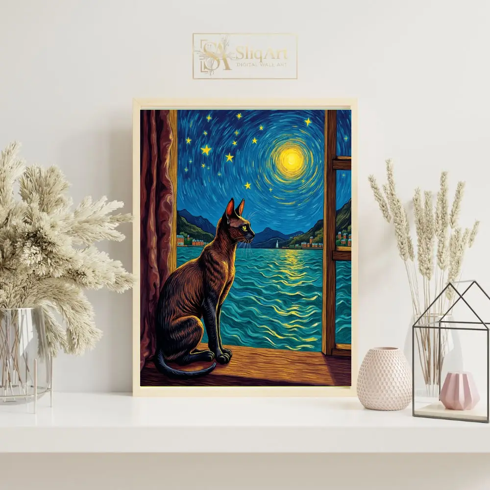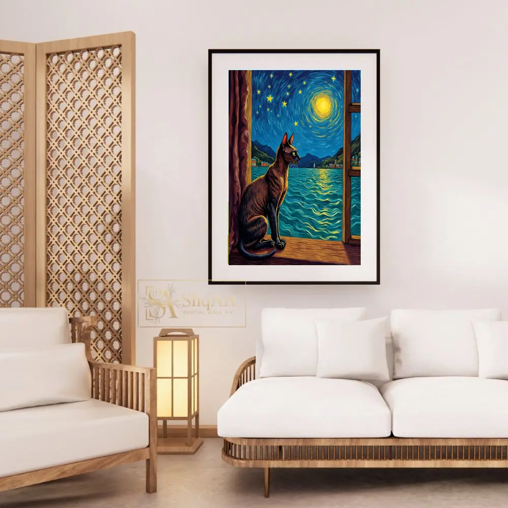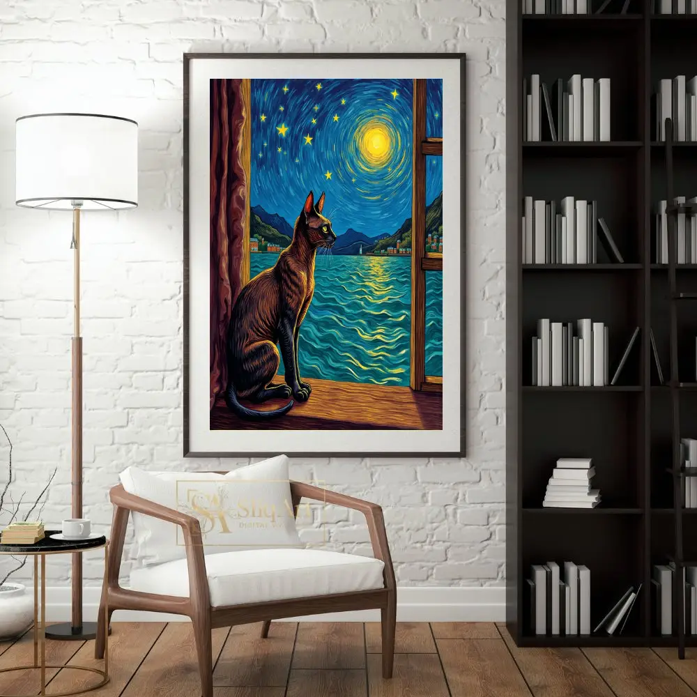 This exquisite piece of wall art blends the charm of a curious feline with the timeless beauty of Van Gogh’s signature style. Featuring a sleek cat silhouetted against a vibrant, swirling night sky, the composition invites viewers into a world of nocturnal wonder.
