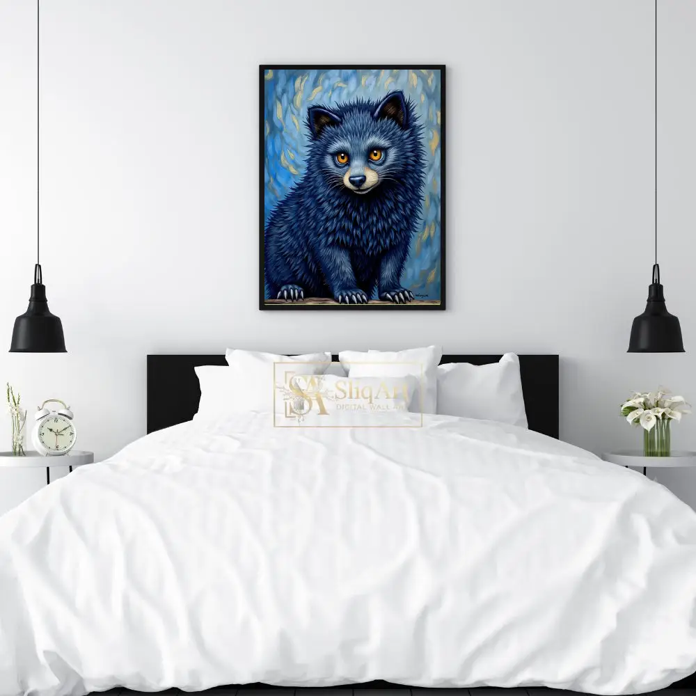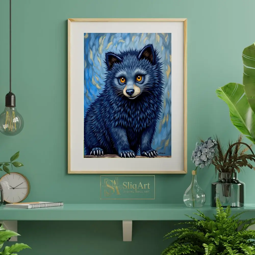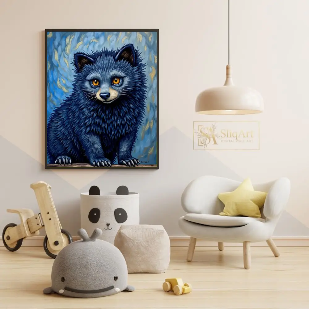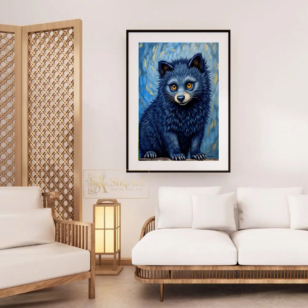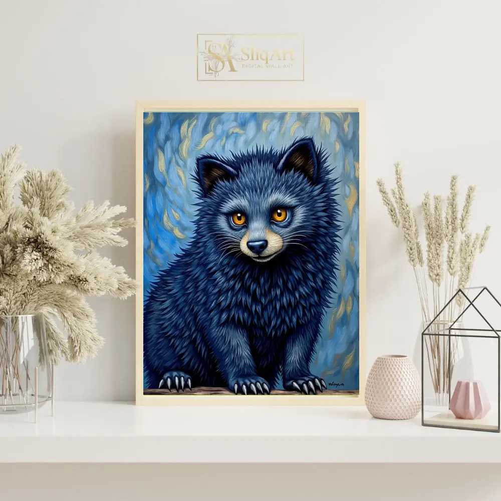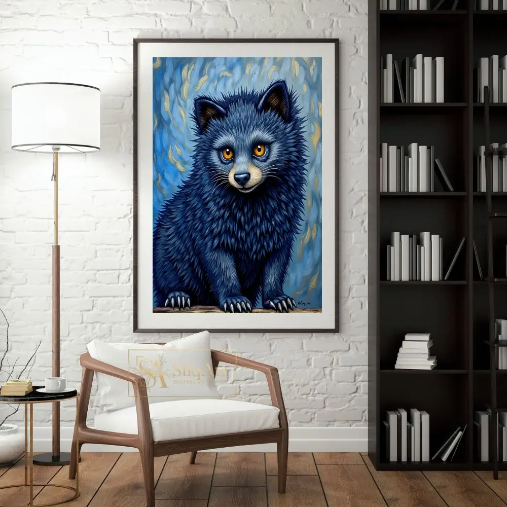 Add a touch of nocturnal mystery to your home with this captivating impressionist-style art piece. Featuring a fluffy, dark blue creature with piercing amber eyes, this artwork utilizes rhythmic, swirling brushstrokes reminiscent of Vincent van Gogh’s iconic style.