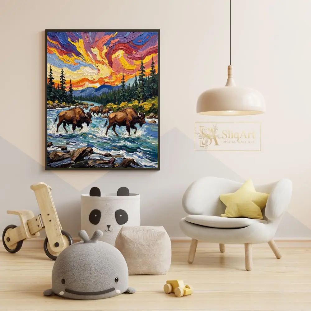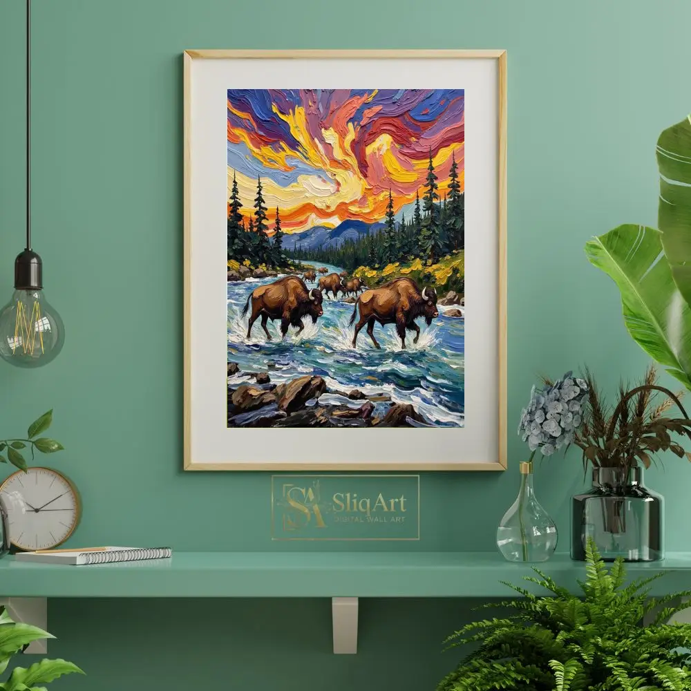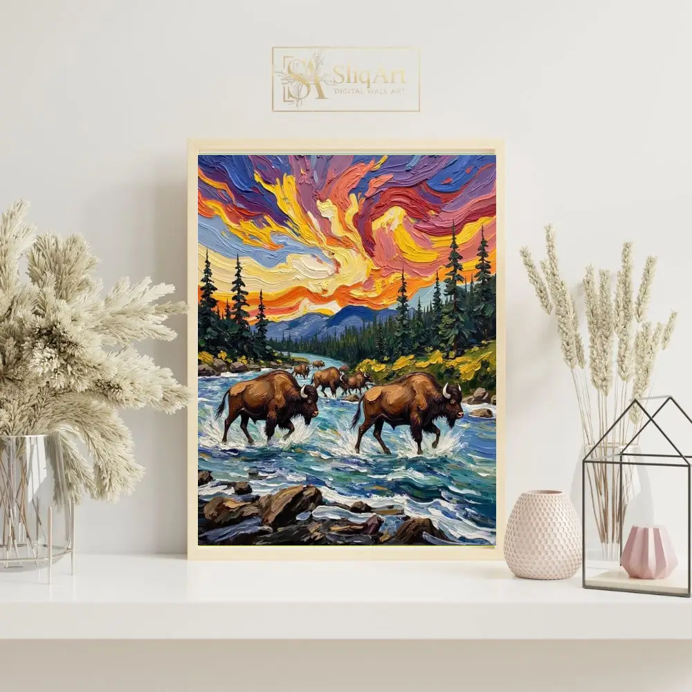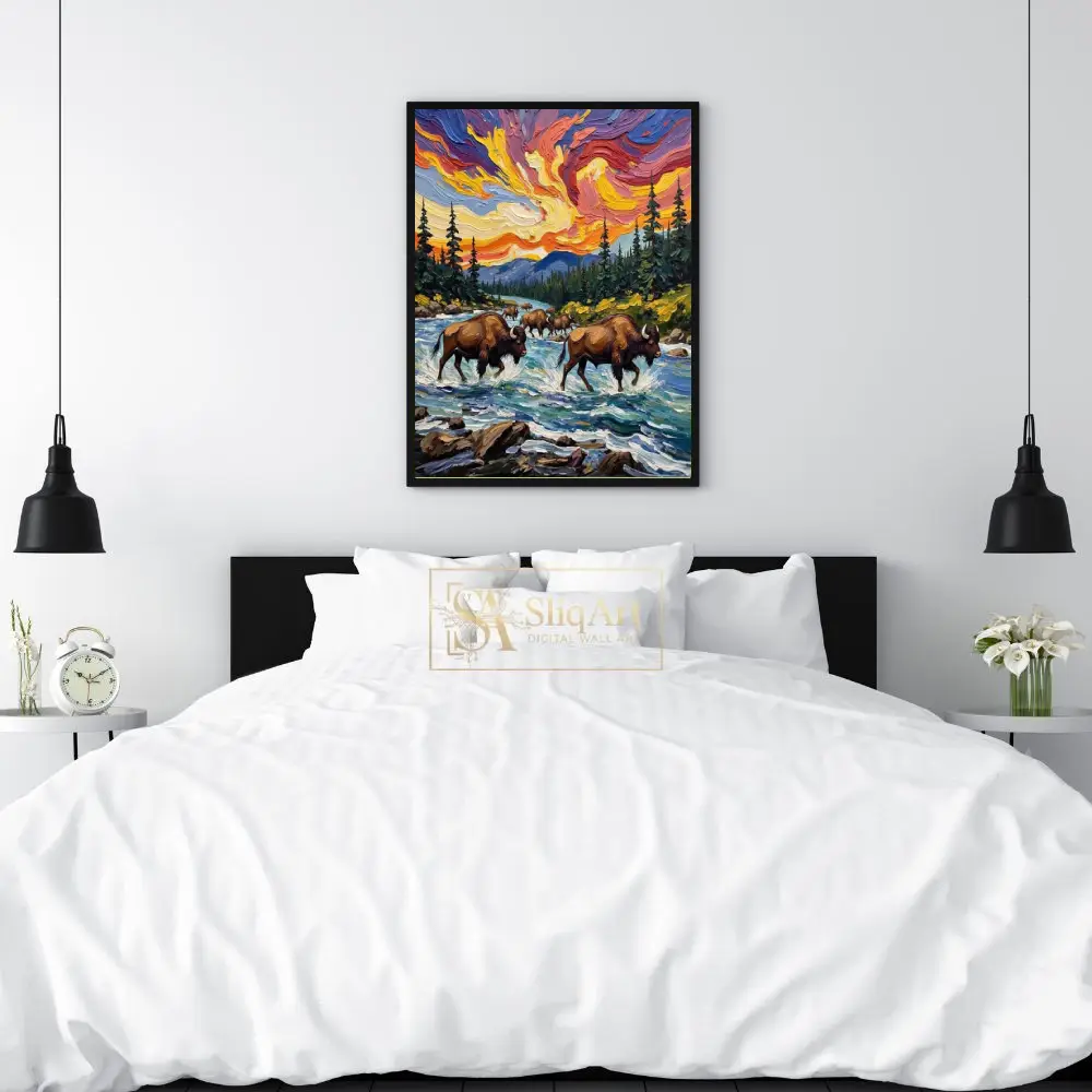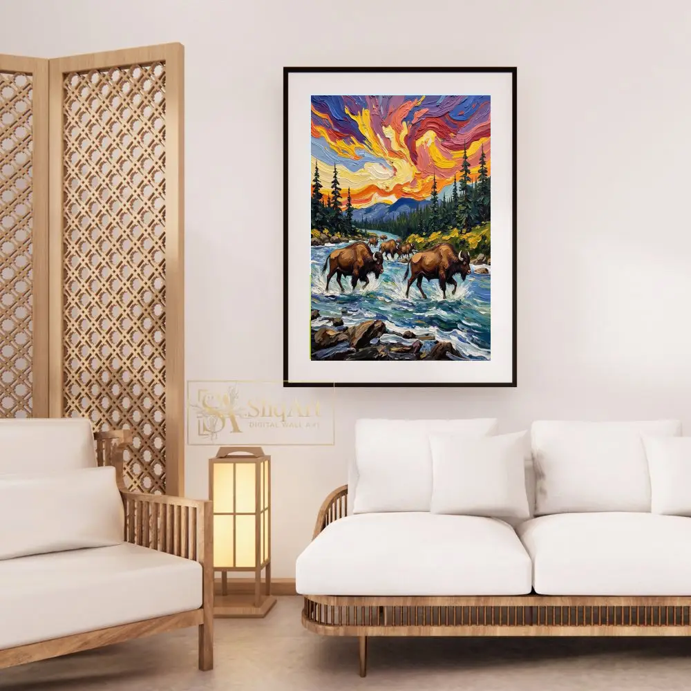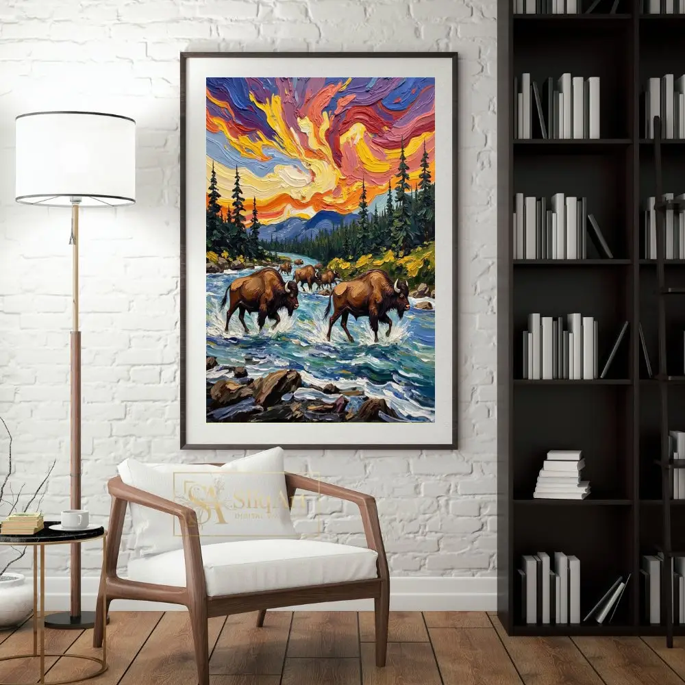 Featuring a herd of majestic bison navigating a rushing river, the piece is brought to life through thick, rhythmic brushstrokes and a celestial sky swirling with vibrant oranges, deep purples, and radiant yellows. This artwork perfectly balances the strength of wildlife with the fluid movement of nature, making it a commanding centerpiece for any rustic or contemporary interior that seeks a touch of the wild.