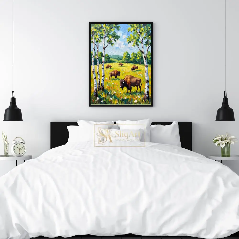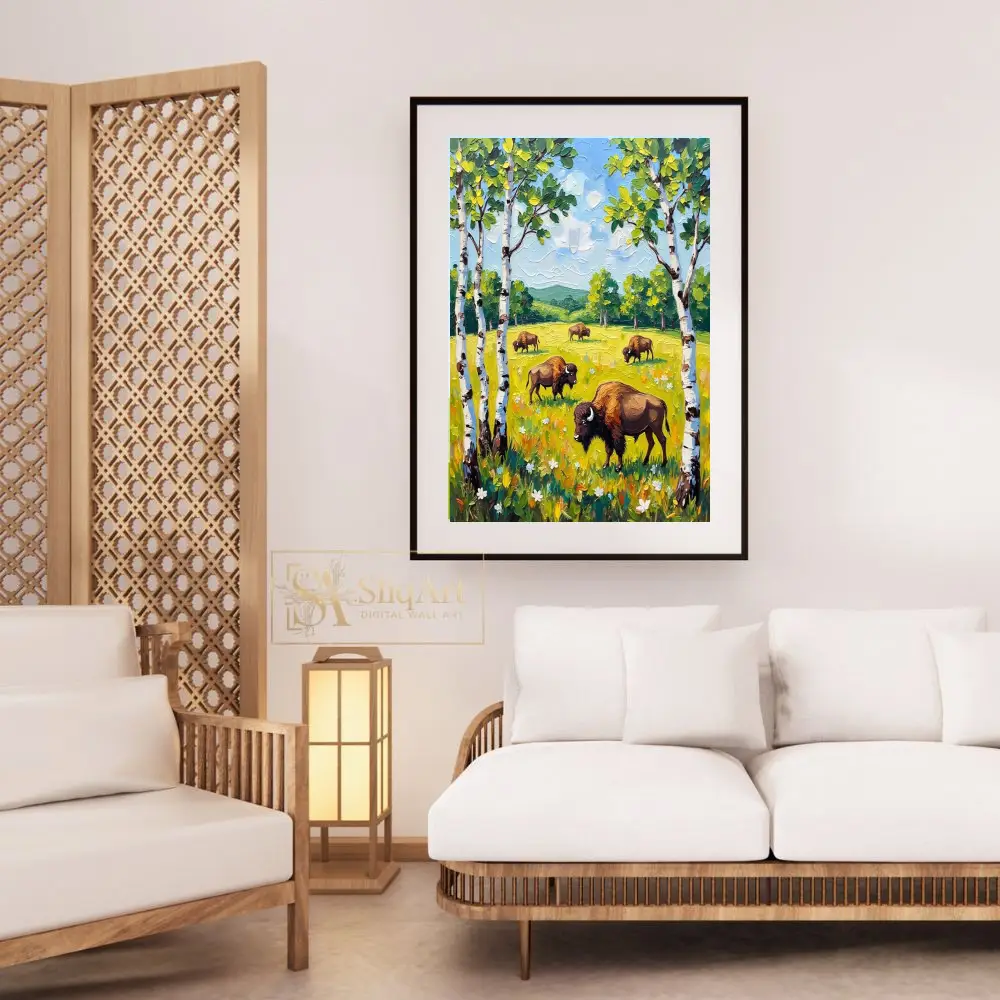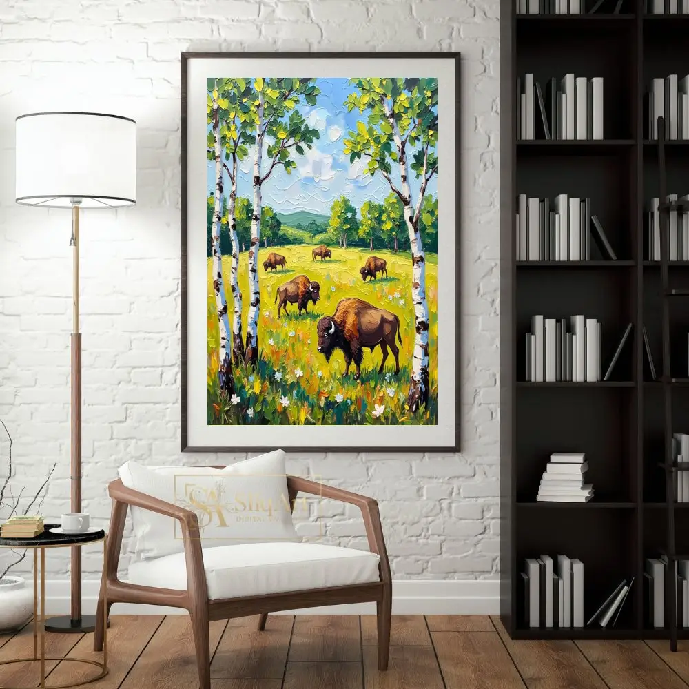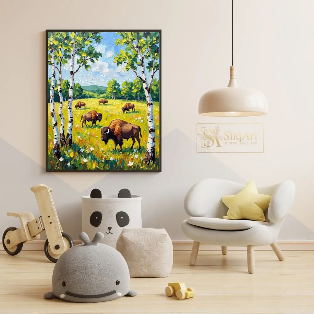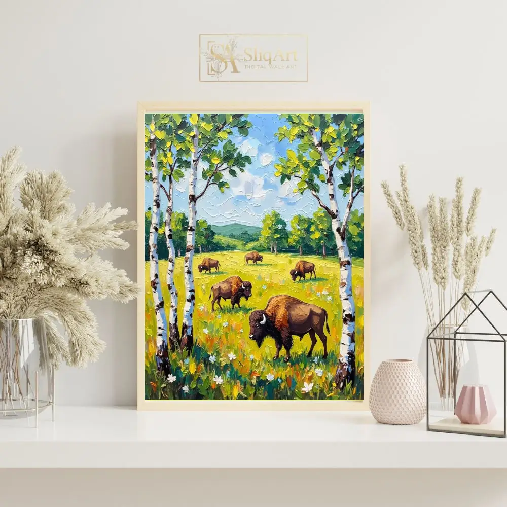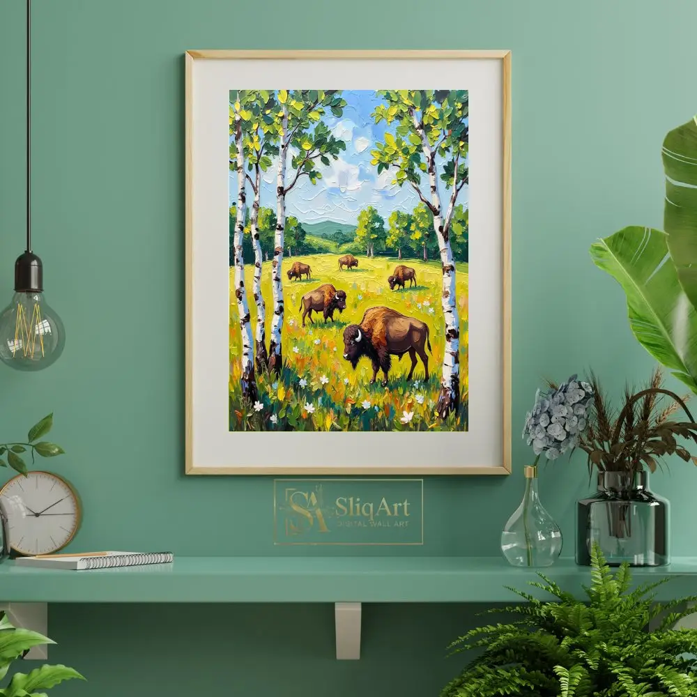 This vibrant impasto painting captures a peaceful herd of bison grazing in a sun-drenched meadow. Framed by elegant white birch trees, the scene unfolds with rolling green hills and a bright, textured sky.