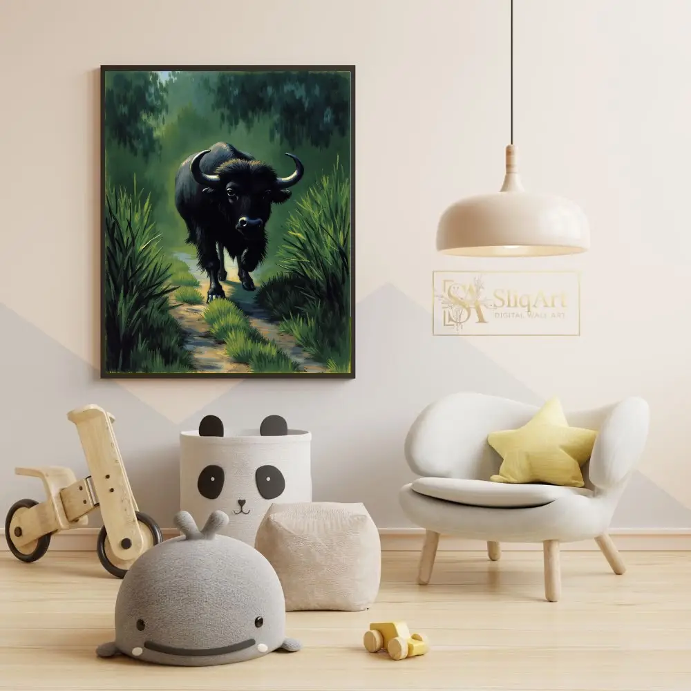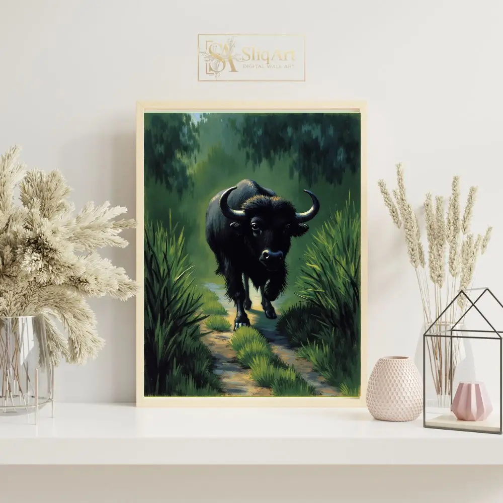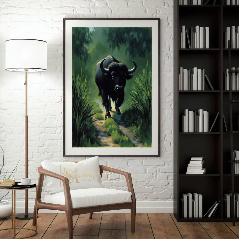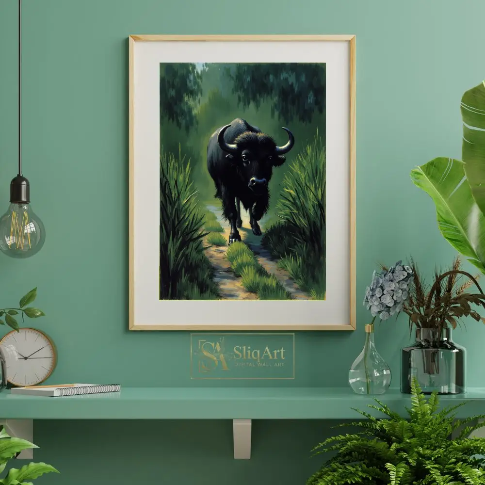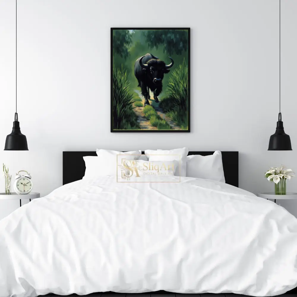 This striking artwork captures the commanding presence of a black buffalo as it moves steadily down a sun-dappled path. Surrounded by high reeds and a misty, deep green forest, the animal’s powerful silhouette is highlighted by textured brushstrokes that bring its fur and horns to life.