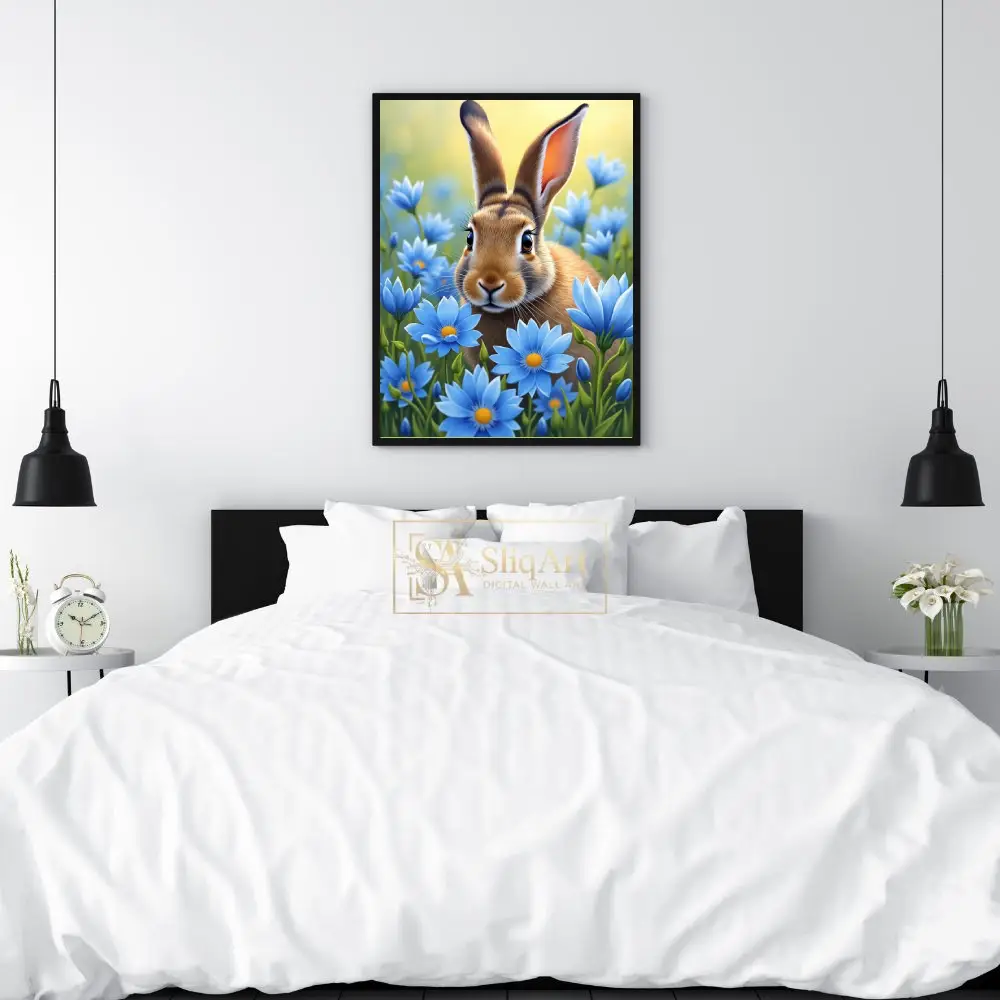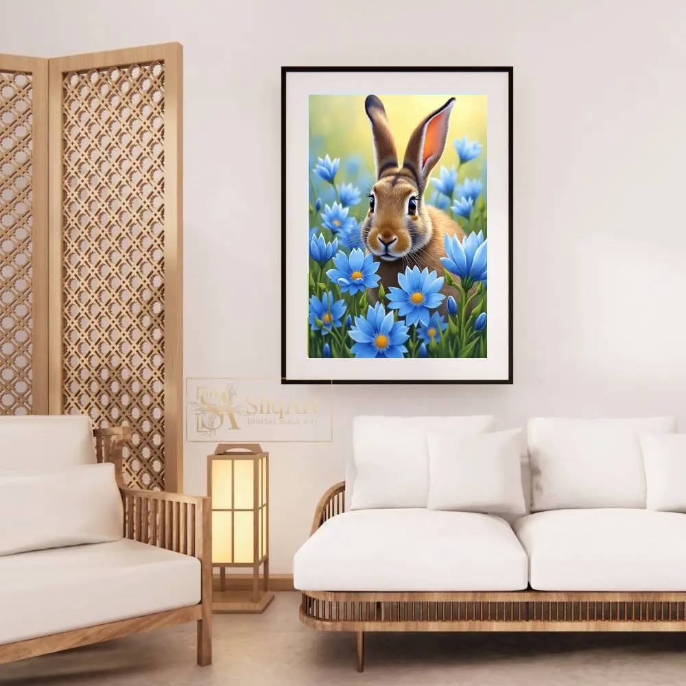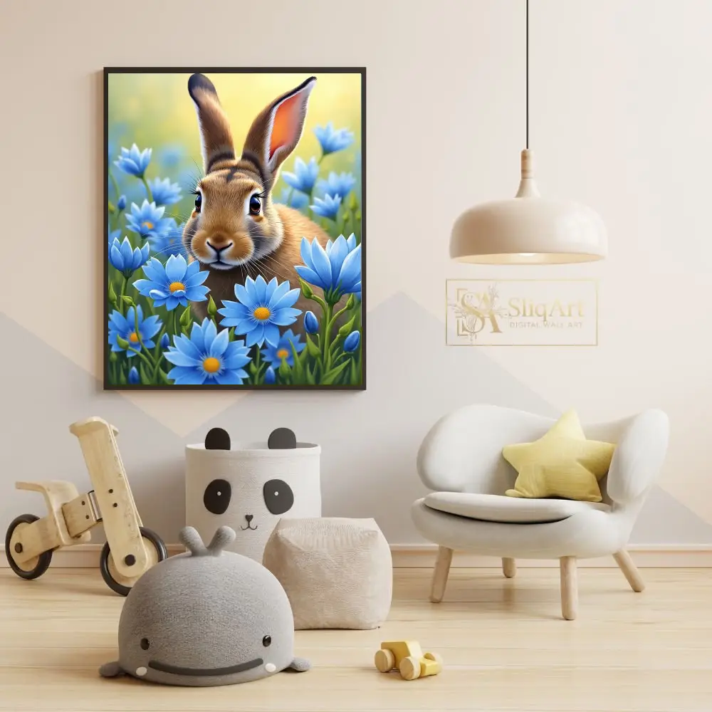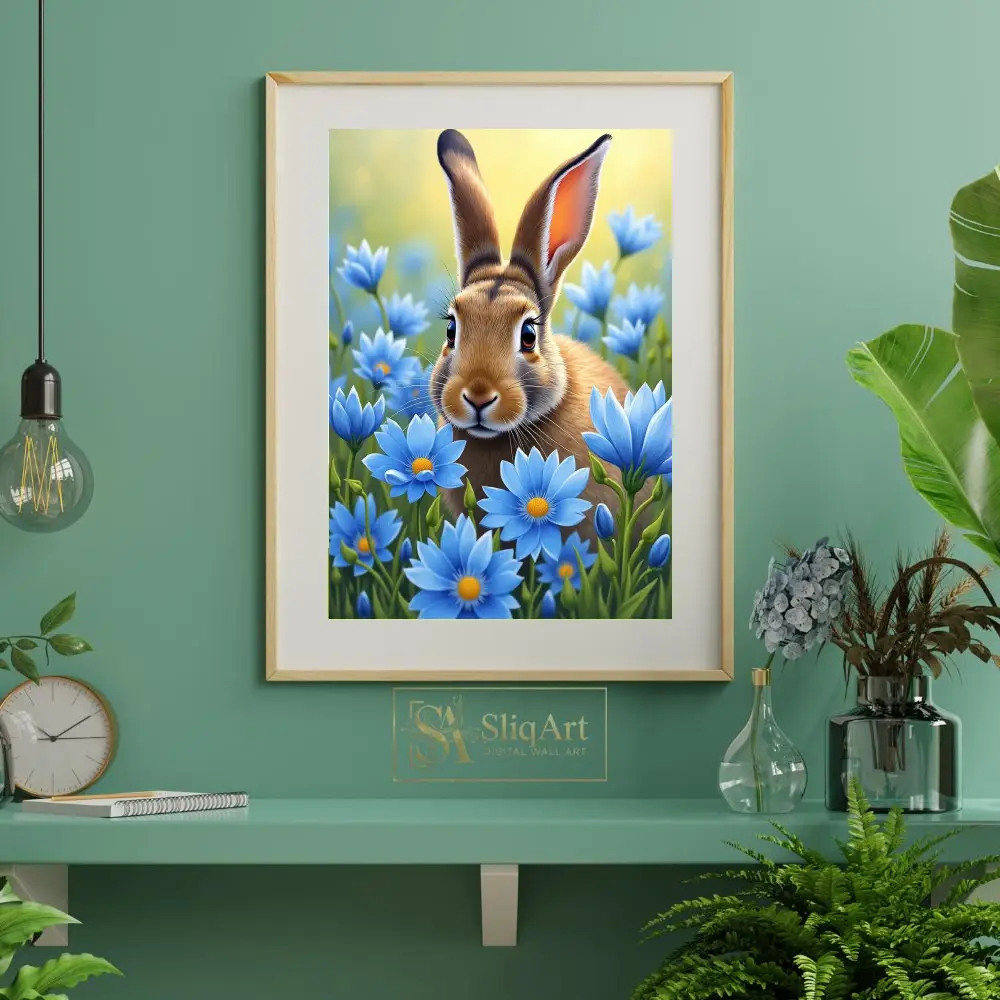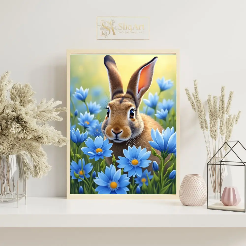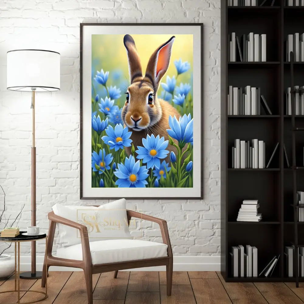 Immerse yourself in the gentle charm of the natural world with this stunning digital painting of a curious brown rabbit. Nestled within a vibrant field of sky-blue daisies, the rabbit’s detailed fur and expressive eyes are brought to life through soft, luminous lighting.