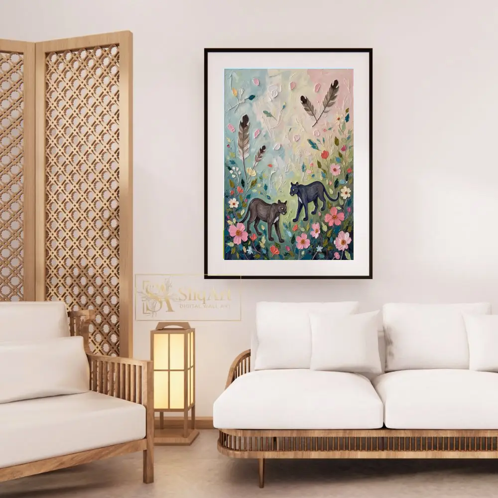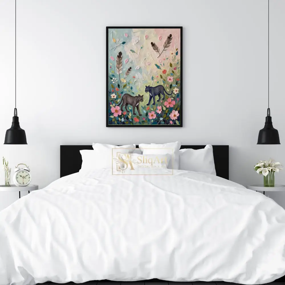 This captivating piece features two sleek black panthers wandering through a dreamy, textured garden filled with blooming pink flowers and drifting feathers. The impasto oil painting technique creates a rich, tactile surface where thick, expressive brushstrokes bring the delicate petals and powerful felines to life.