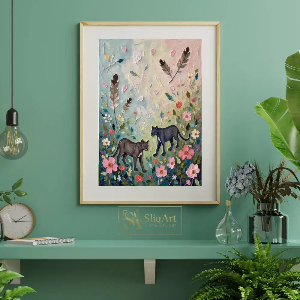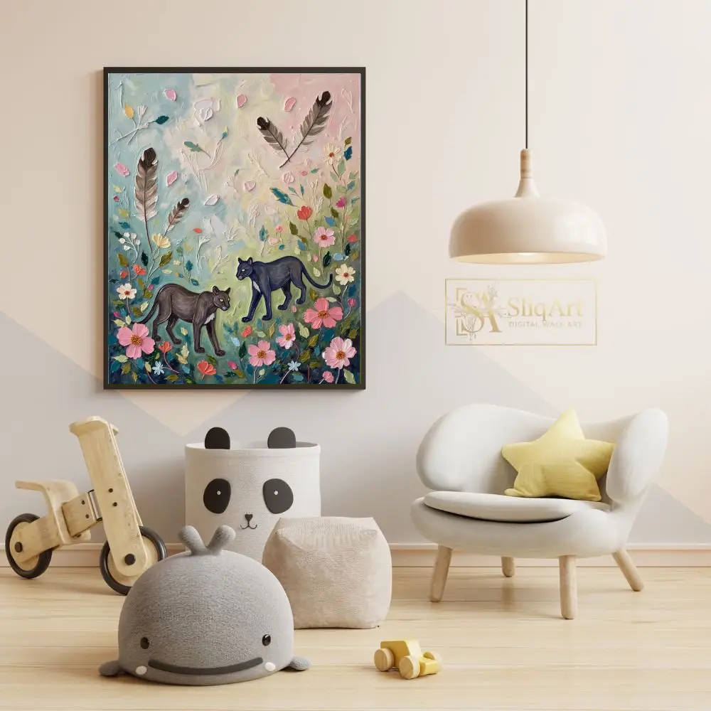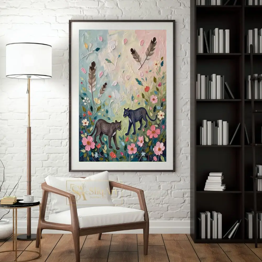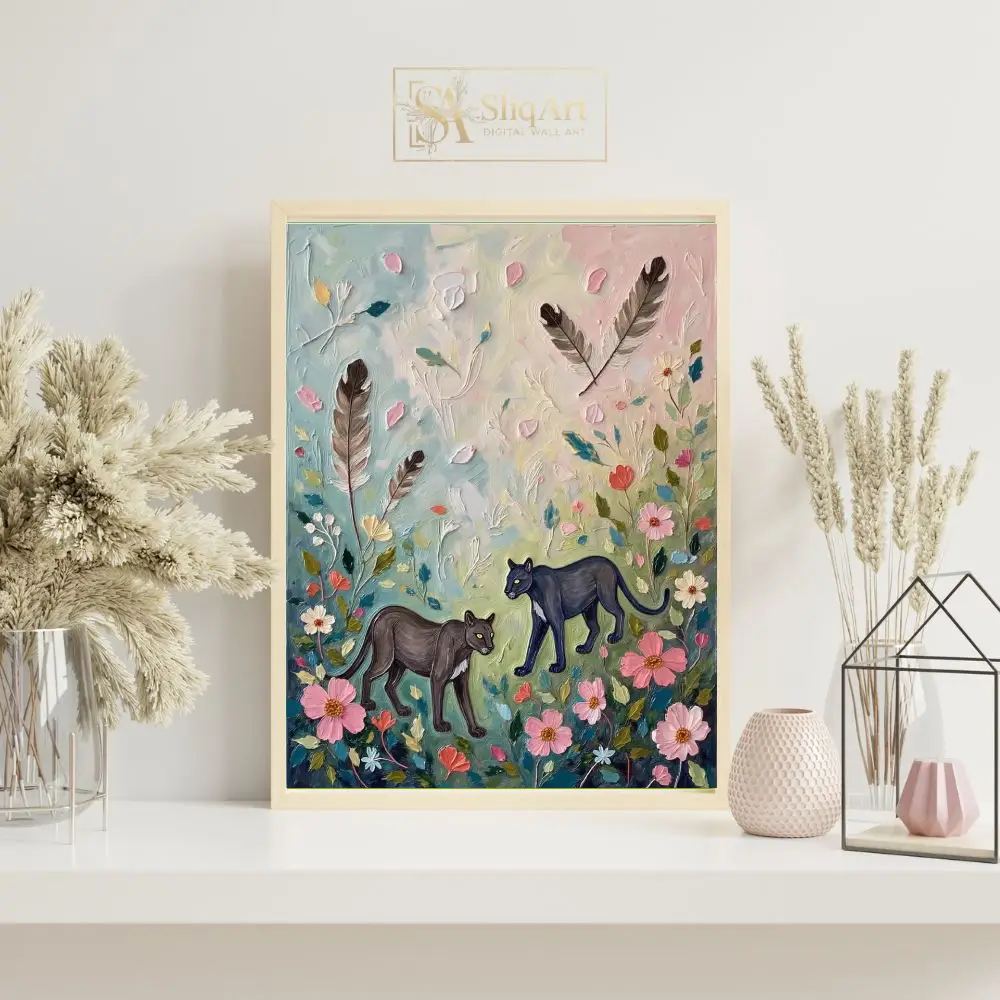 Set against a soft pastel background of sky blue, pale yellow, and blush pink, this artwork beautifully balances the wild strength of the panther with the gentle beauty of nature. The inclusion of floating feathers adds a layer of whimsical mystery, making it a sophisticated yet playful addition to any contemporary space.