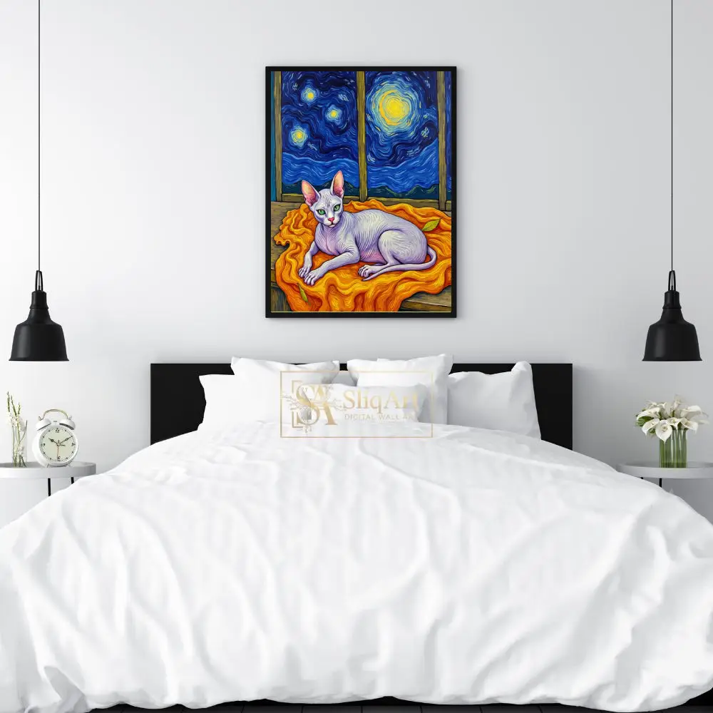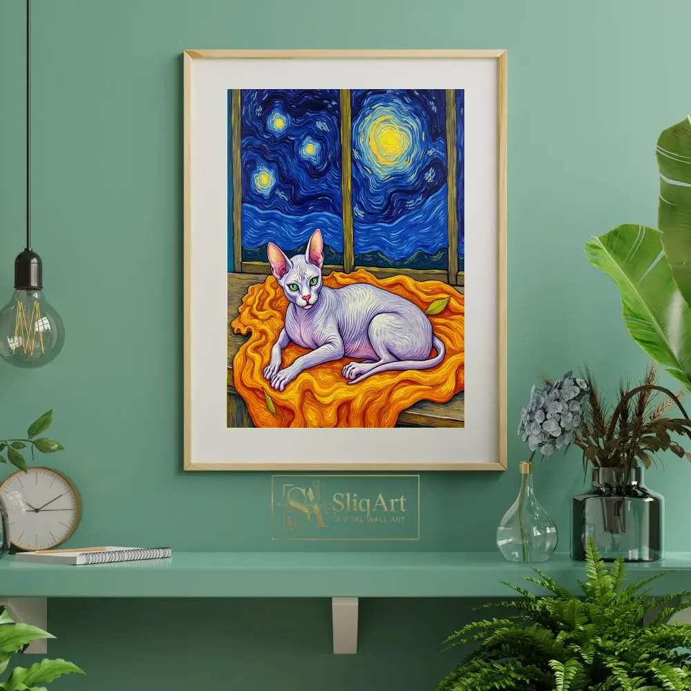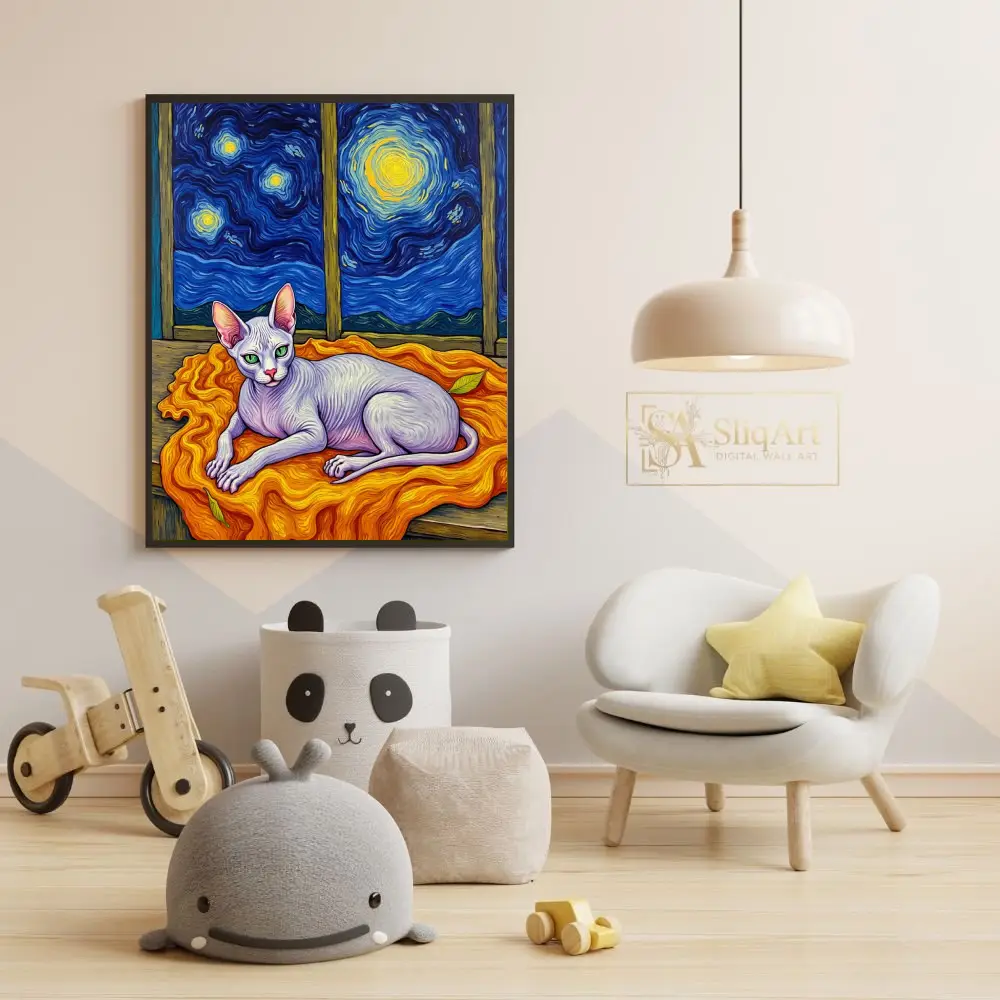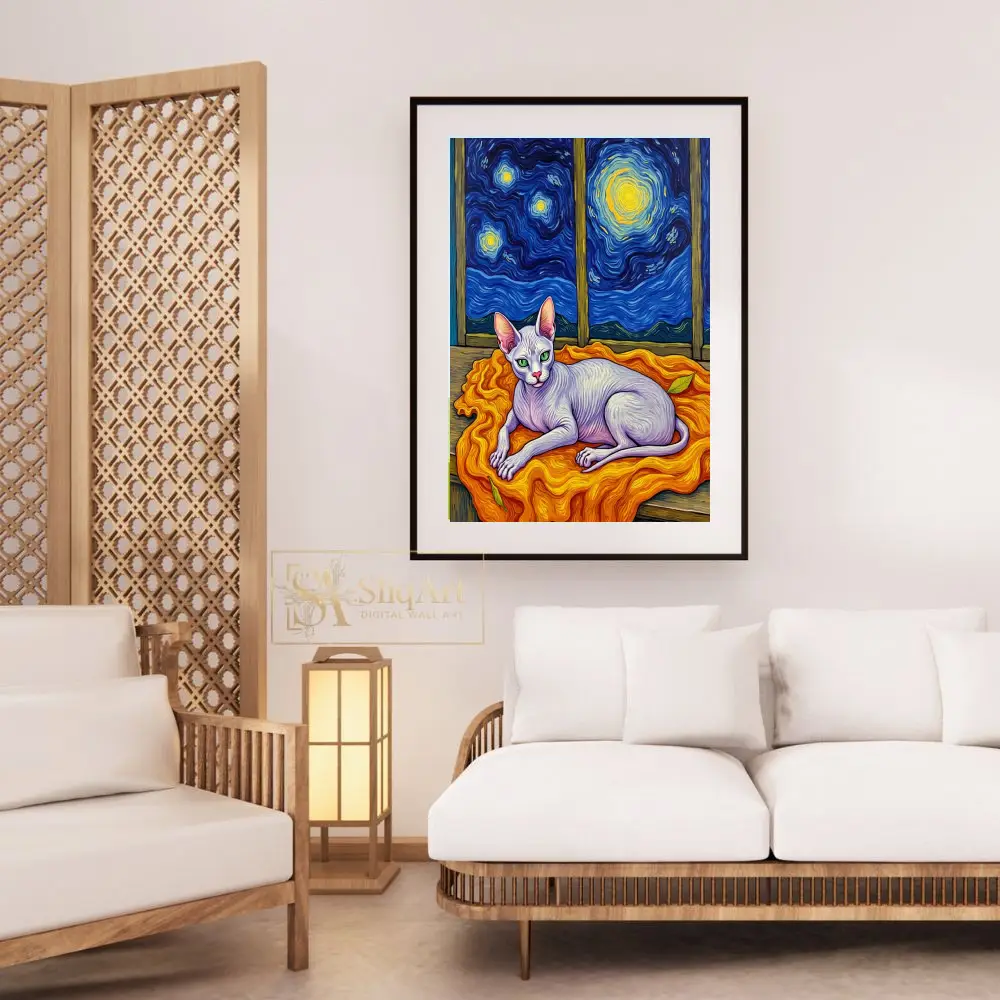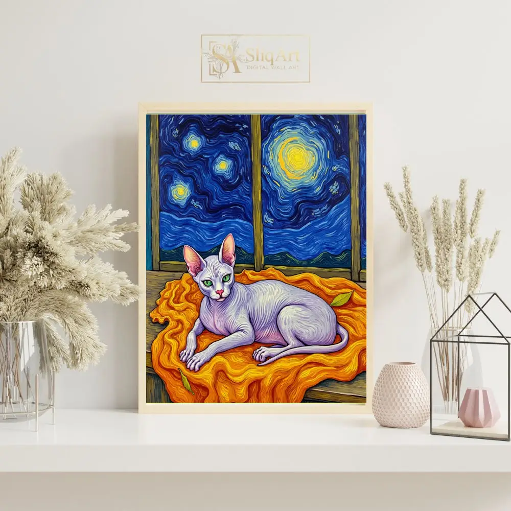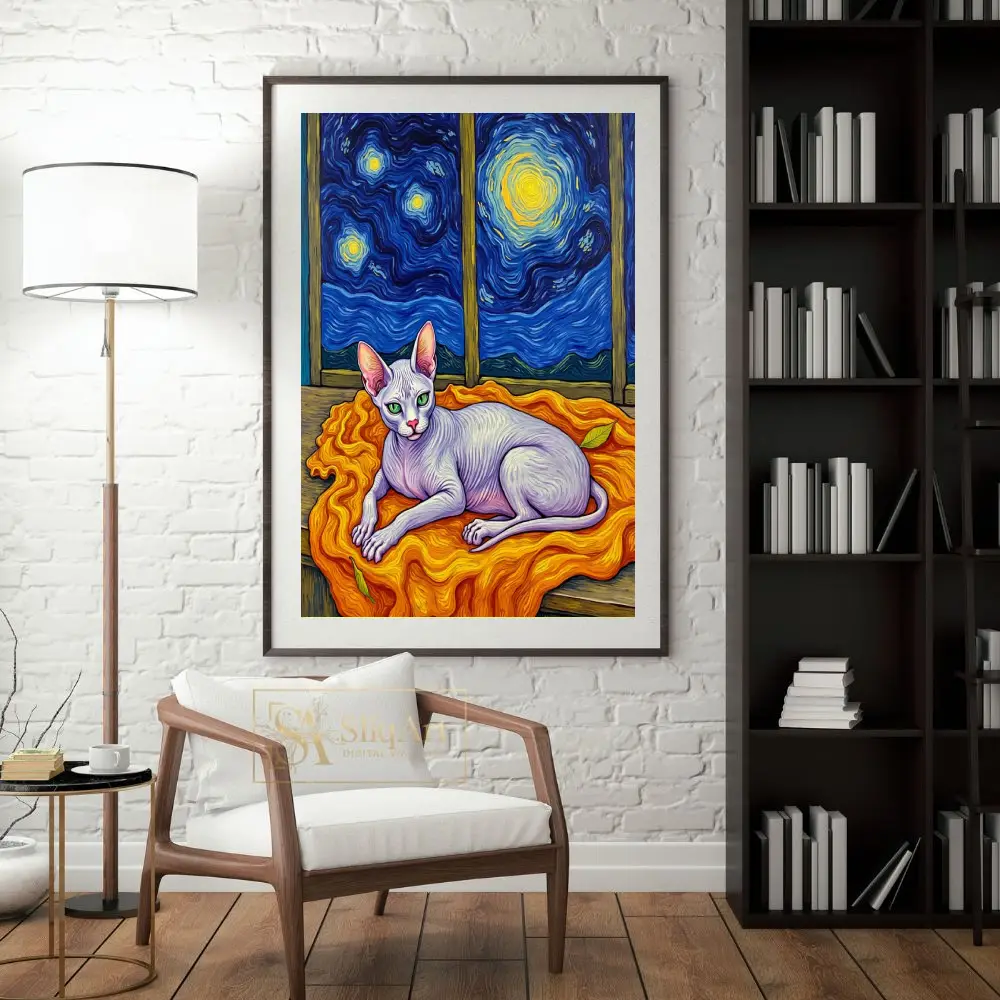 Heavily inspired by Vincent van Gogh’s ‘The Starry Night,’ the background features vibrant cobalt blues and radiant golden yellows rendered in bold, expressive brushstrokes. The contrast between the sleek, pale form of the cat and the dynamic, rhythmic sky creates a captivating focal point that is both modern and timeless.