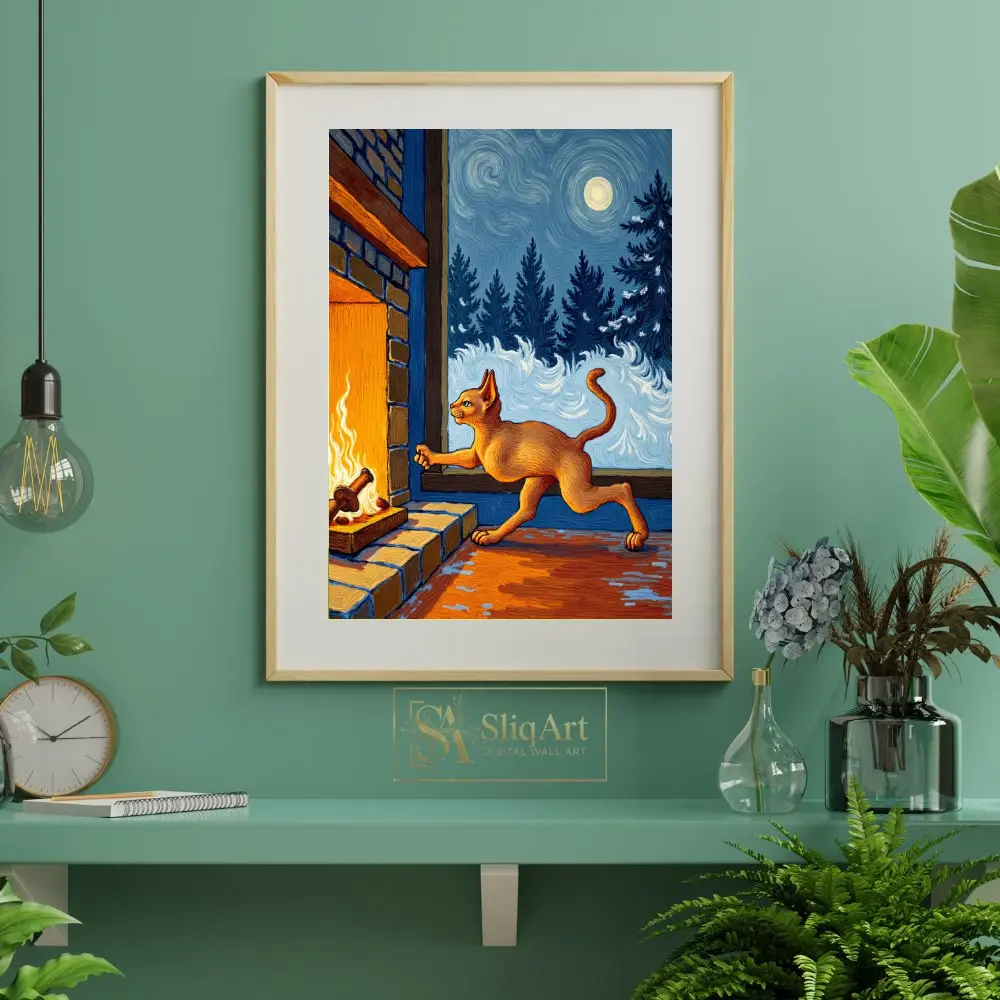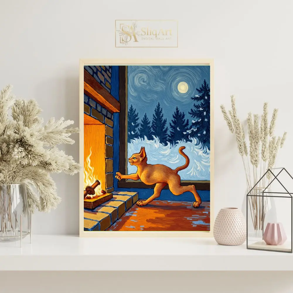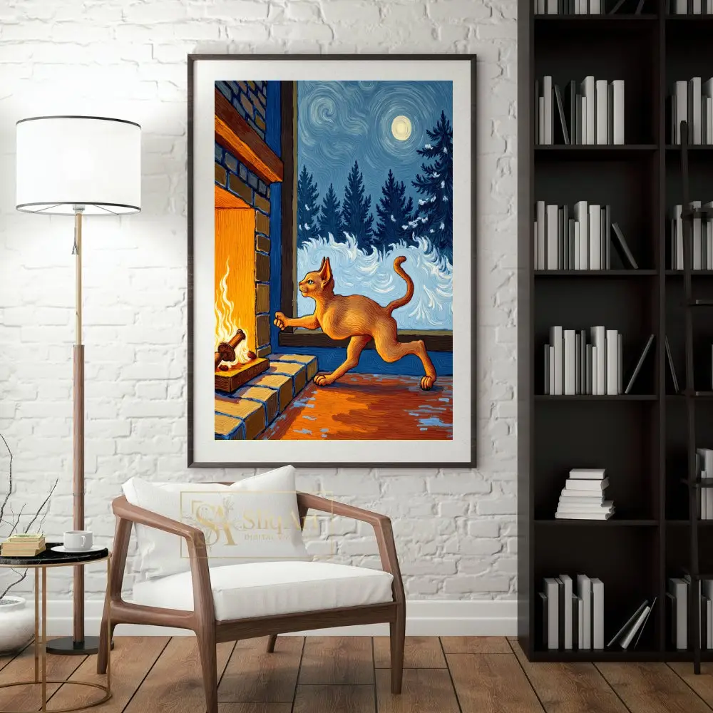Immerse yourself in the cozy warmth of a winter night with this stunning Post-Impressionist masterpiece. Inspired by the iconic swirling brushstrokes of Vincent van Gogh, this artwork features a sleek orange cat reaching toward the amber glow of a crackling fireplace.