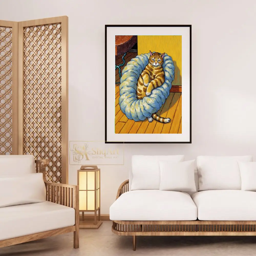 The artwork features a unique, high-detail hatching style that adds a rich tactile quality to the scene. Set against a warm yellow backdrop and golden wood floors, the composition radiates comfort and warmth, making it a delightful addition to any pet lover’s home.
