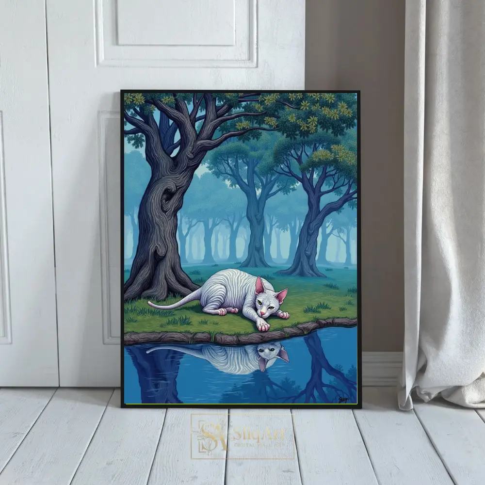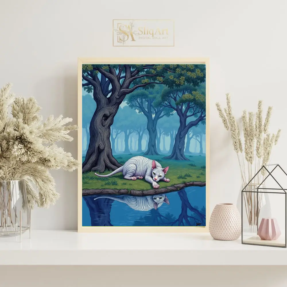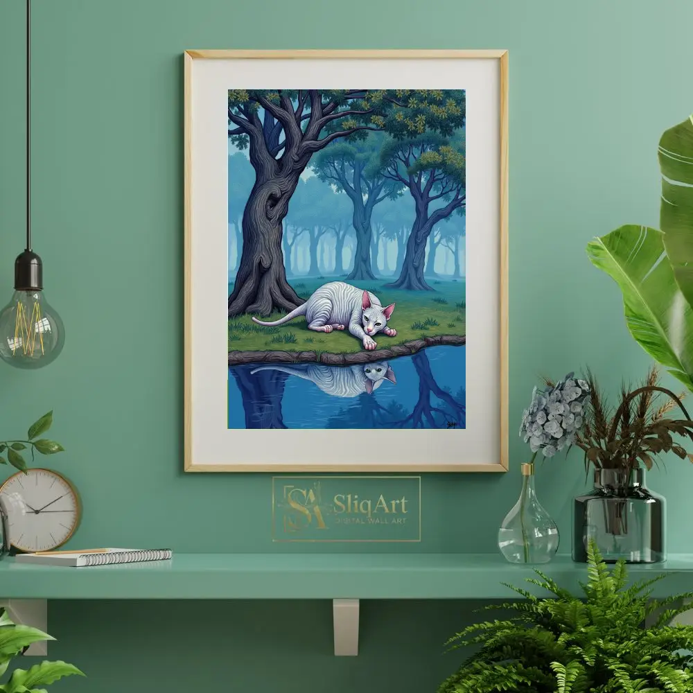Elevate your interior with ‘The Silent Gaze,’ a captivating work of surrealism that transports you to an otherworldly landscape. This piece features a pale, striped Sphynx cat lying gracefully at the edge of a still pond, its reflection perfectly mirrored in the crystalline blue water.