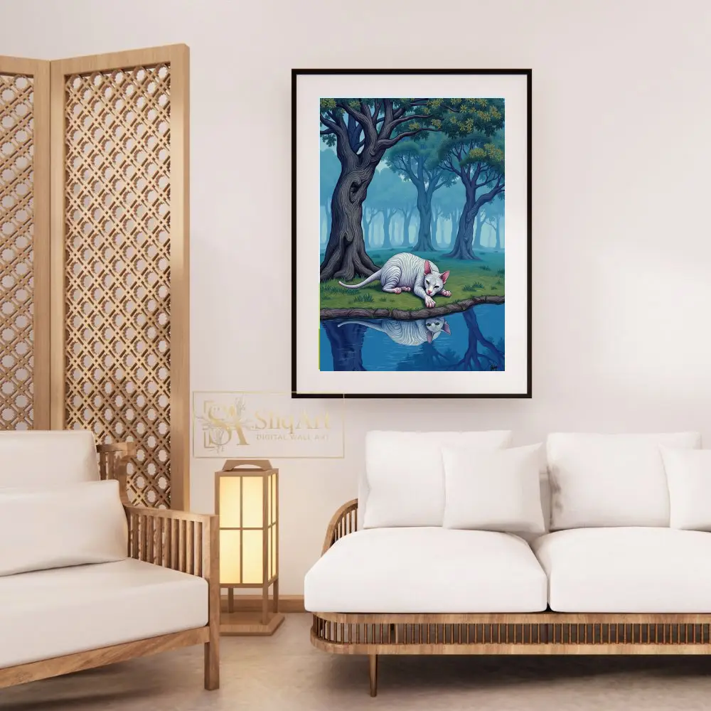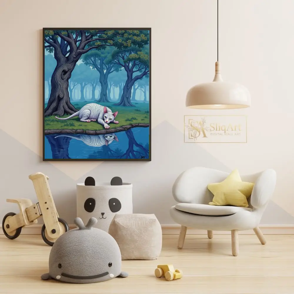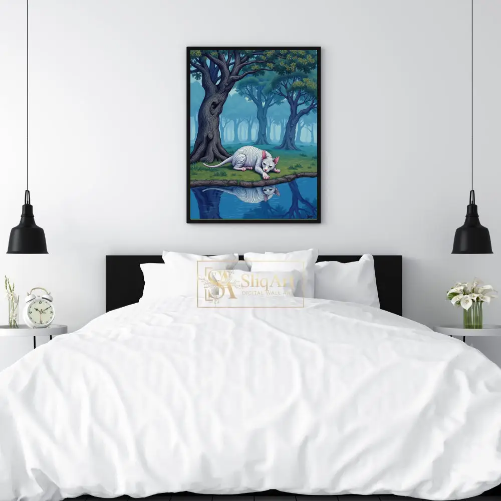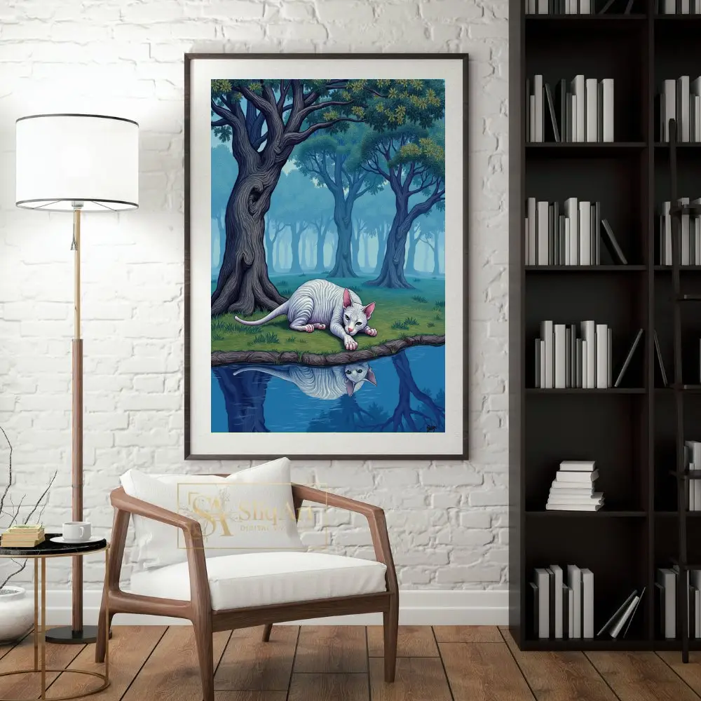 Elevate your interior with ‘The Silent Gaze,’ a captivating work of surrealism that transports you to an otherworldly landscape. This piece features a pale, striped Sphynx cat lying gracefully at the edge of a still pond, its reflection perfectly mirrored in the crystalline blue water.