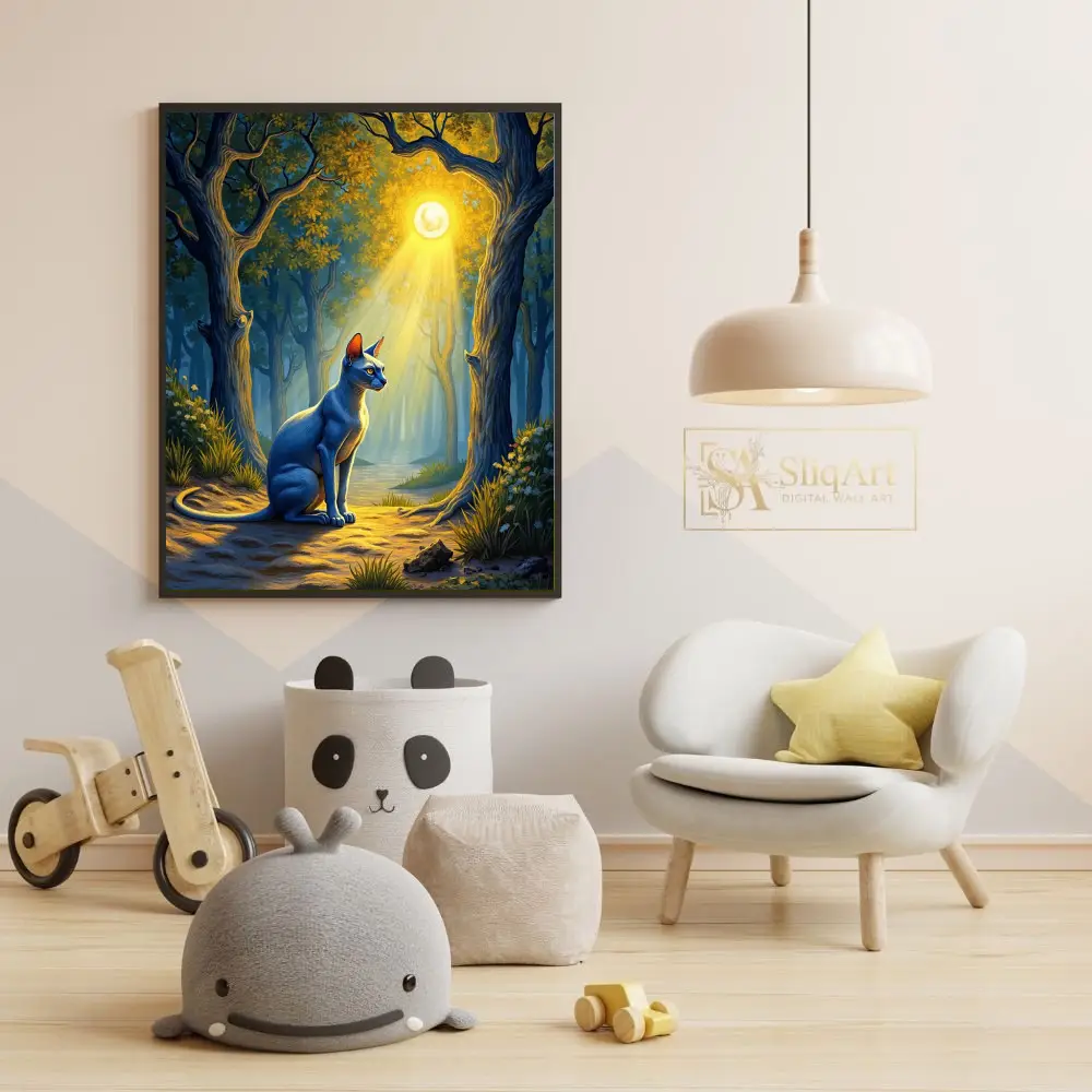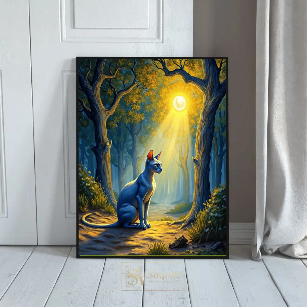 A brilliant celestial body shines through the canopy, casting radiant golden rays that illuminate the cat and the intricate textures of the surrounding ancient trees. The striking contrast between the deep midnight blues and the vibrant sunburst yellows creates a captivating visual harmony, perfect for those who love whimsical nature and feline grace.