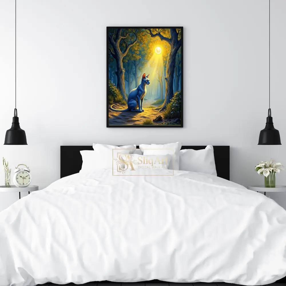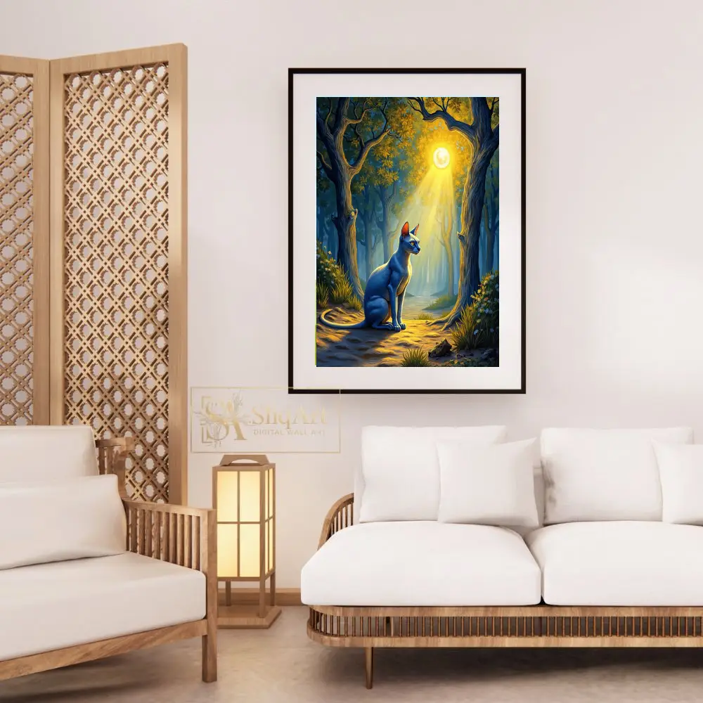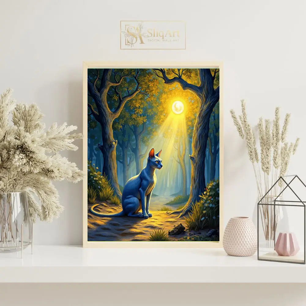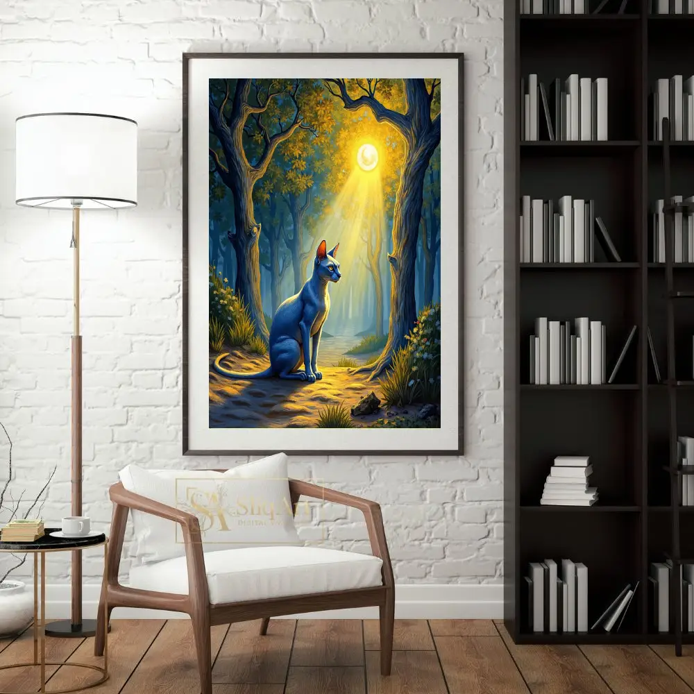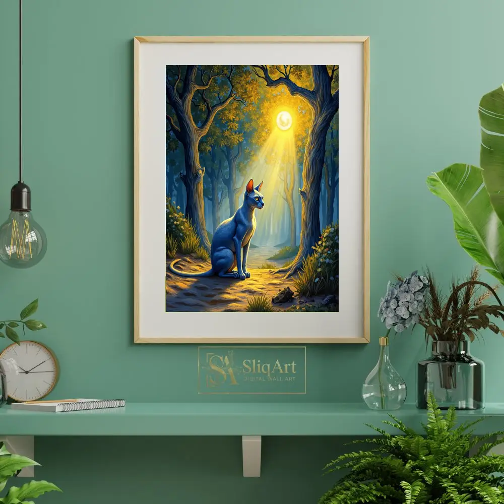Immerse yourself in a world of magic and serenity with this ‘Mystical Blue Cat’ illustration. The artwork depicts a sleek, blue-coated feline sitting peacefully in a sun-drenched forest clearing.