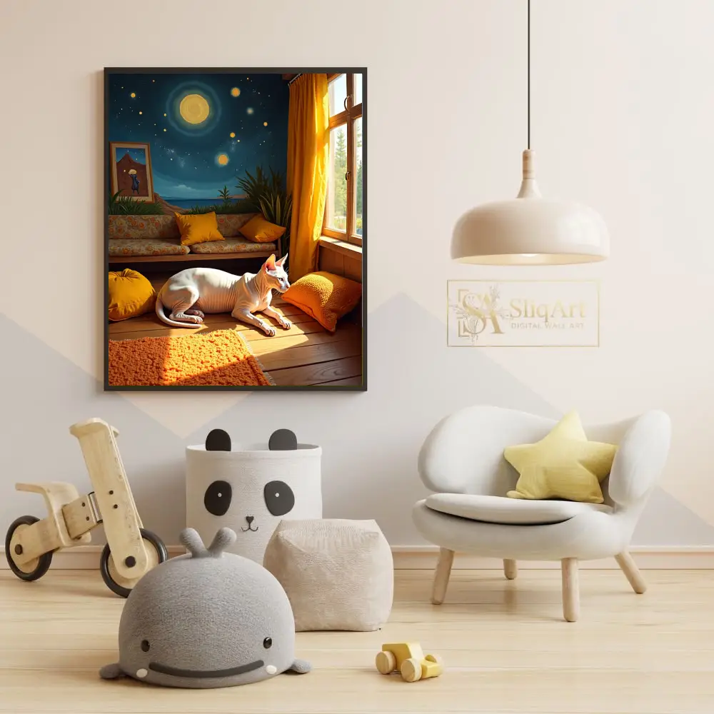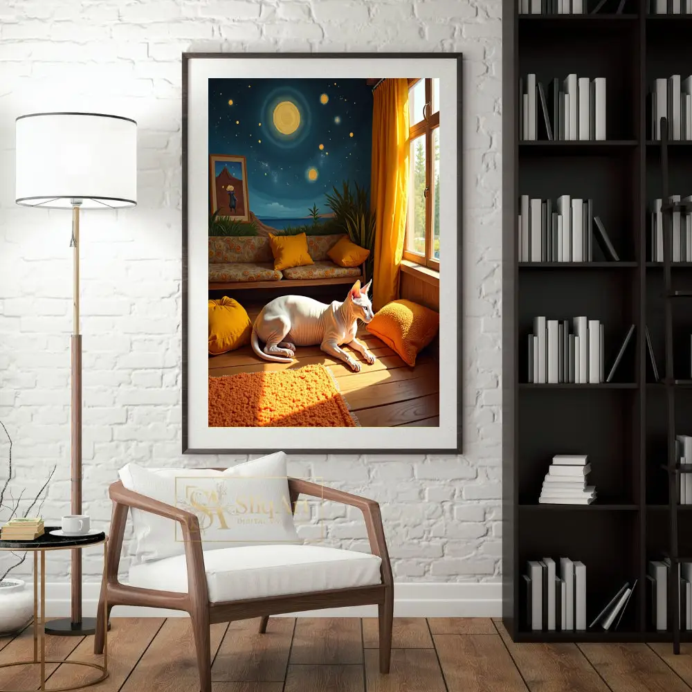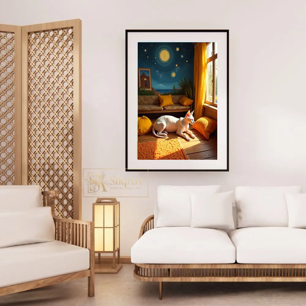 A whimsical and artistic print showcasing a Sphynx cat in a vibrant room with a celestial mural backdrop.
